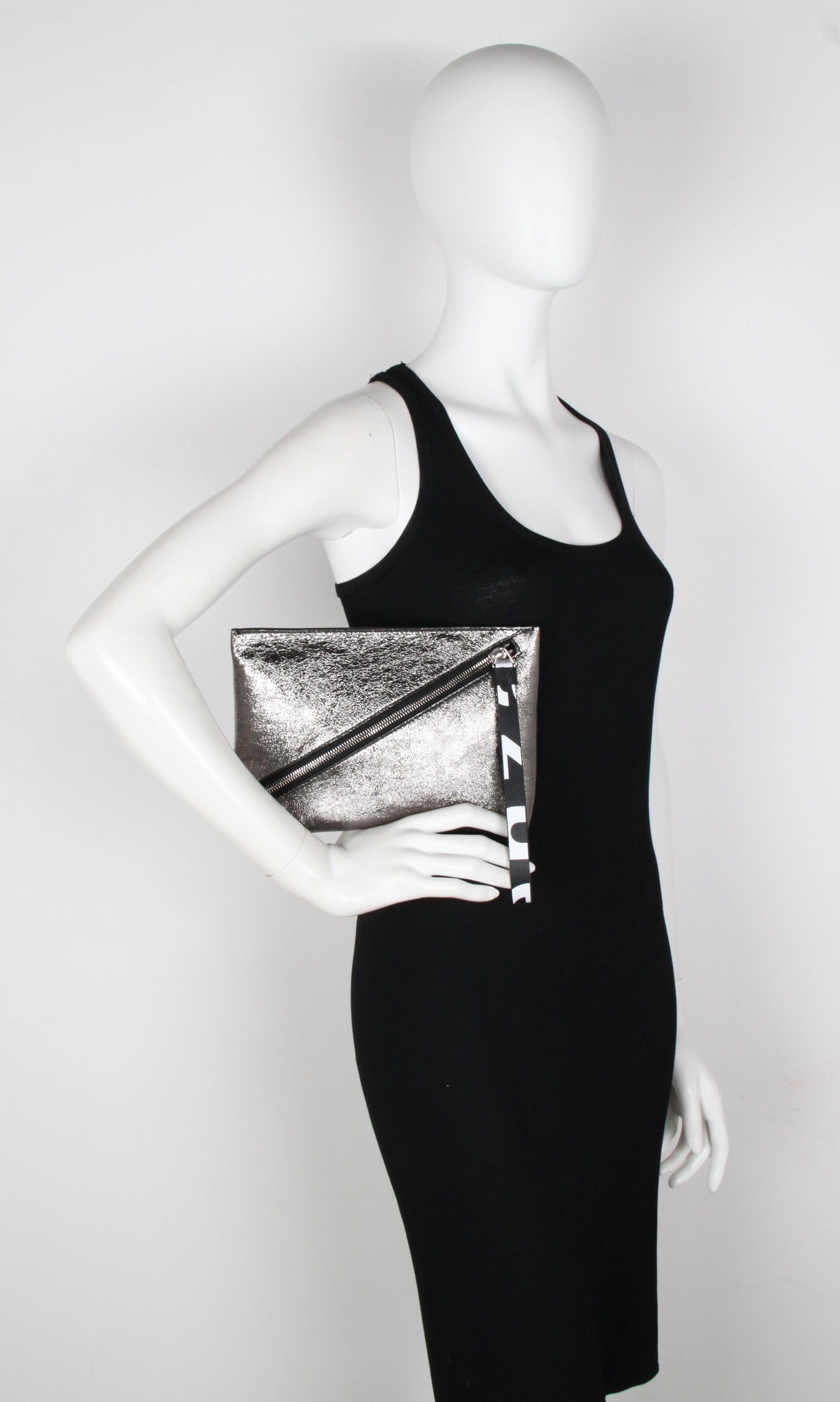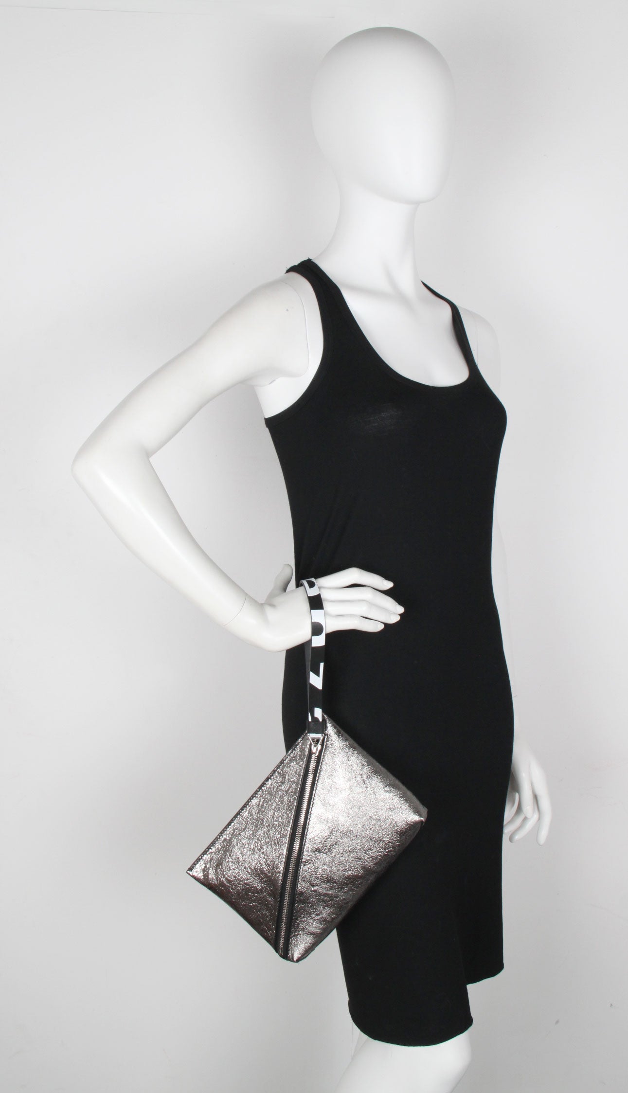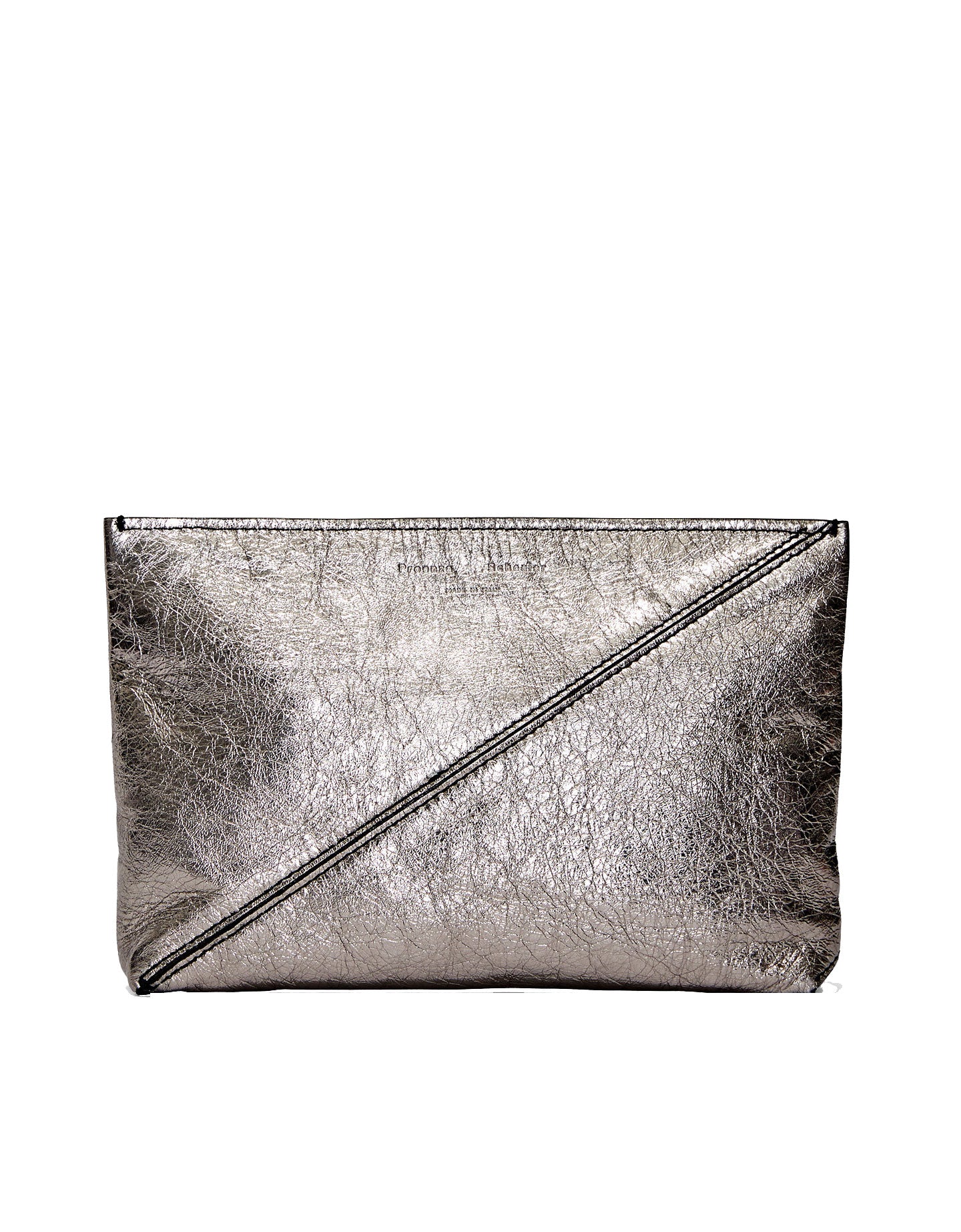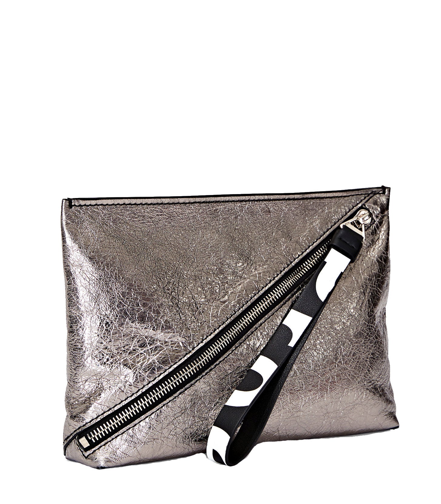 Crafted from metallic leather, the pouch is secured by a diagonal zip and connected pull strap featuring an exaggerated version of the signature Proenza Schouler logo alongside metallic hardware.