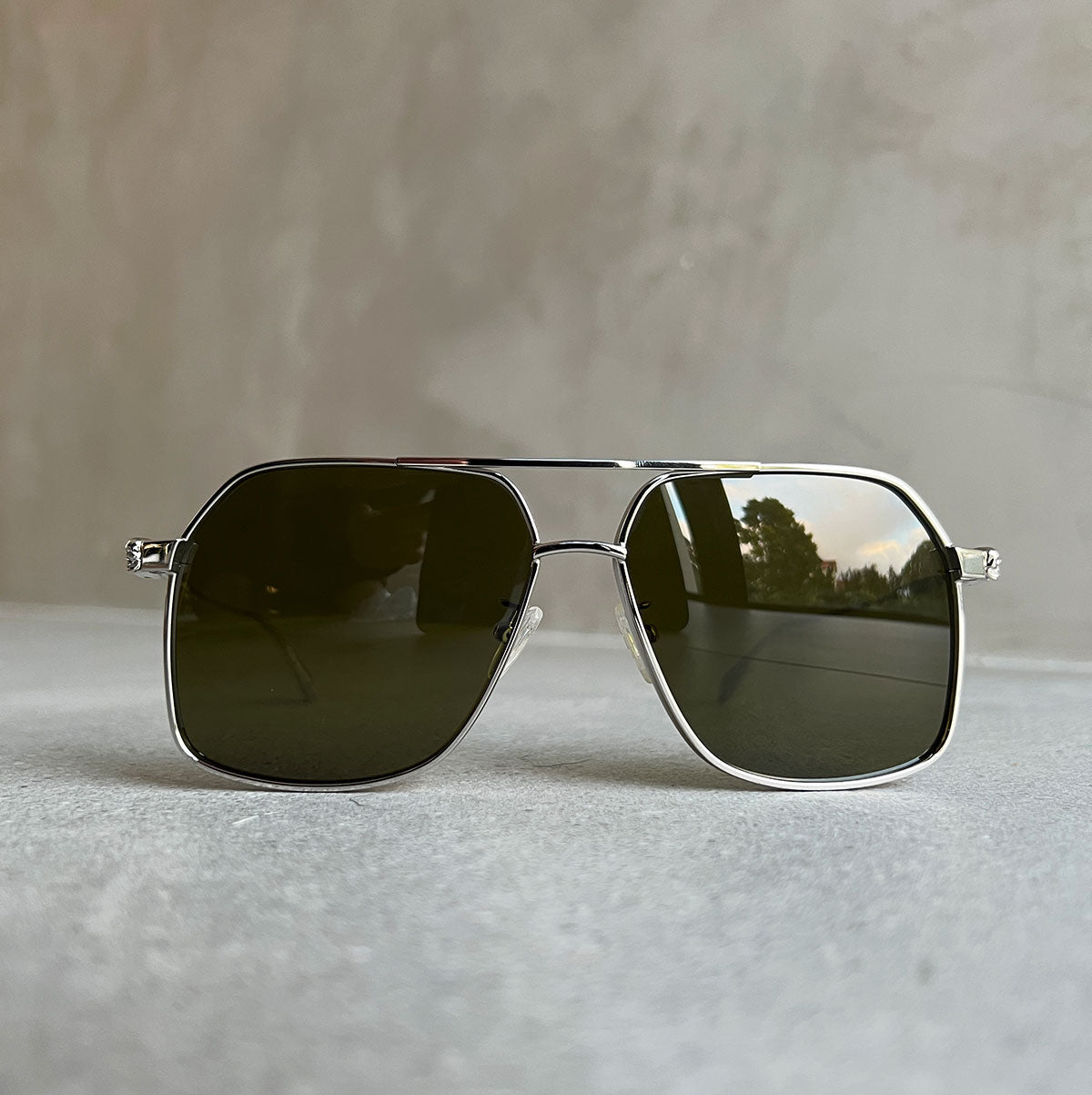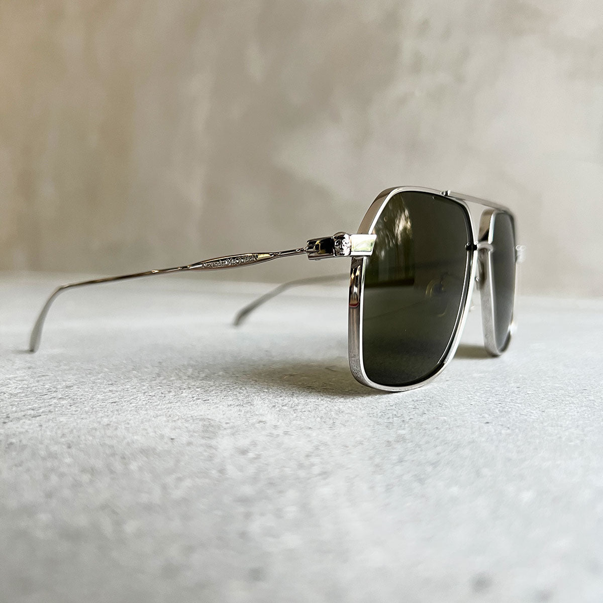 Shiny silver metal Caravan sunglasses fitted with military green lenses. The style features a 3D skull embedded in the end piece and a bone-like detail on the temples, which are finished with a lasered Alexander McQueen signature.