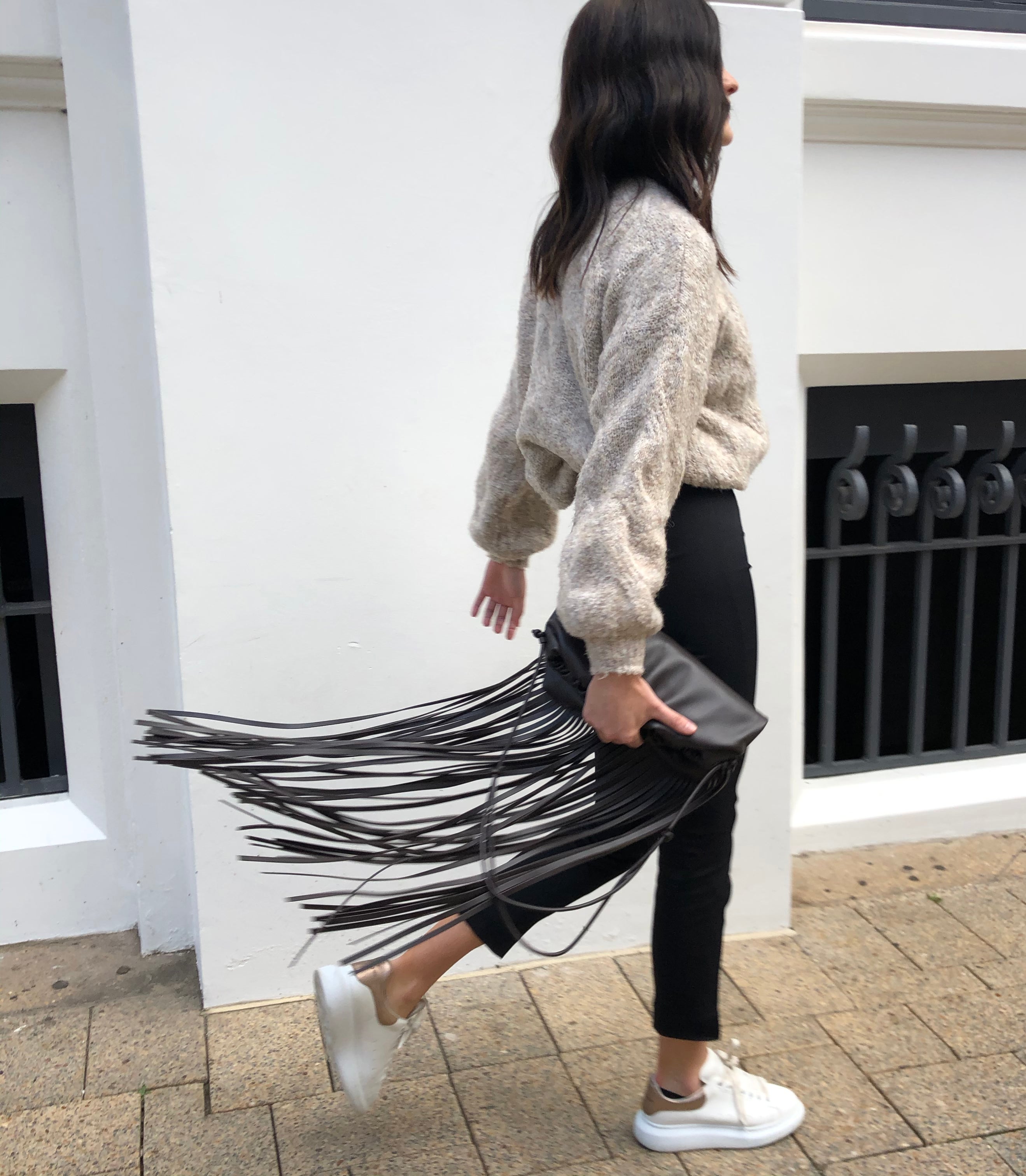 A fringed pouch bag with an adjustable knotted leather strap and frame closure.
