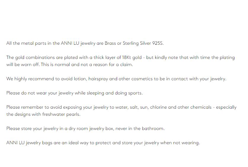 The gold combinations are plated with a thick layer of 18Kt gold - but kindly note that with time the plating will be worn off. This is normal and not a reason for a claim. We highly recommend to avoid lotion, hairspray and other cosmetics to be in contact with your jewelry. Please do not wear your jewelry while sleeping and doing sports. Please remember to avoid exposing your jewelry to water, salt, sun, chlorine and other chemicals - especially the designs with freshwater pearls. Please store your jewelry in a dry room jewelry box, never in the bathroom.
