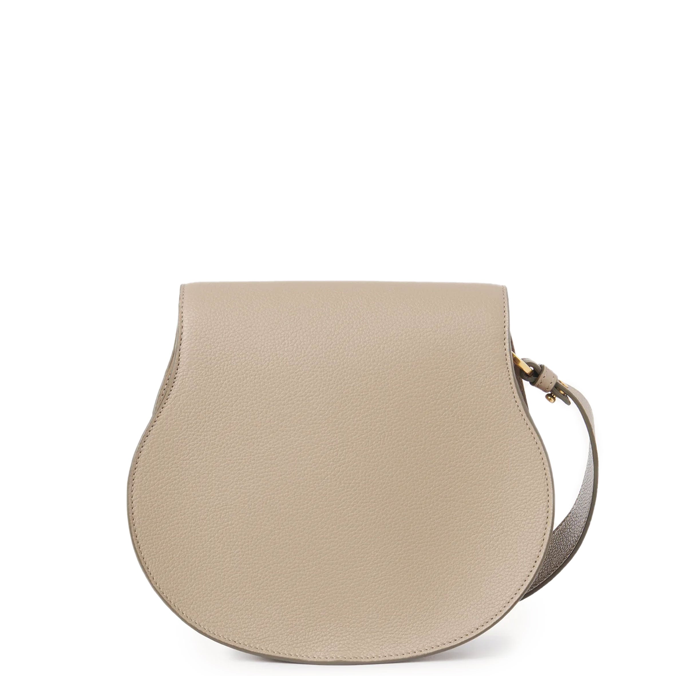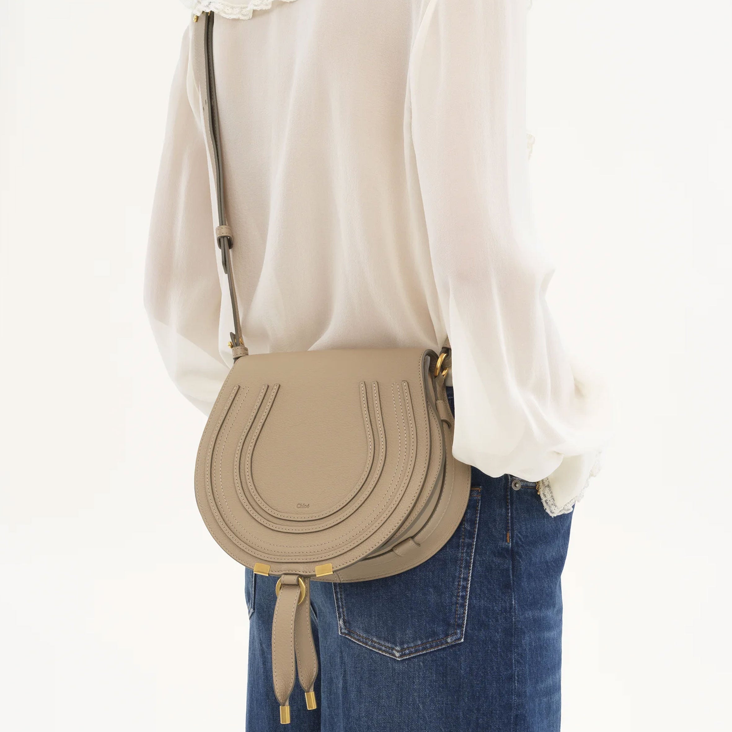 This Marcie saddle bag is crafted from grained calfskin with a rounded silhouette and a clean top-line. The flap features the line's iconic saddle stitching, secured with signature dangling leather tassels.