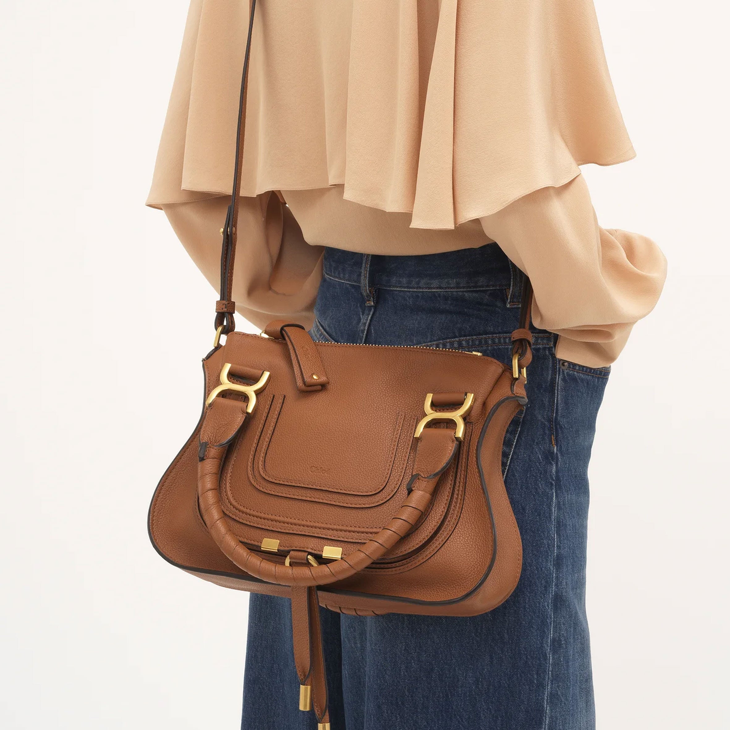 Decorative saddle stitches on the front flap tie in with the brass studs along the curved edges for an equestrian influence. The X-shaped buckles bring a feminine, refined touch. Double leather wrapped-handles and a long shoulder strap mean you can carry Marcie any which way: long shoulder, cross body or by hand.
