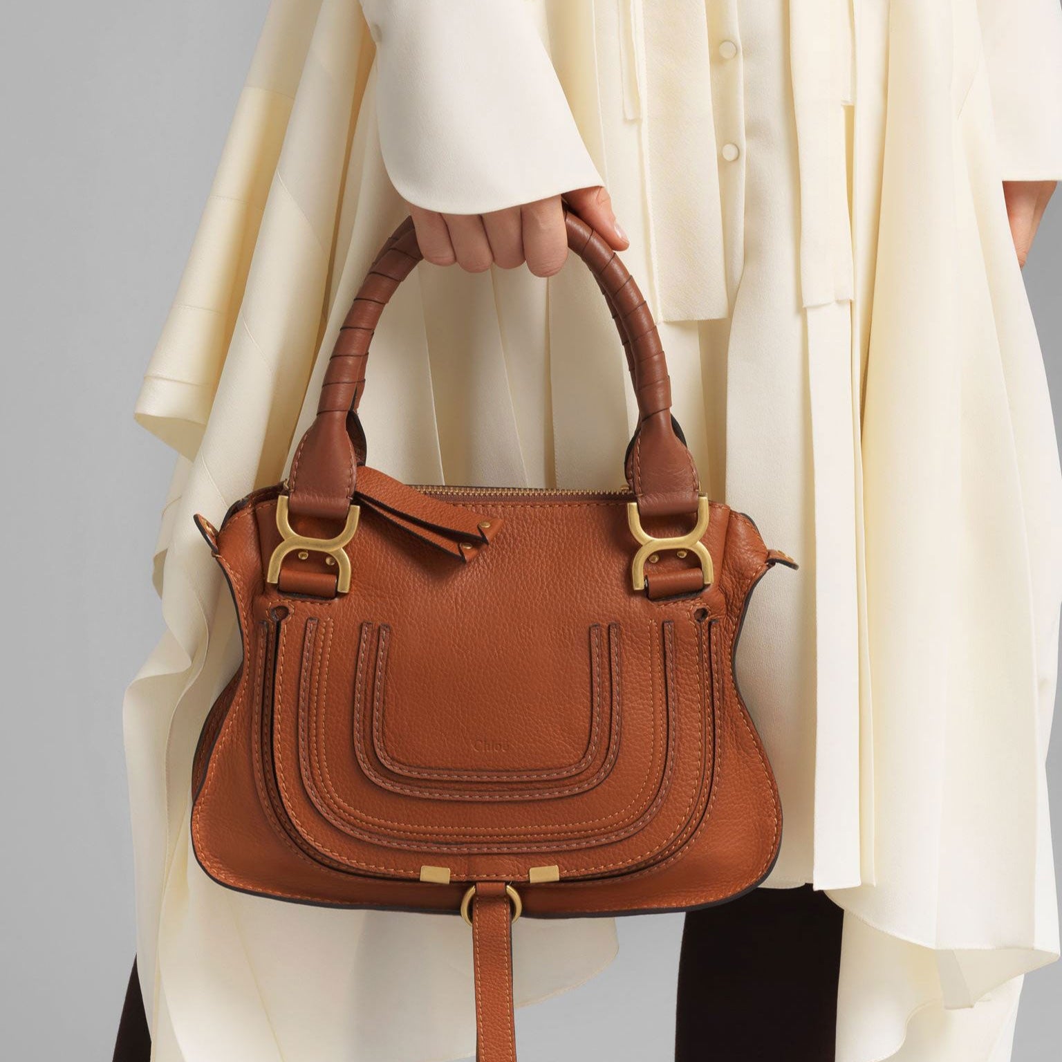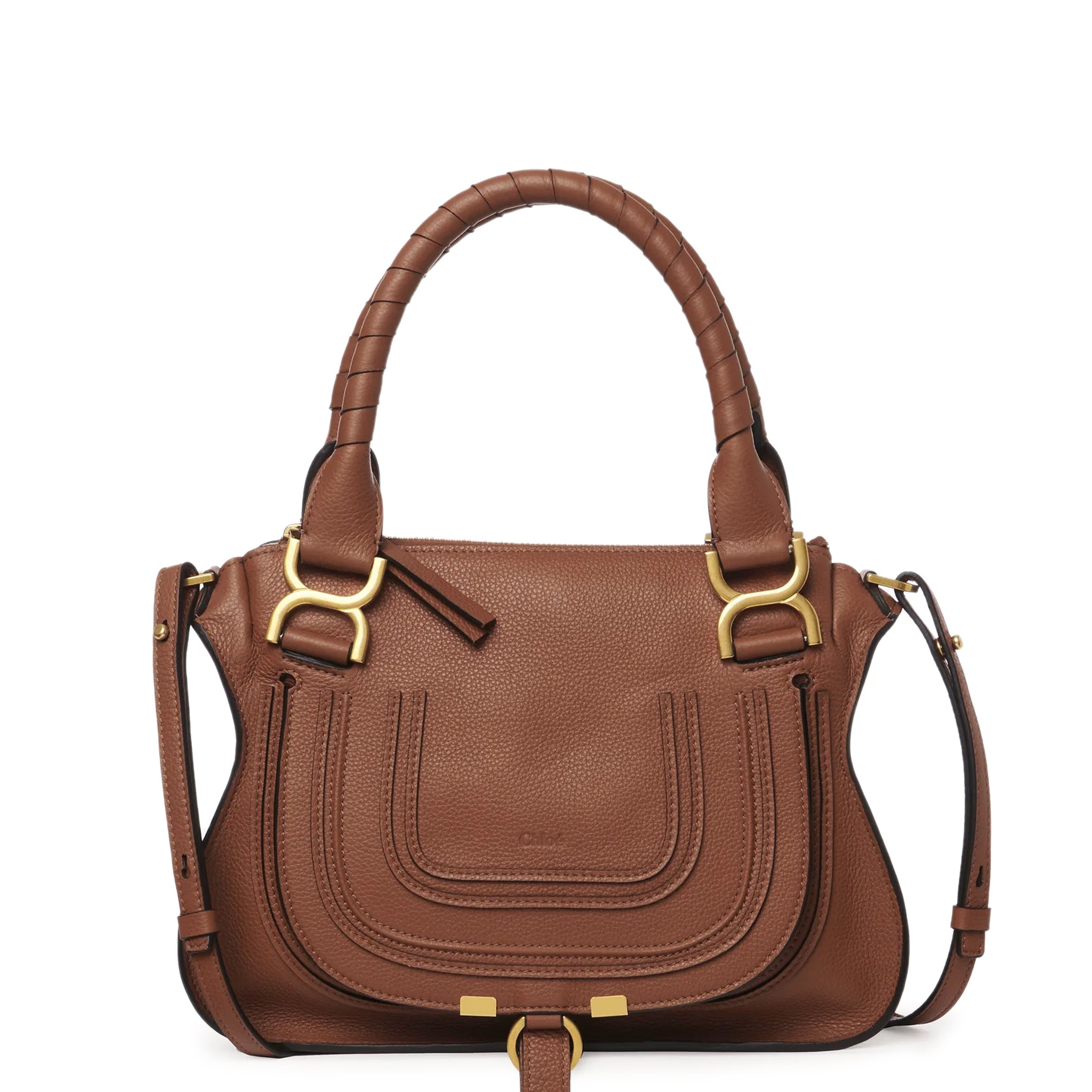 Small Marcie double carry bag in grain calfskin with antique brass hardware.
