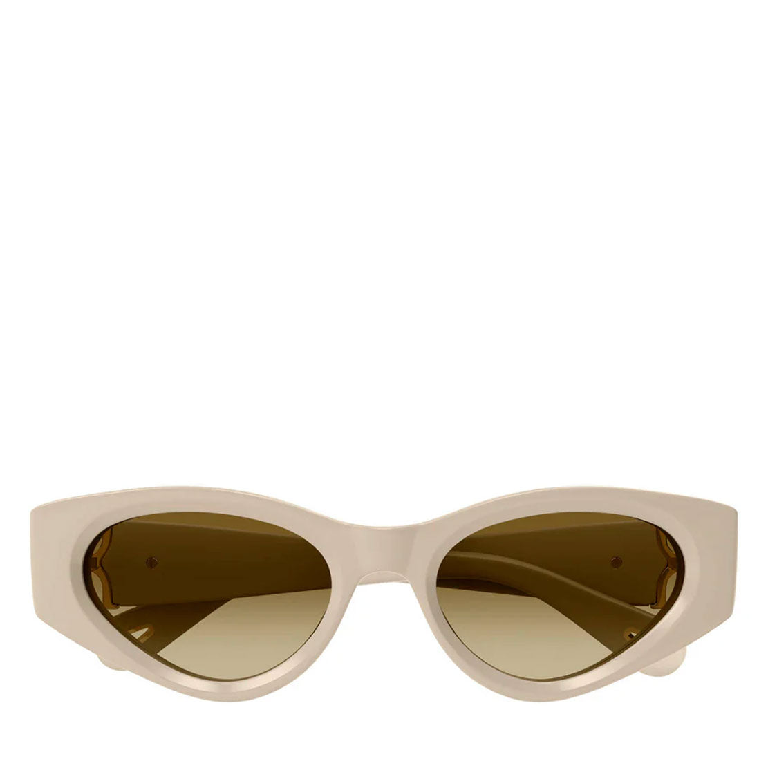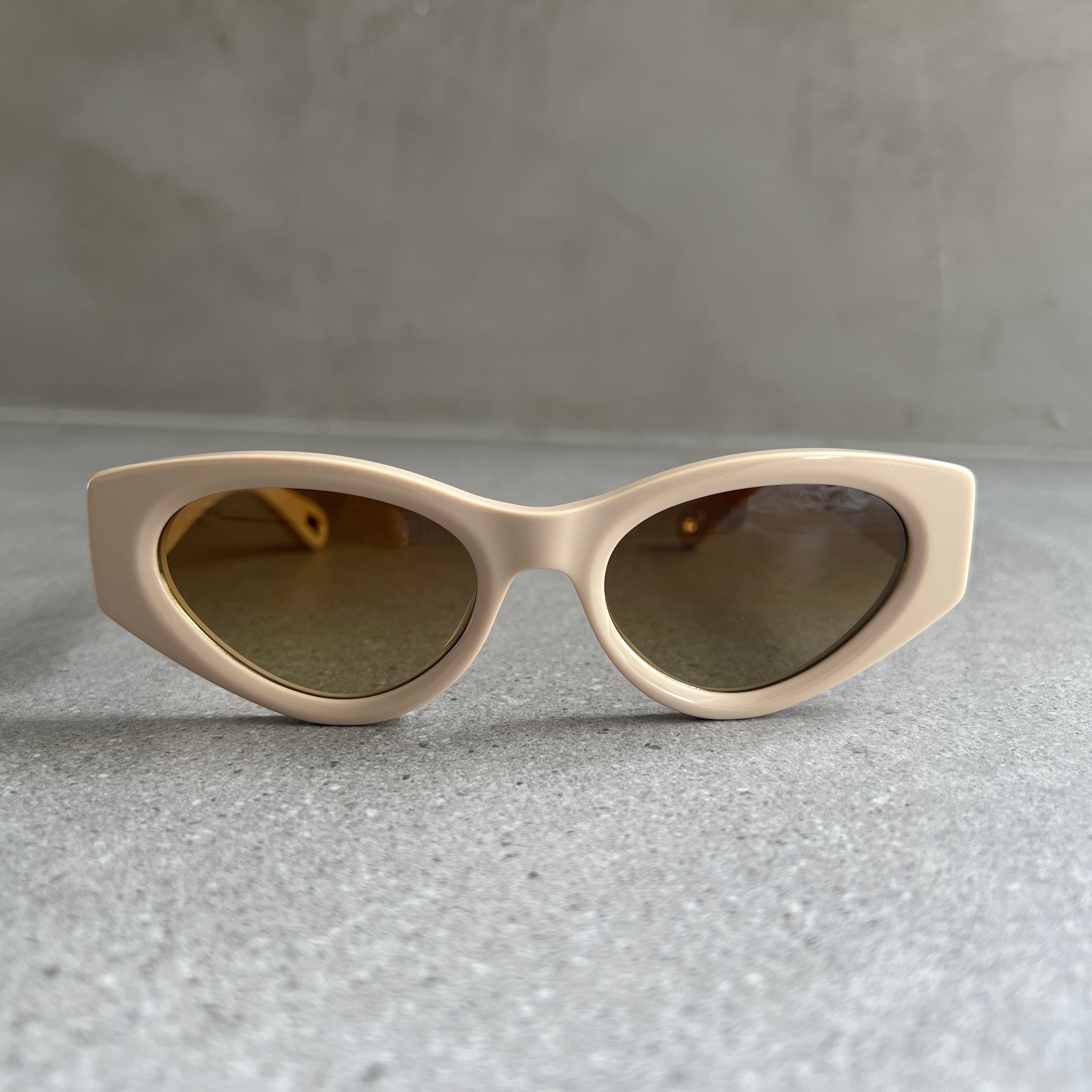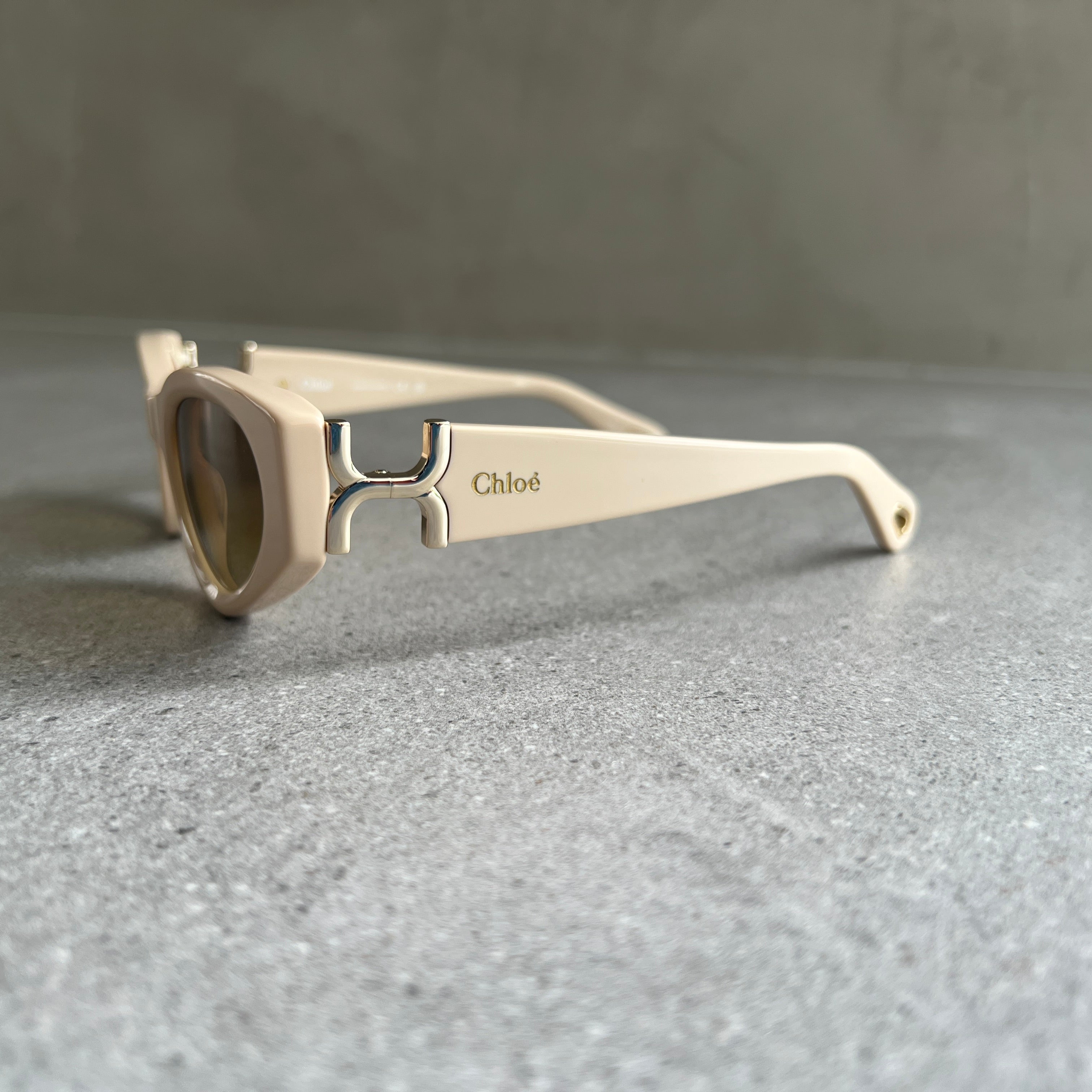Cat Eye shape frame in acetate with Marcie gold metal logo as a functional hinge. Solid ivory colour inspired by Chloé SS24 RTW collection.