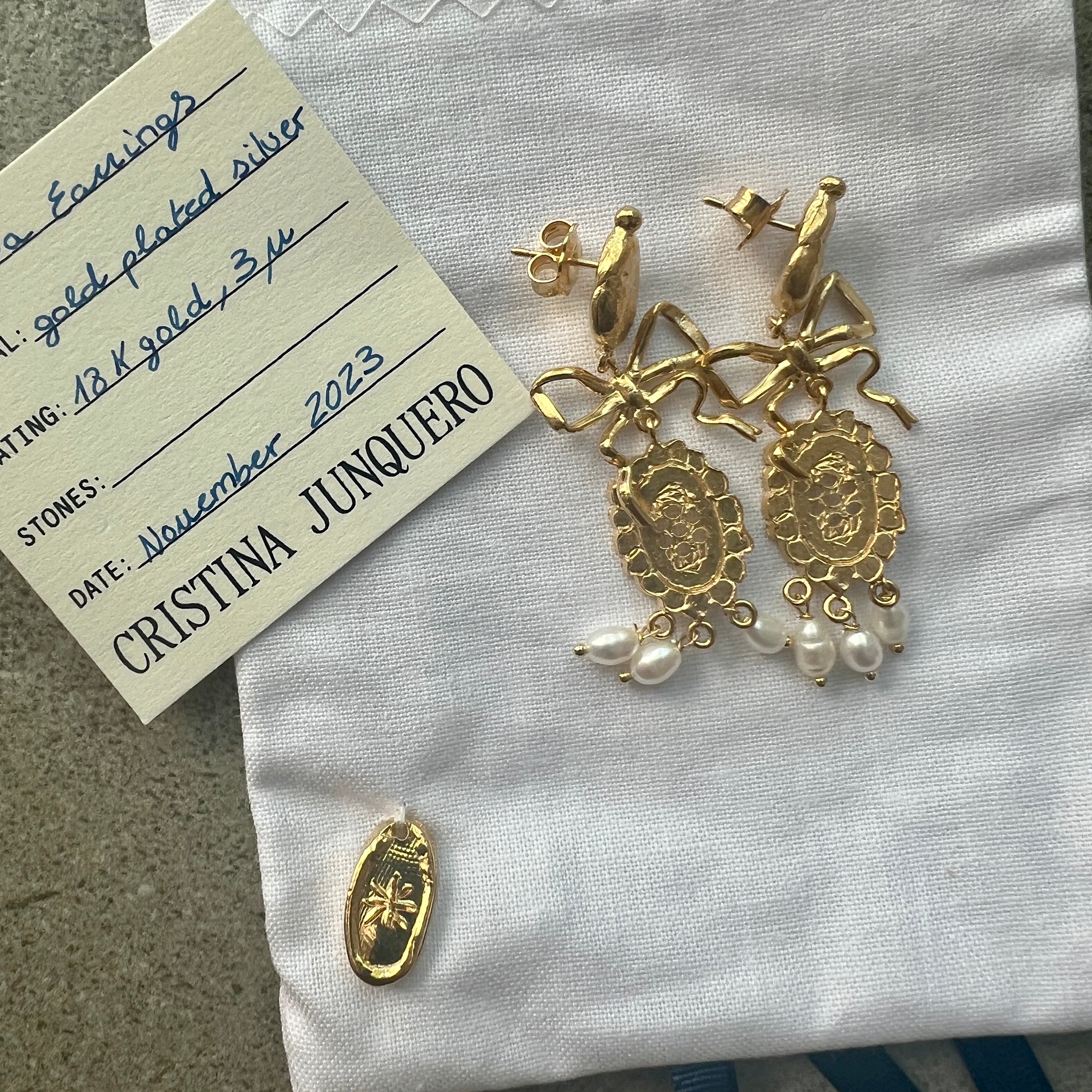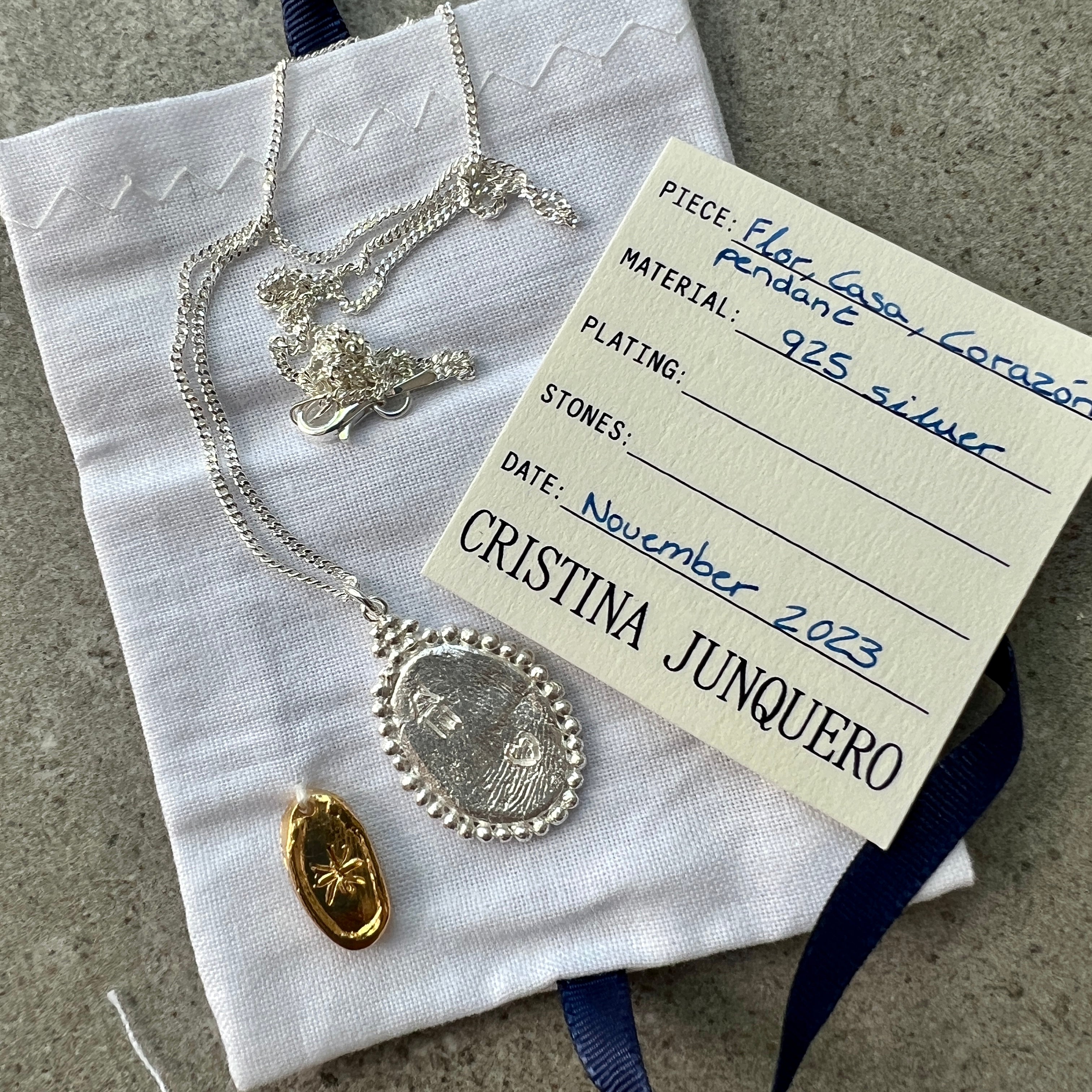 Rooted in the rich cultural heritage of Andalusian jewelry, Cristina Junquero presents a new and innovative approach to adornment, blending deeply religious symbolism with a touch of humor. Having grown up surrounded by the traditional craftsmanship of her mother's small jewelry shop in Chipiona, Cadiz, Cristina's childhood ignited a creative spark that led her to reimagine jewelry with a daring and rebellious flair.