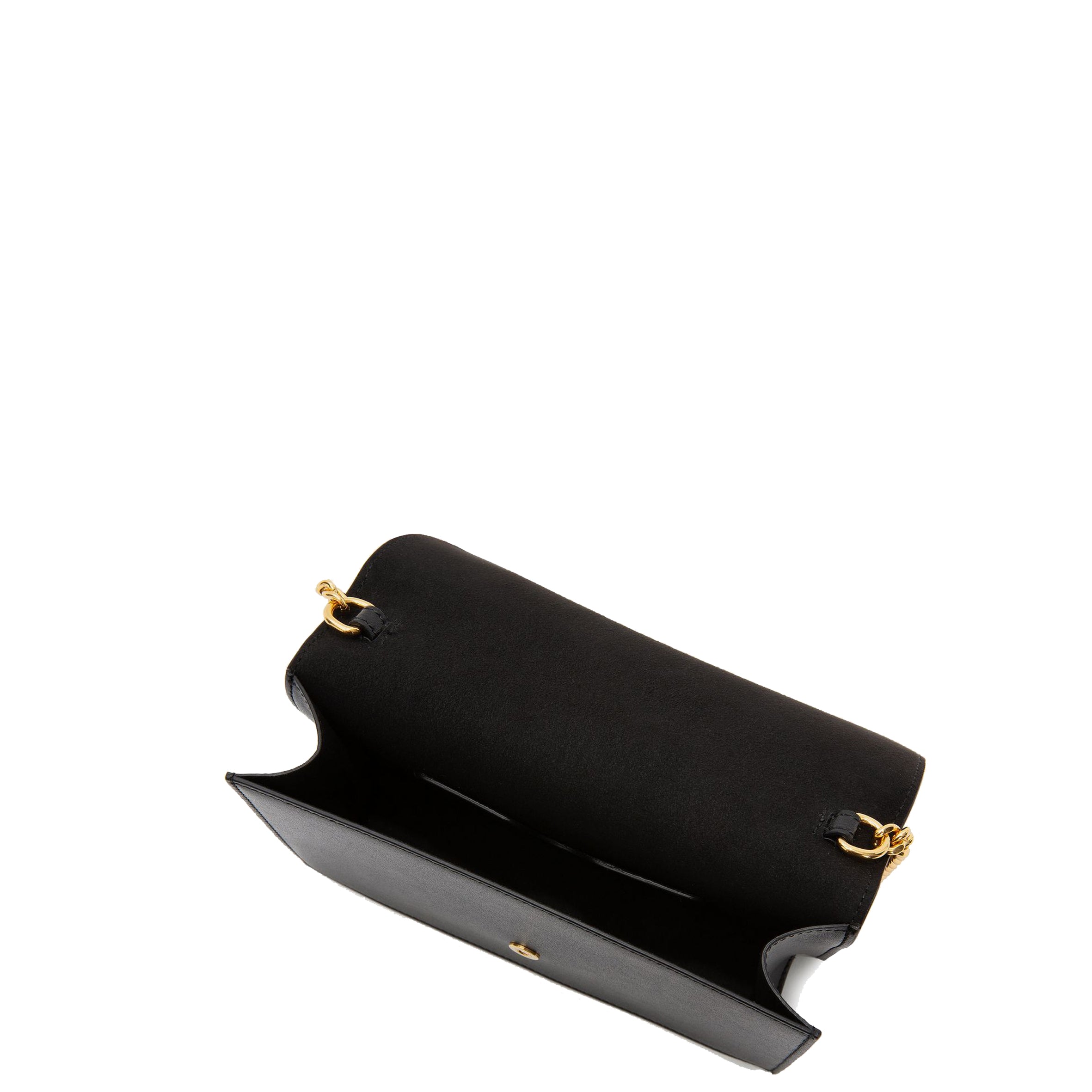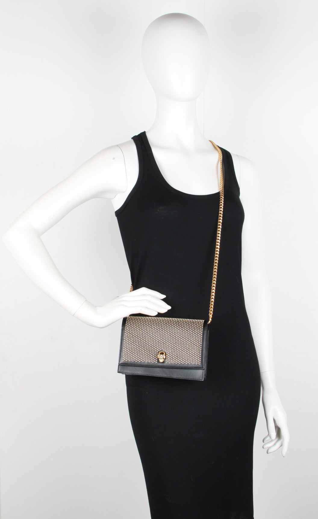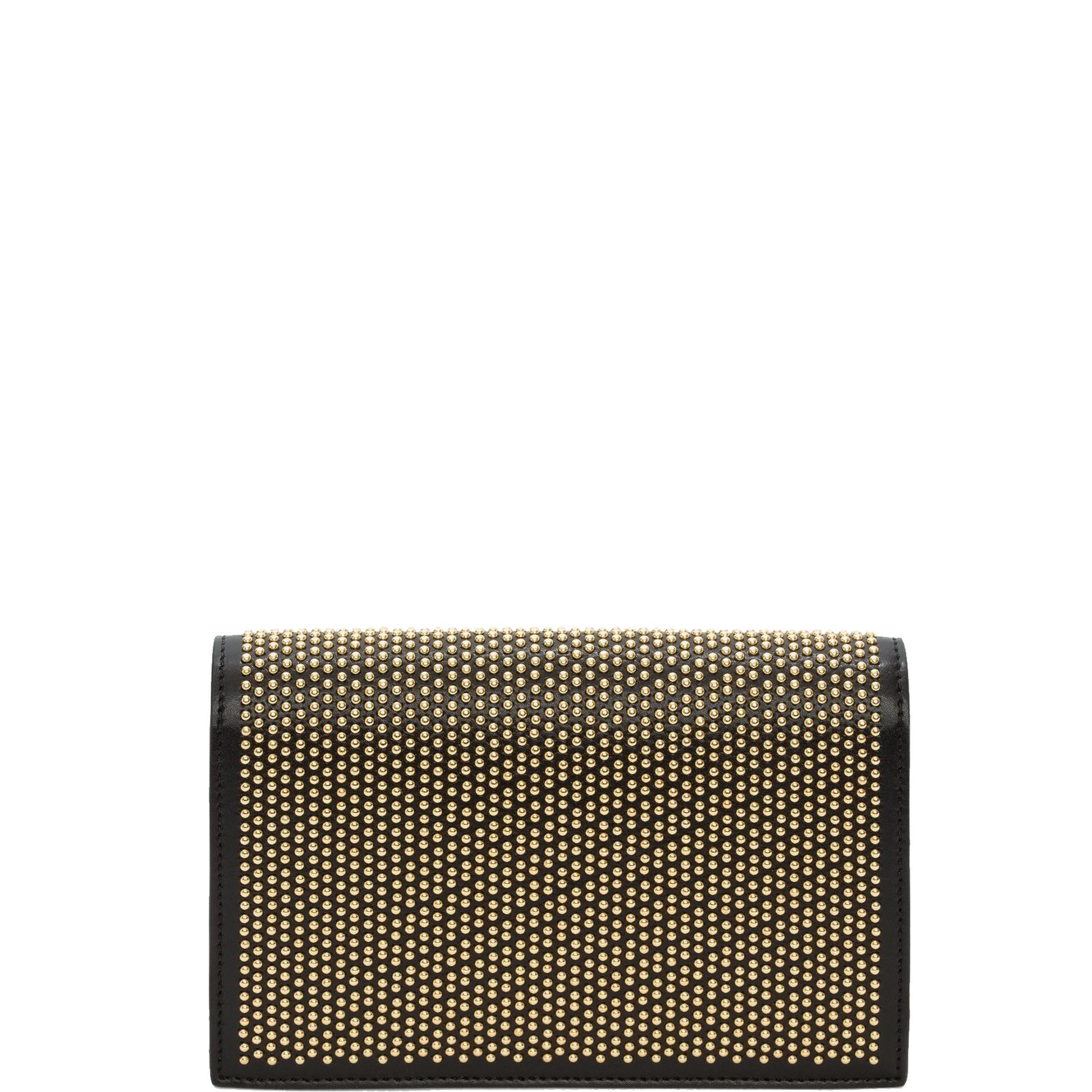 Alexander McQueen black calfskin Mini Skull bag comes embellished with a skull detail and mini gold studs. This bag features one central compartment, one card pocket and snap button closure. Accomodates smartphones.