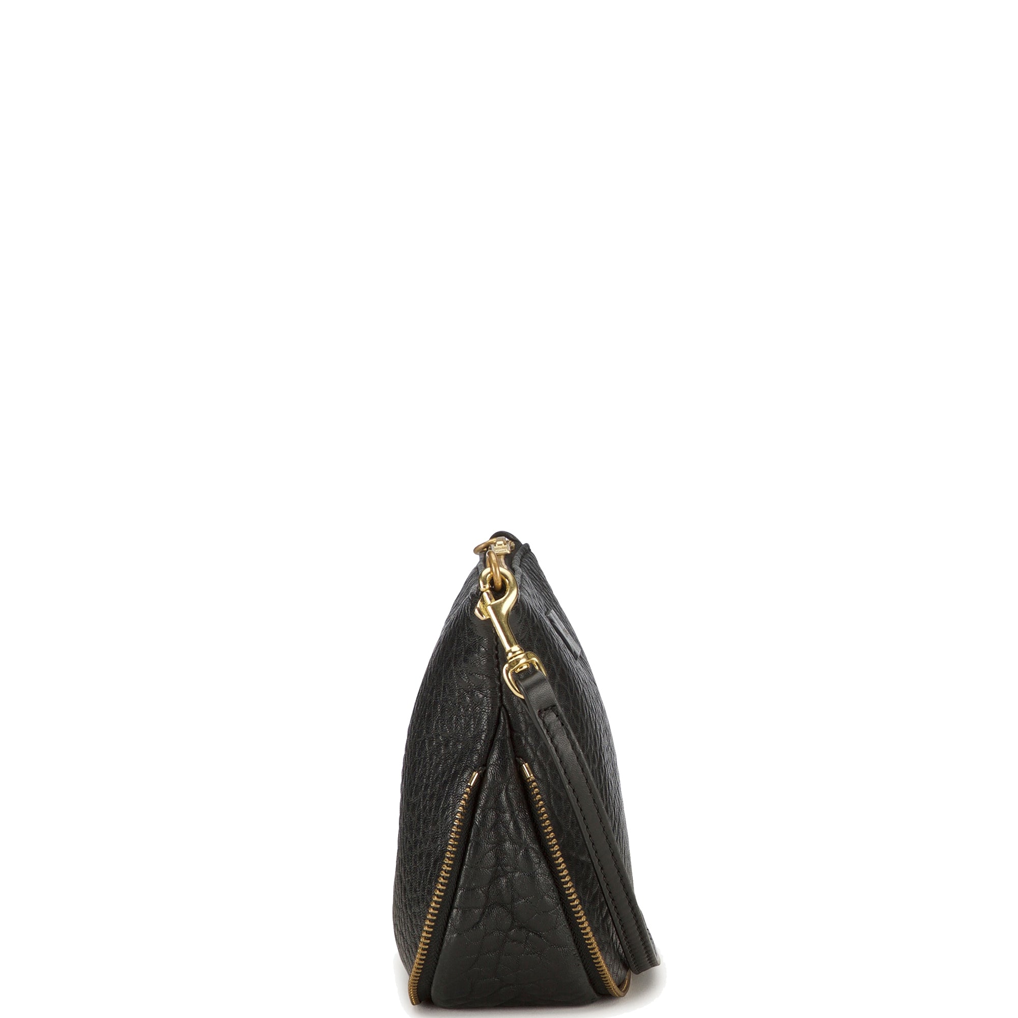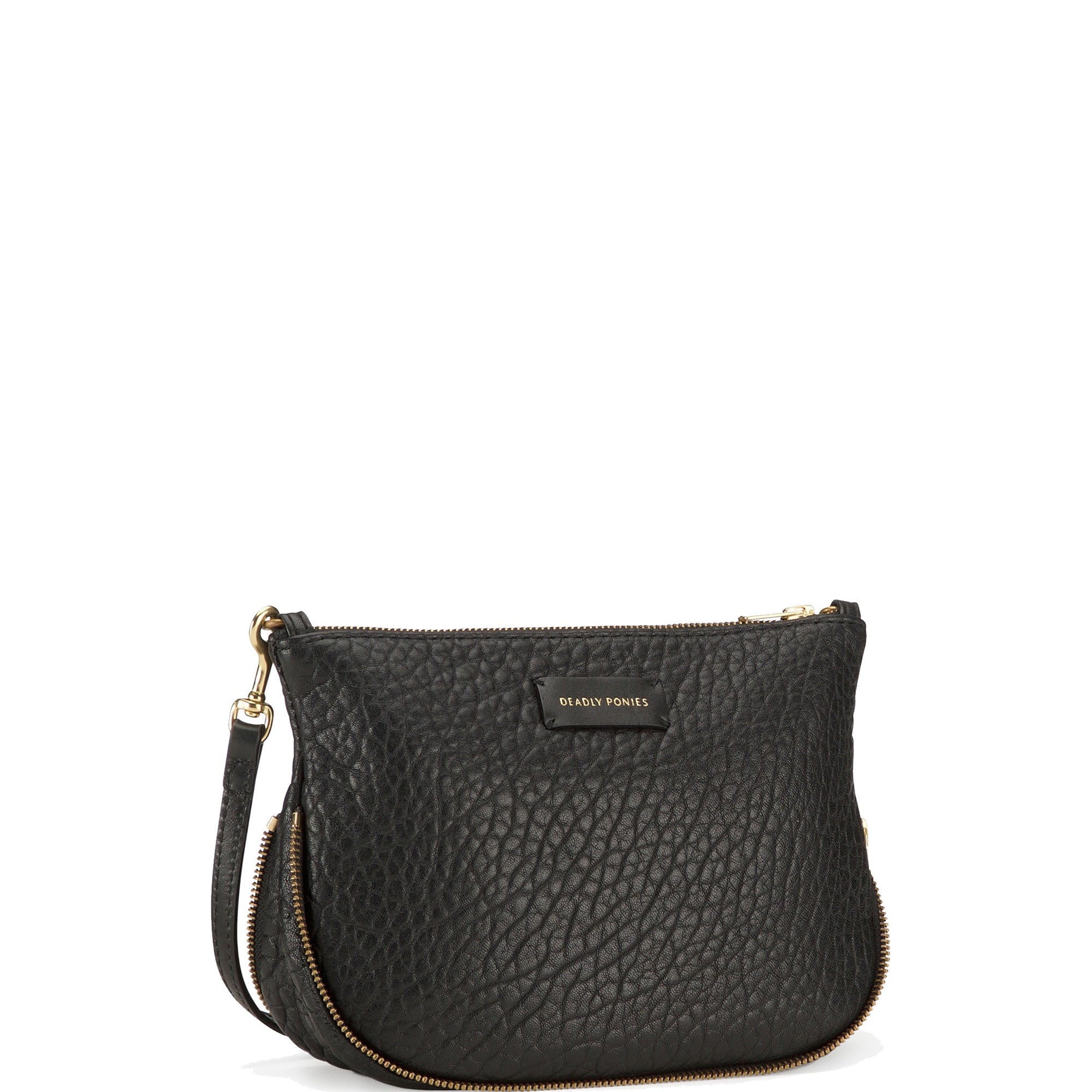 The best selling and much adored Mr Gator bag from Deadly Ponies has been updated as a comfortable and stylish crossbody bag. With zipper access from the top and zipper detail on the bottom the bag is completed with brass hardware and the brands signature gold foil logo embossment on the front. The cotton lined interior holds an internal zip pocket and enough room to take you throughout the day, but small and elegant enough to take with you at night.
