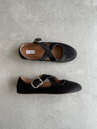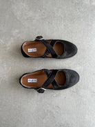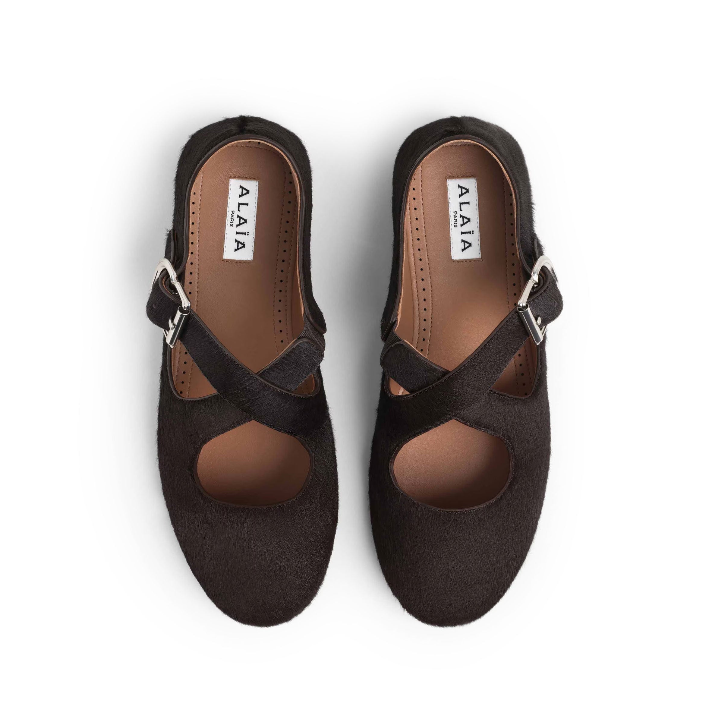 Signature Alaïa criss cross ballet flats inspired by classical Japonese shoes featuring a cross buckle straps. Crafted in haircalf leather.