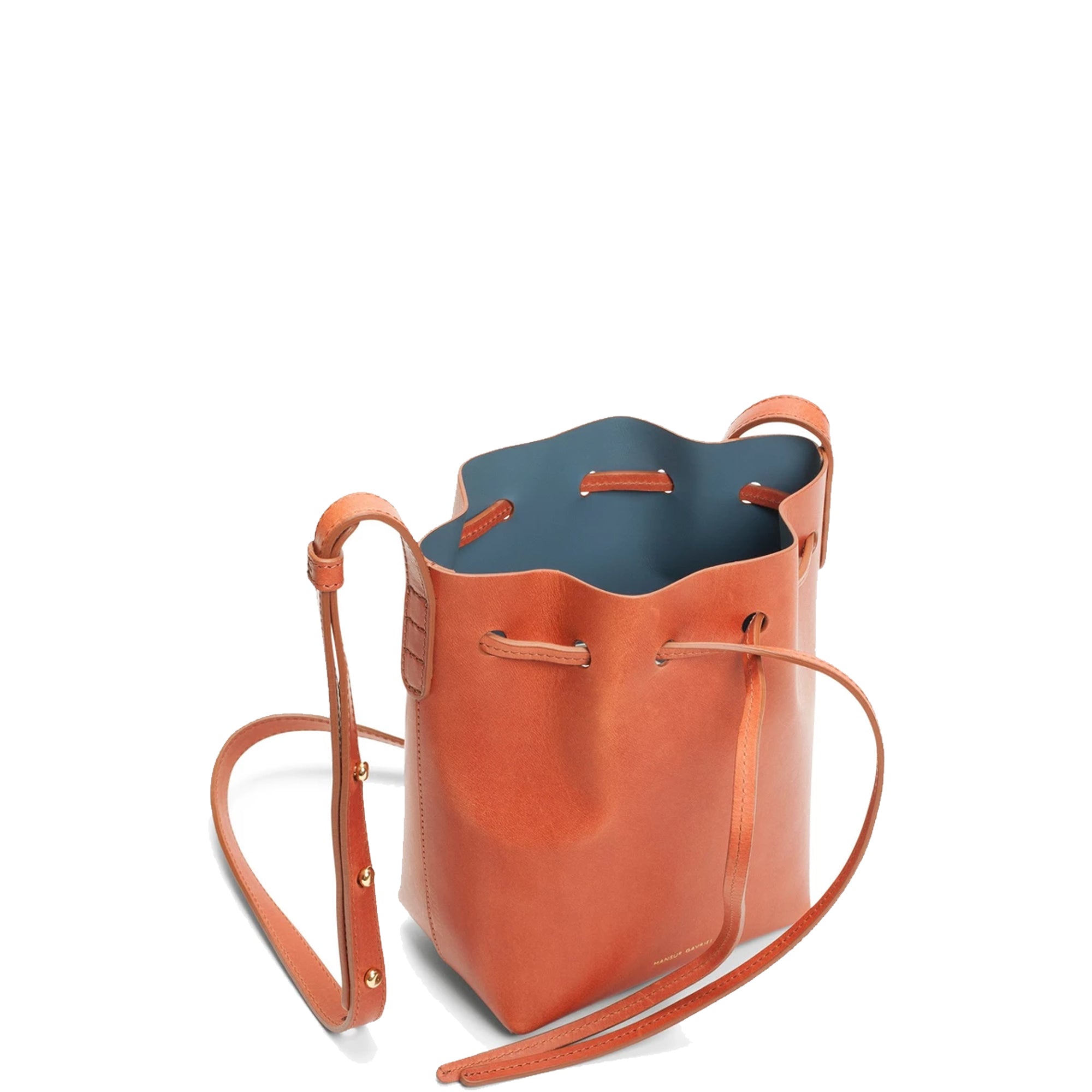 Italian vegetable tanned leather mini mini bucket bag with matte patent interior. Adjustable strap.