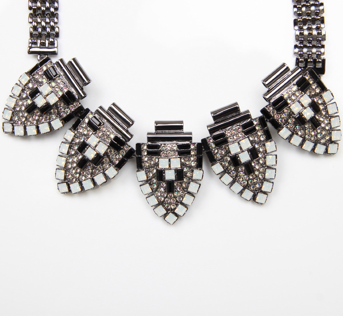 Hematite plated chain weave necklace with linked deco arrowhead motifs with tubing featuring geometric jet Swarovski and mixed crystals.