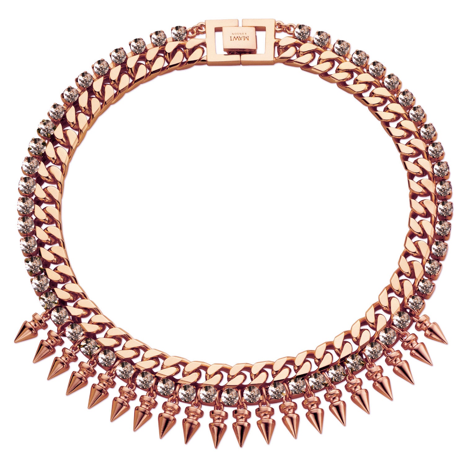 Crystal and Spike Necklace in rosegold by Mawi. Chunky chain necklace edged with square clear crystals and dangling metal spike detailing. Designer inscribed clasp fastening at rear. Total length: 45cm approx.