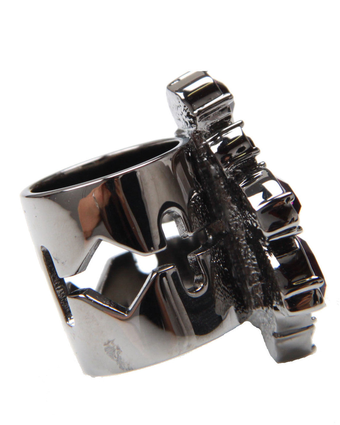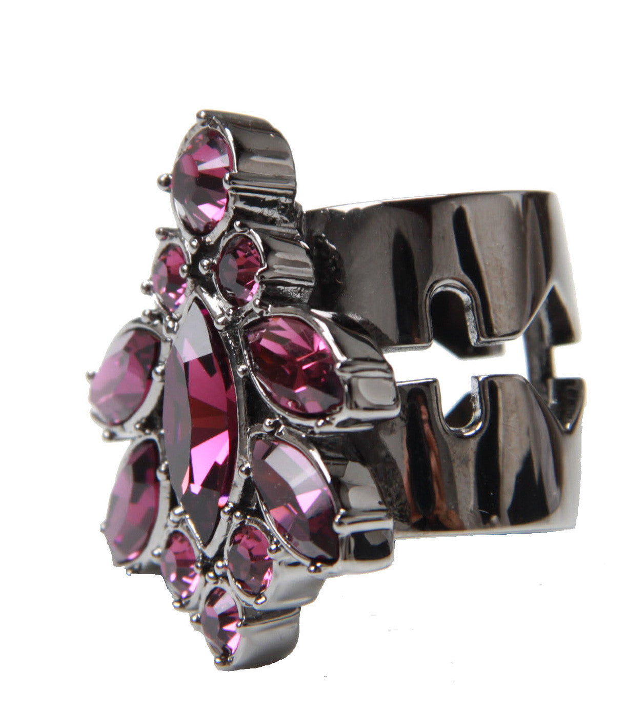 Hematite plated ring featuring Purple nymph crystal motif and razor blade band detail.