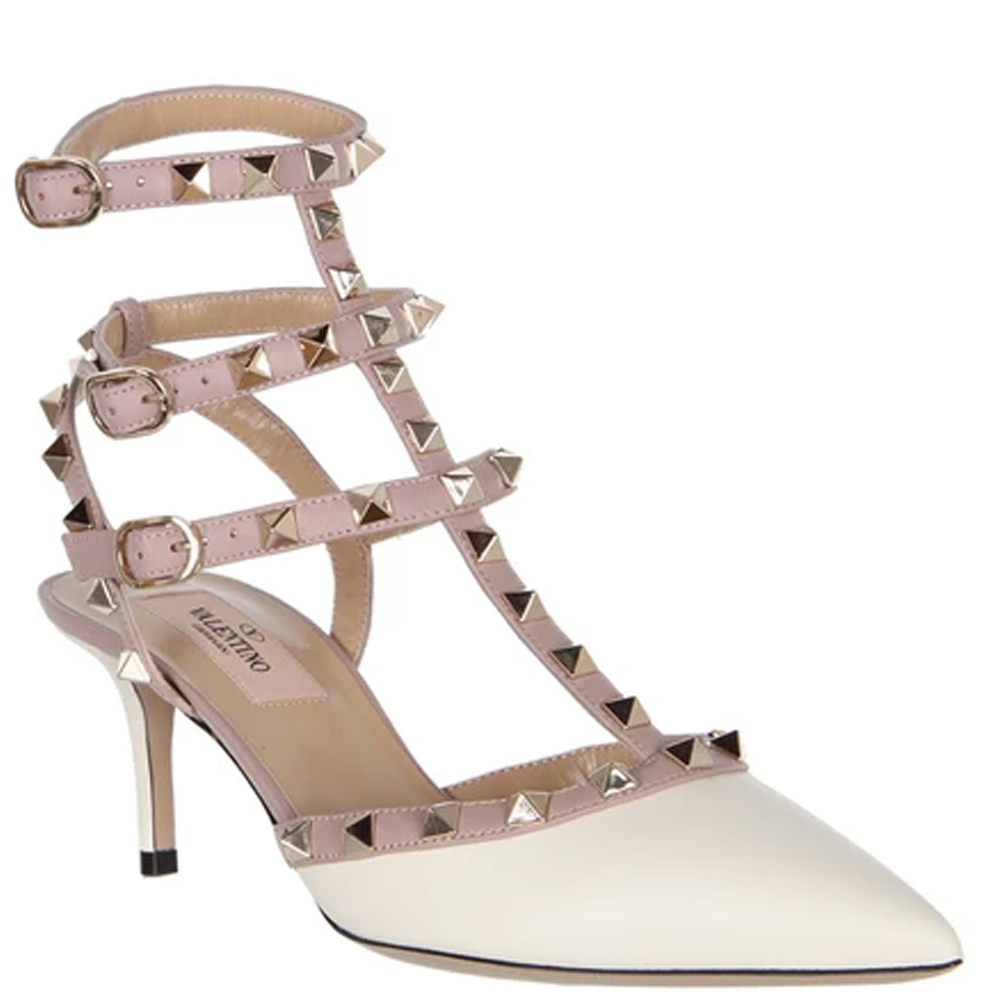 Valentino Garavani Rockstud kitten heels in calfskin leather with cage style straps. Featuring the Valentino classic platinum-finish studs, adjustable buckle closures and a pointed narrow toe.