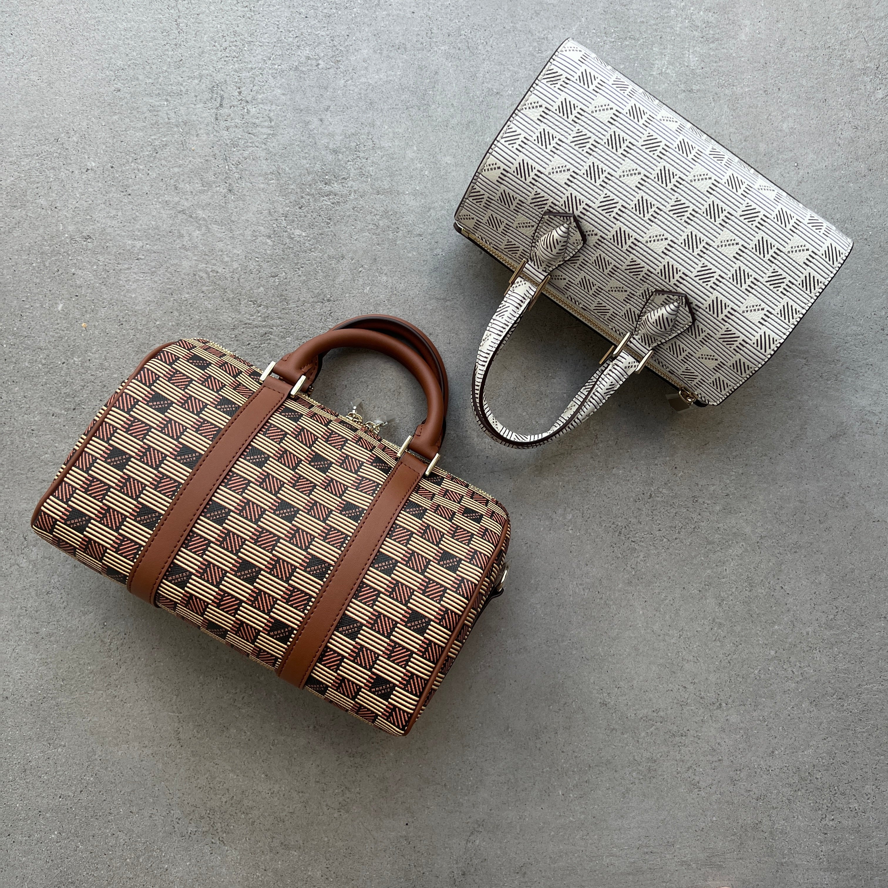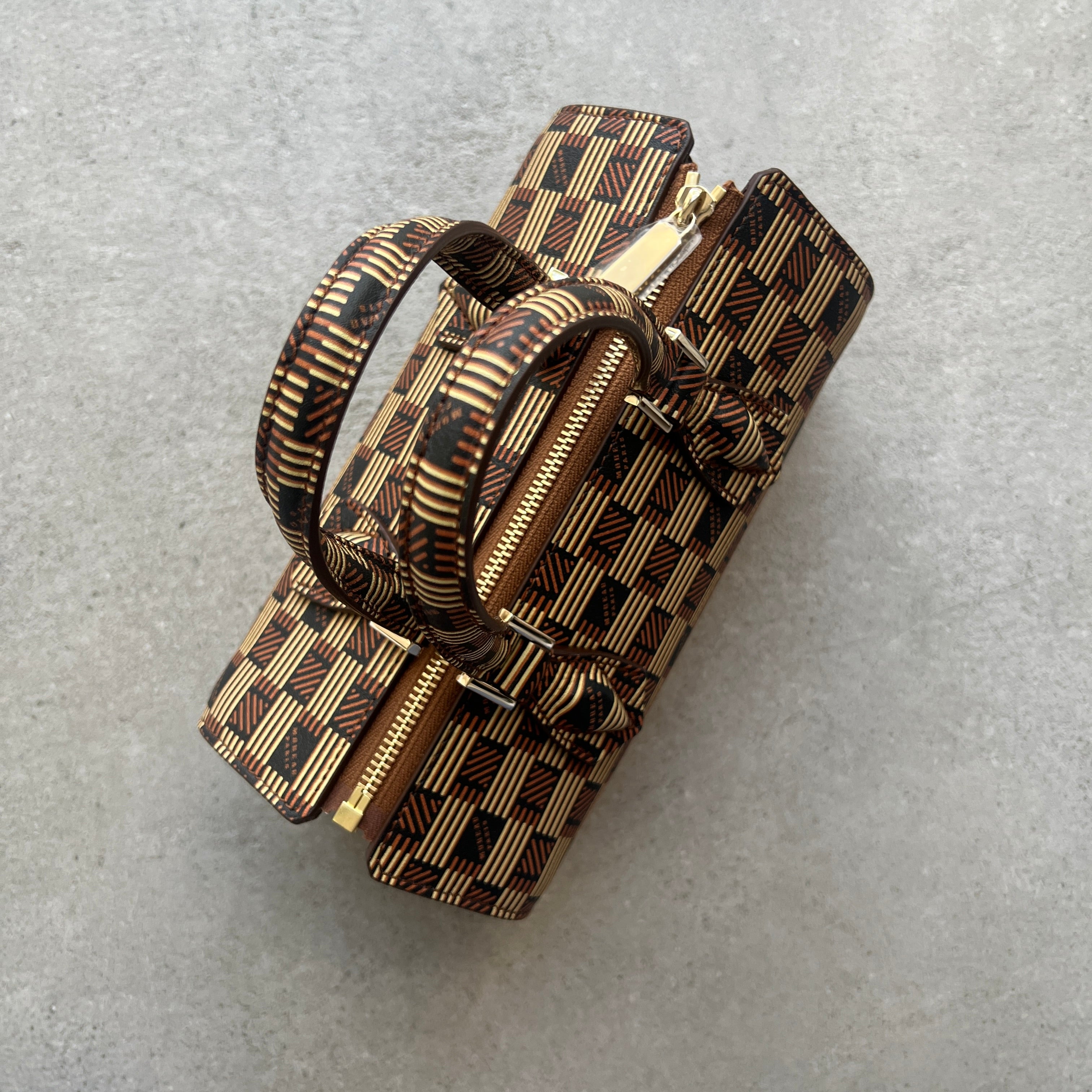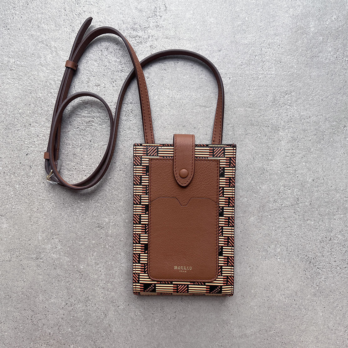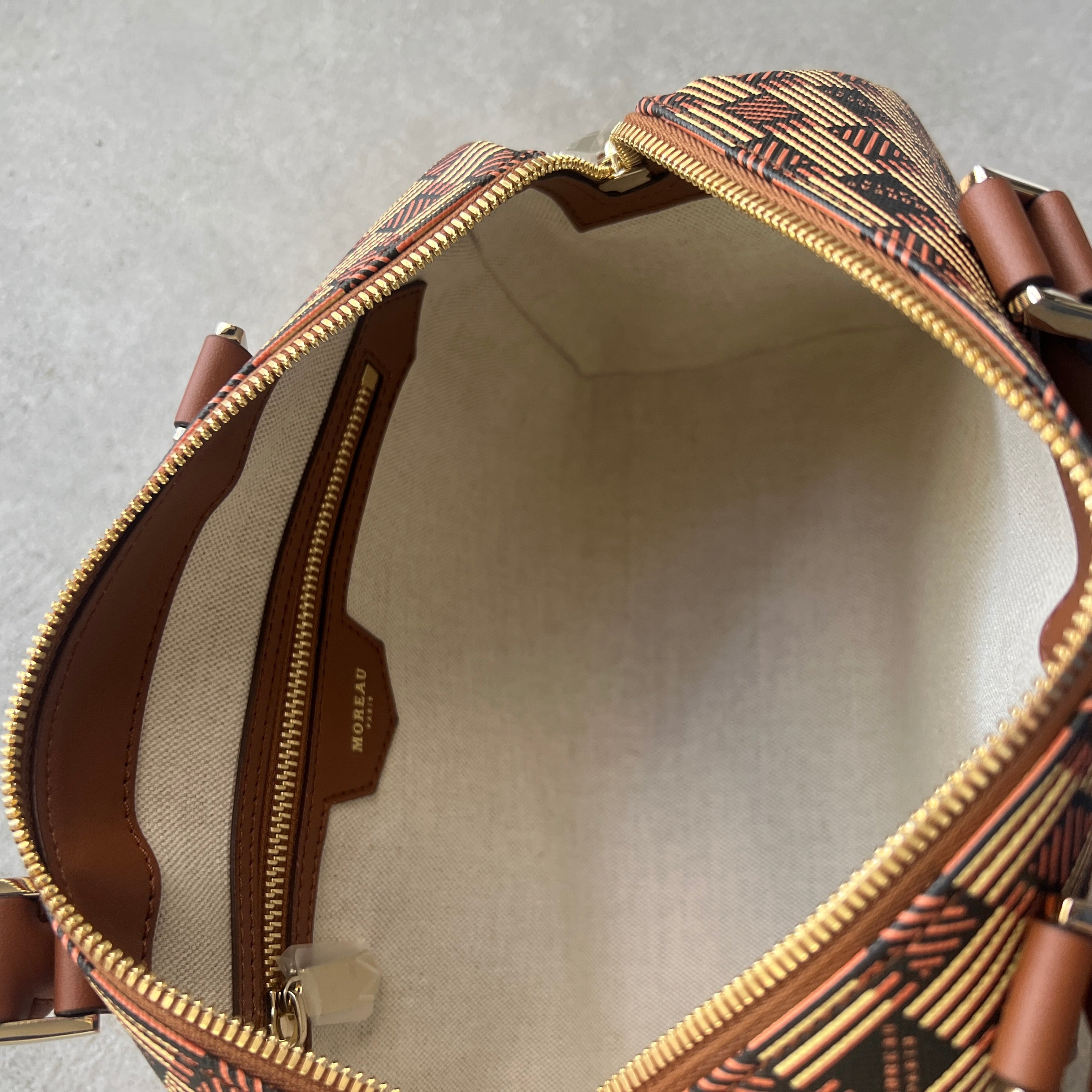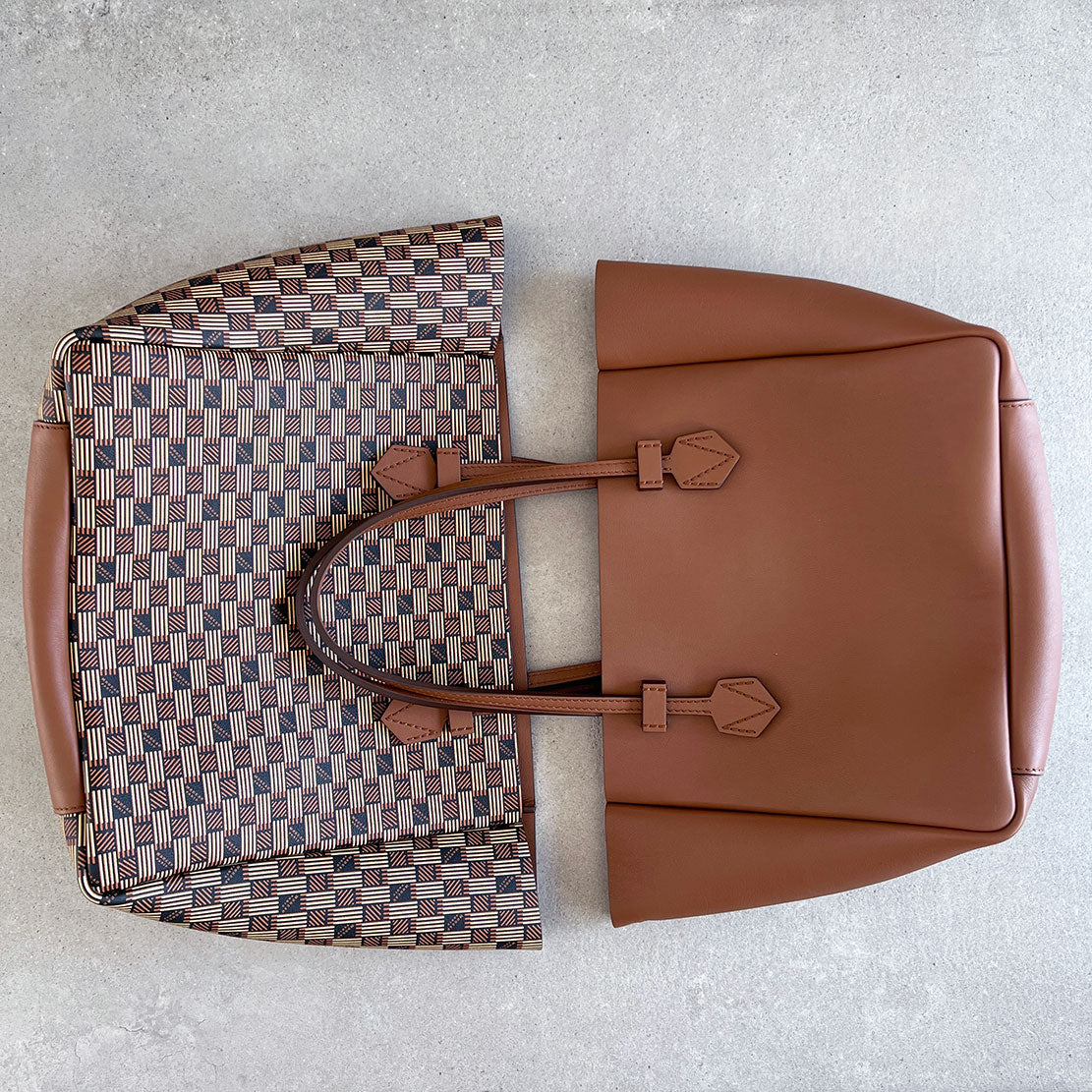 The iconic pattern of Maison Moreau is inspired by the intertwining of wicker stems, which formed the structure of different travel goods in the late 19th century. This unique signature print is reimagined on calf leather with a traditional printing technique that uses a semi-manual paint application, creating vibrant and deep colours.