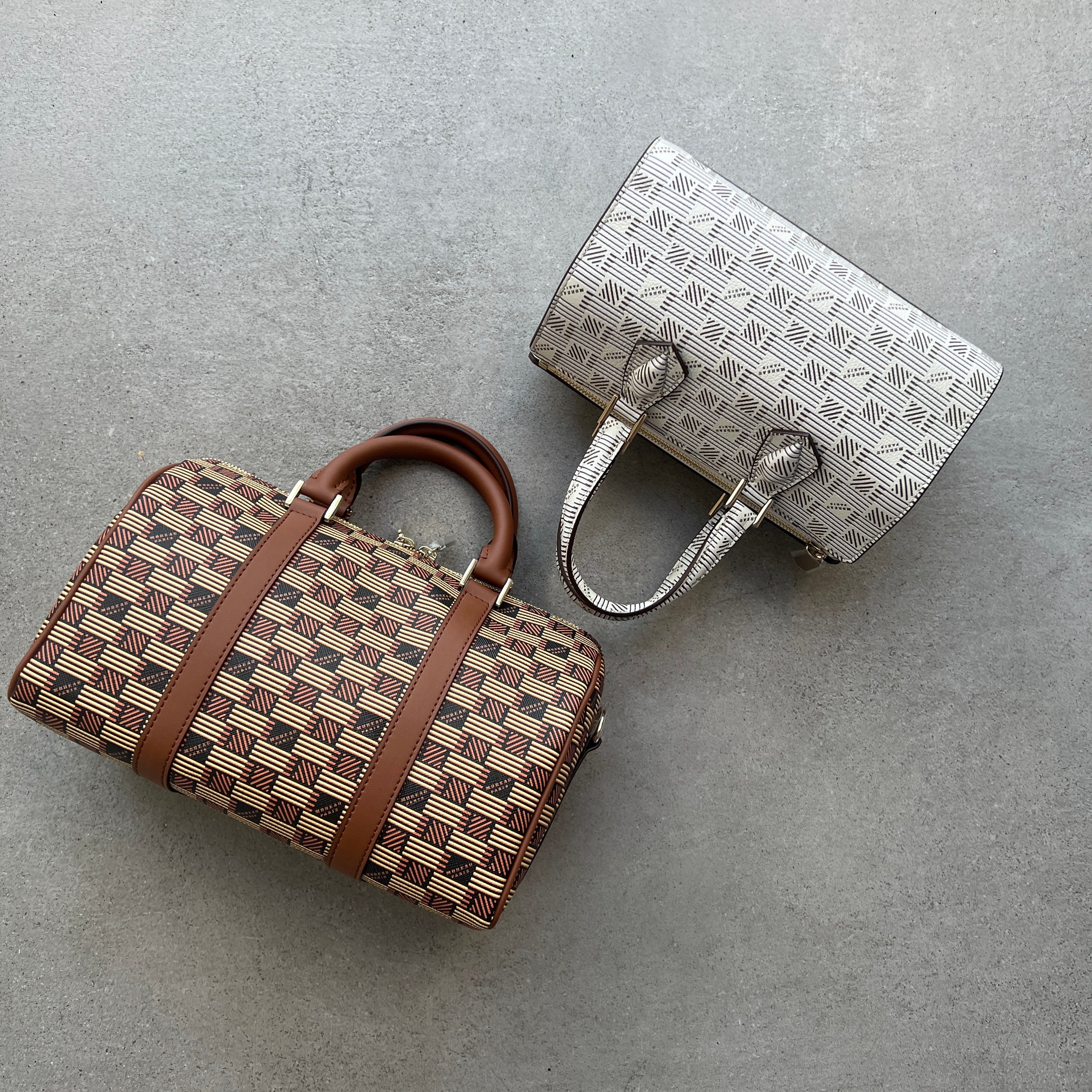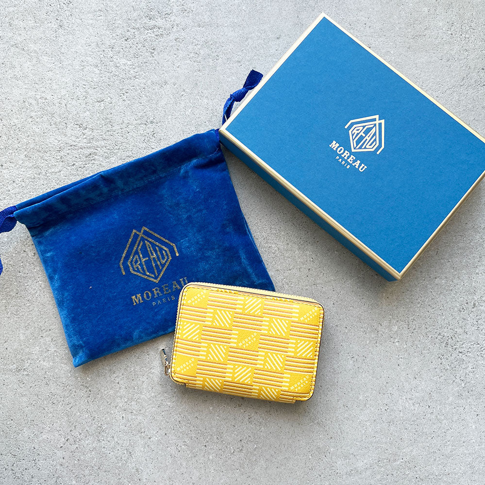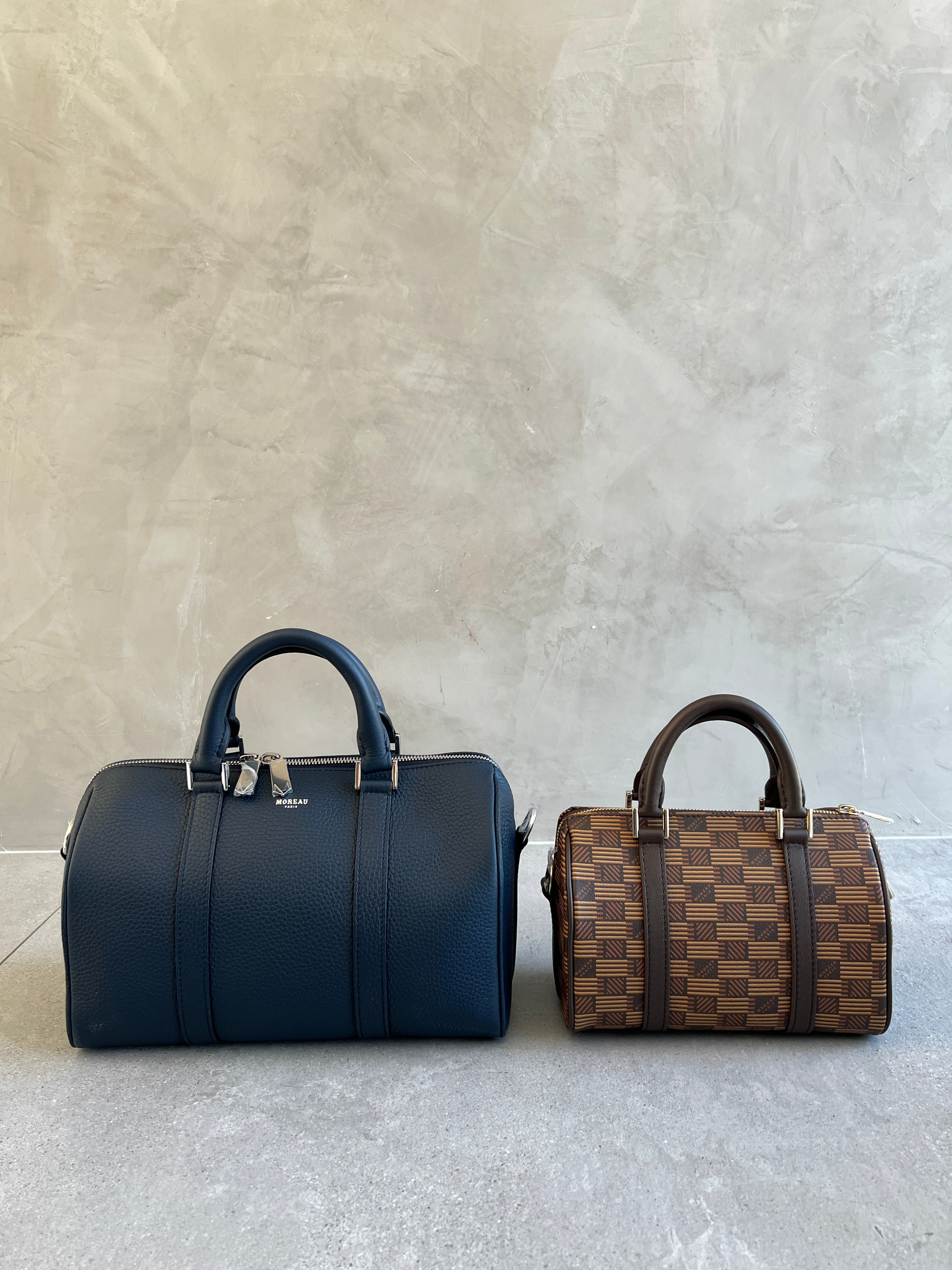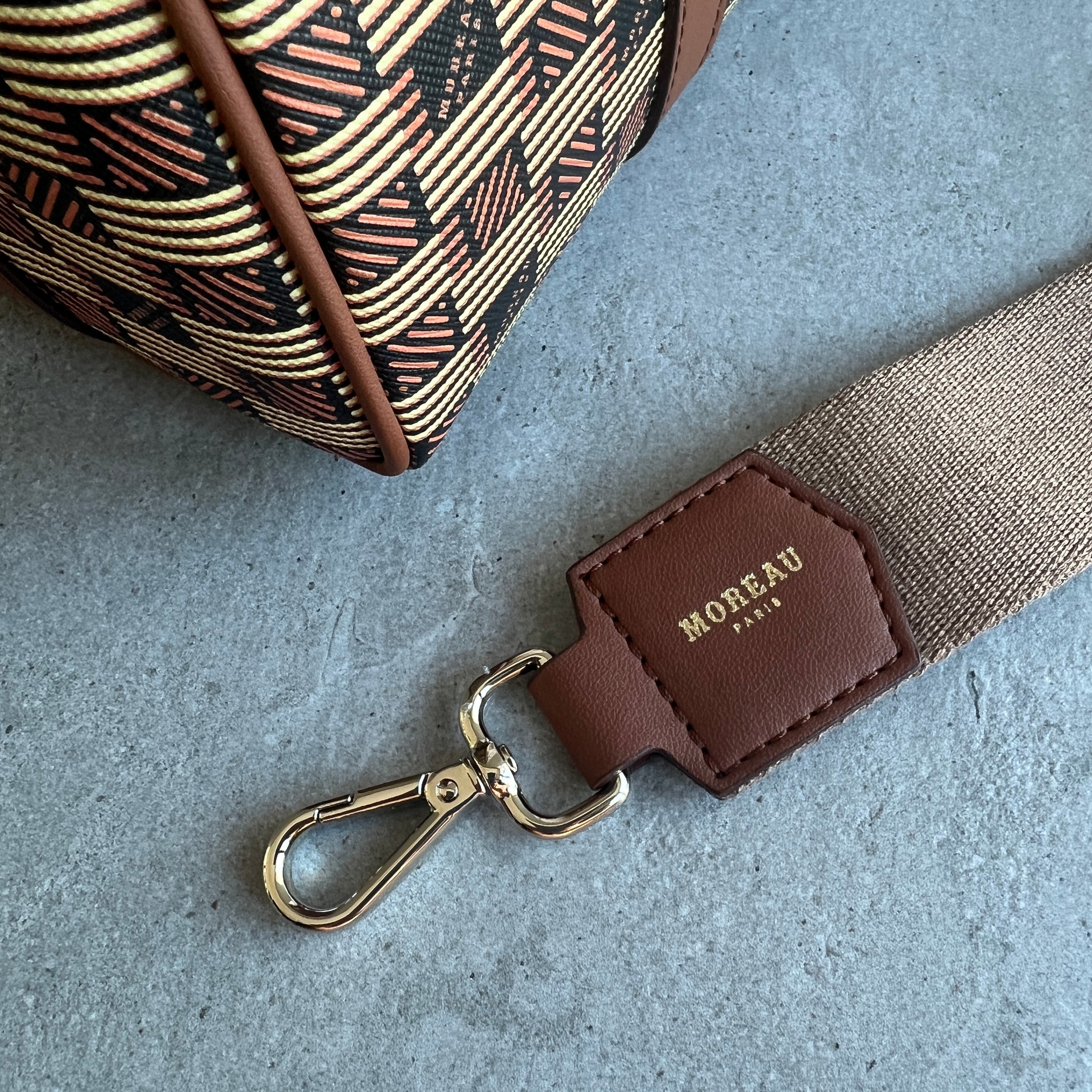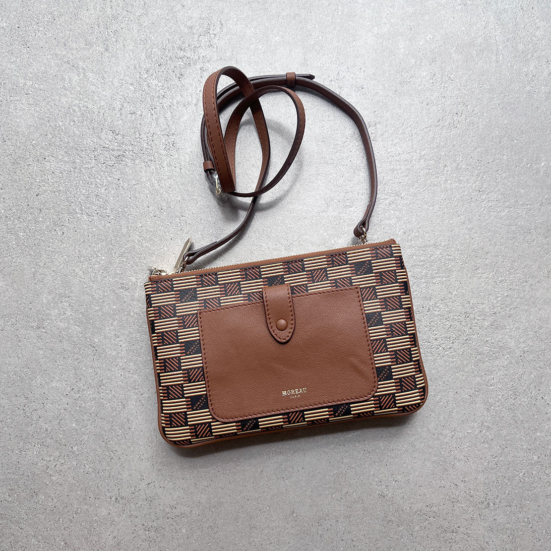The iconic pattern of Maison Moreau is inspired by the intertwining of wicker stems, which formed the structure of different travel goods in the late 19th century. This unique signature print is reimagined on calf leather with a traditional printing technique that uses a semi-manual paint application, creating vibrant and deep colours.