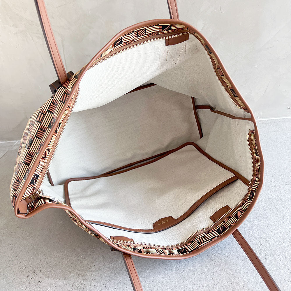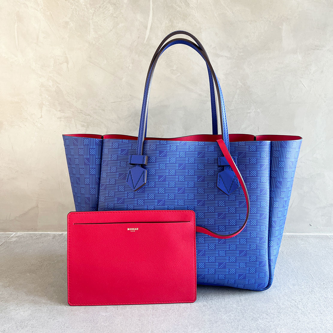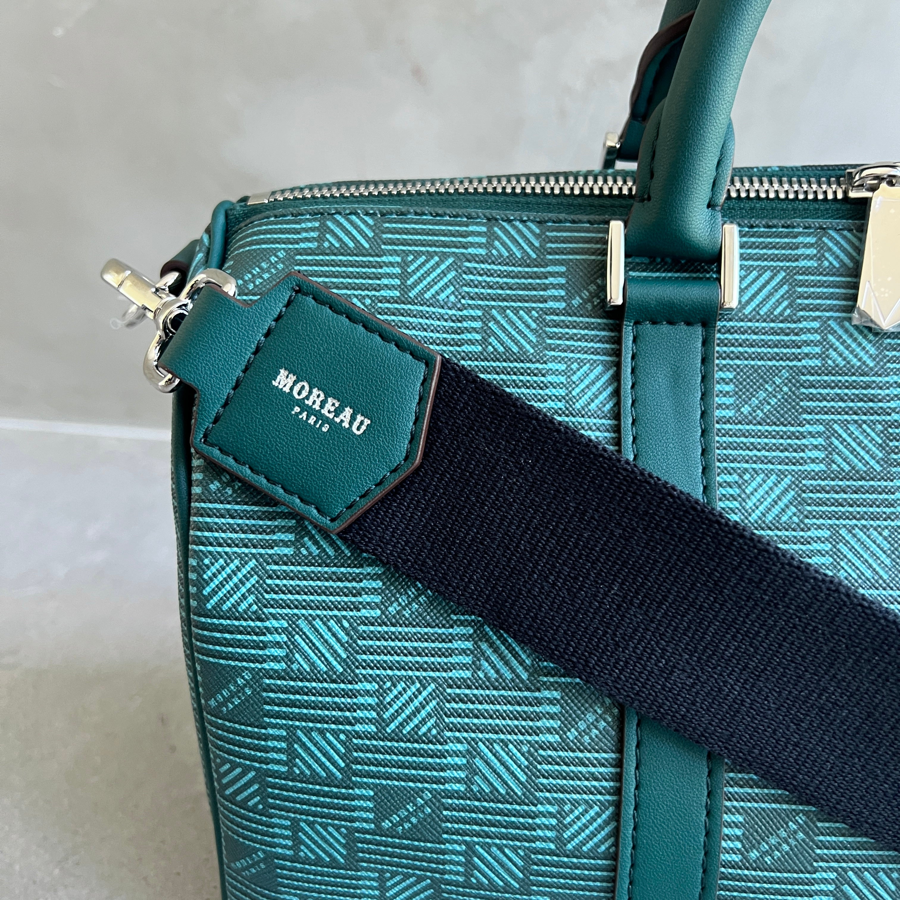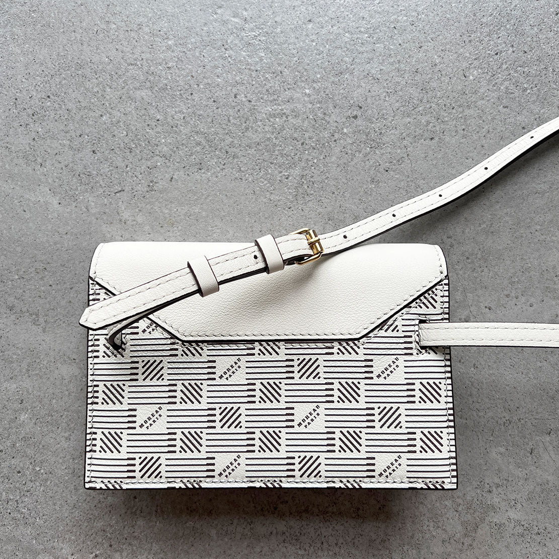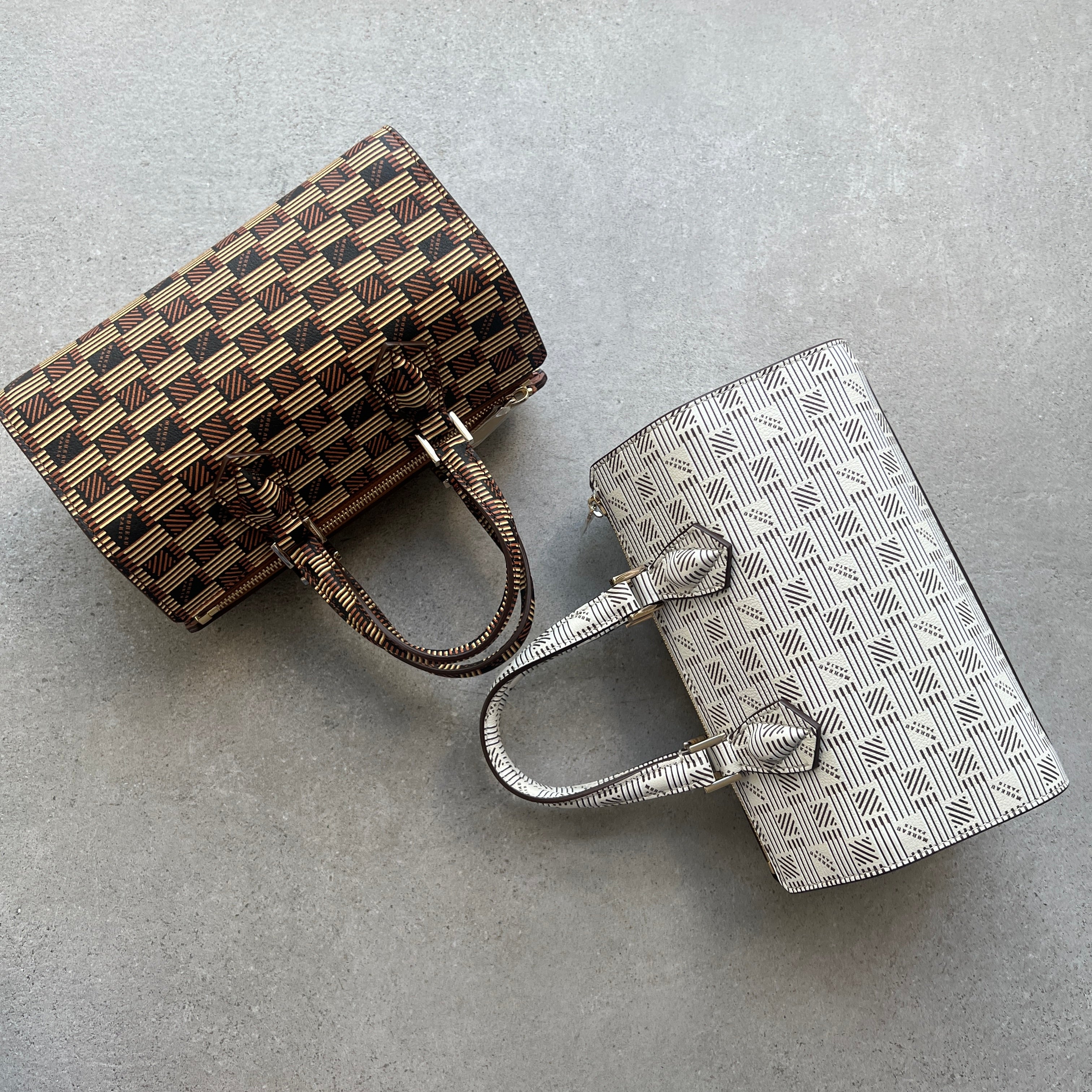 The iconic pattern of Maison Moreau is inspired by the intertwining of wicker stems, which formed the structure of different travel goods in the late 19th century. This unique signature print is reimagined on calf leather with a traditional printing technique that uses a semi-manual paint application, creating vibrant and deep colours.