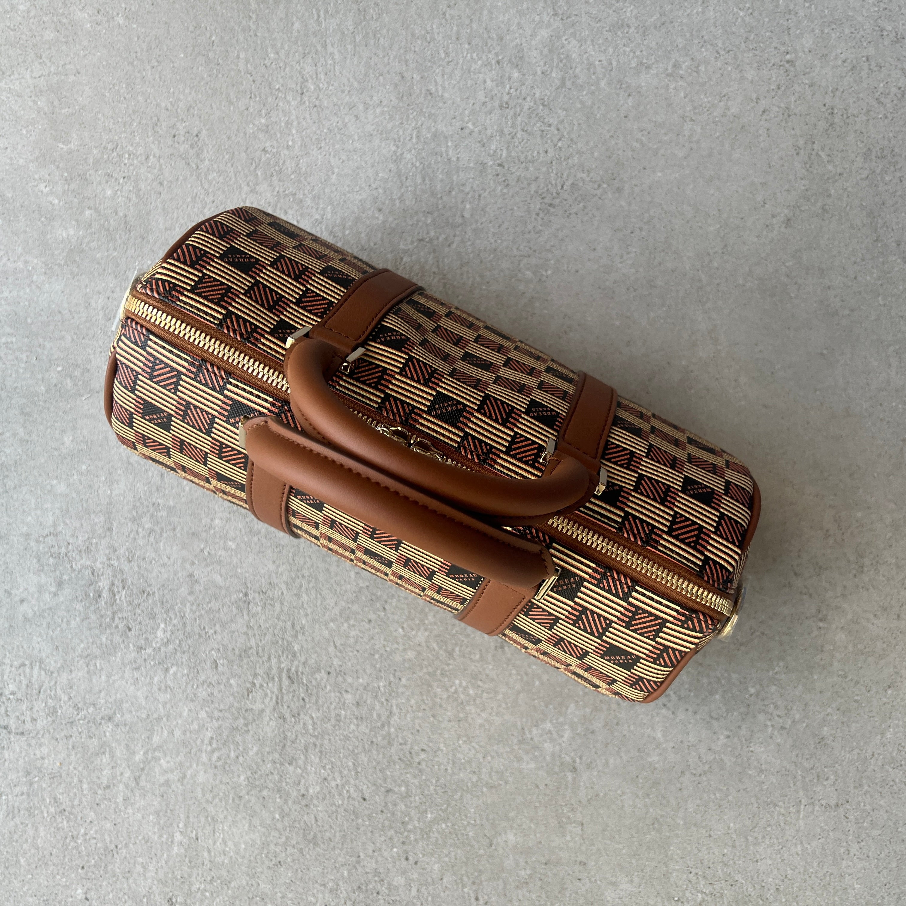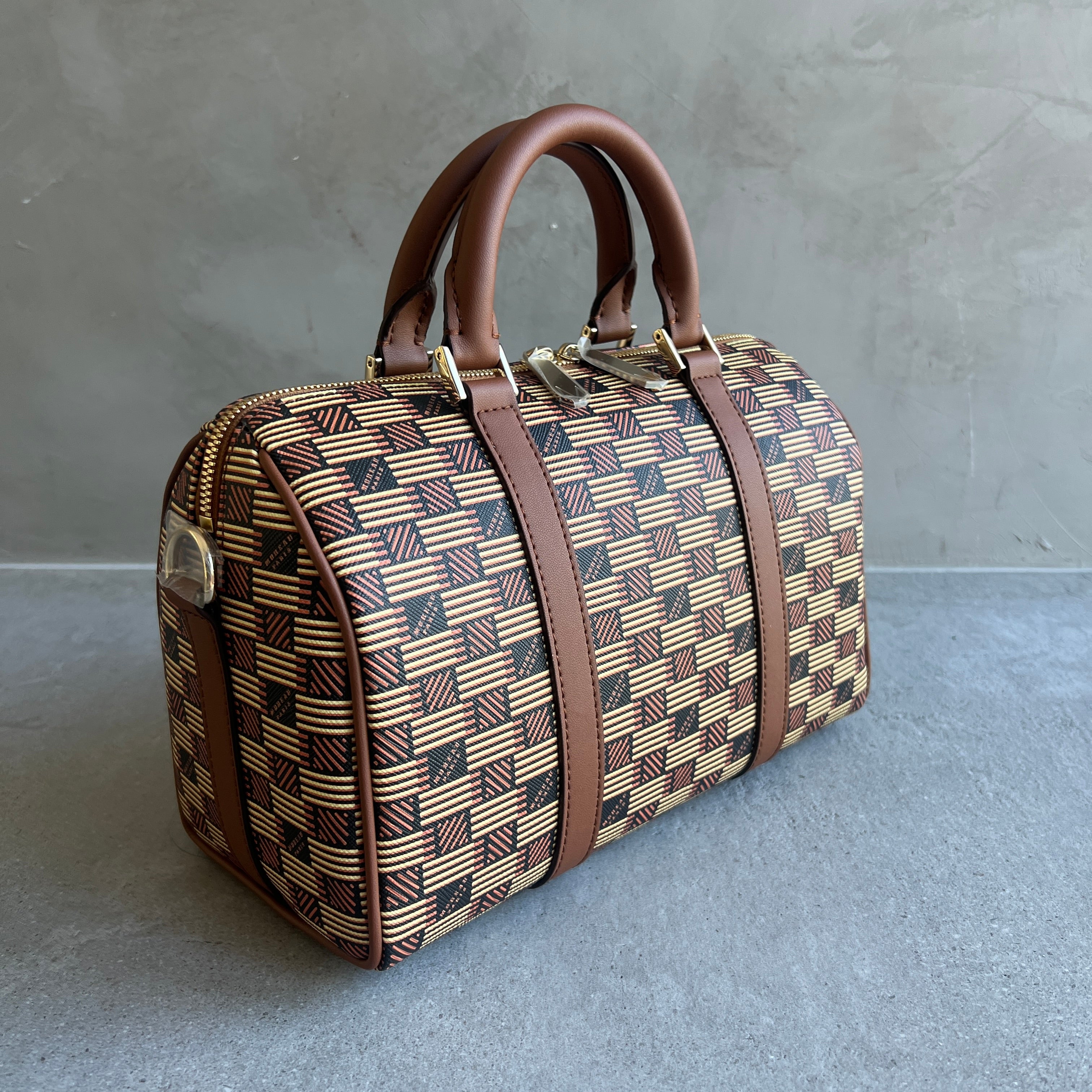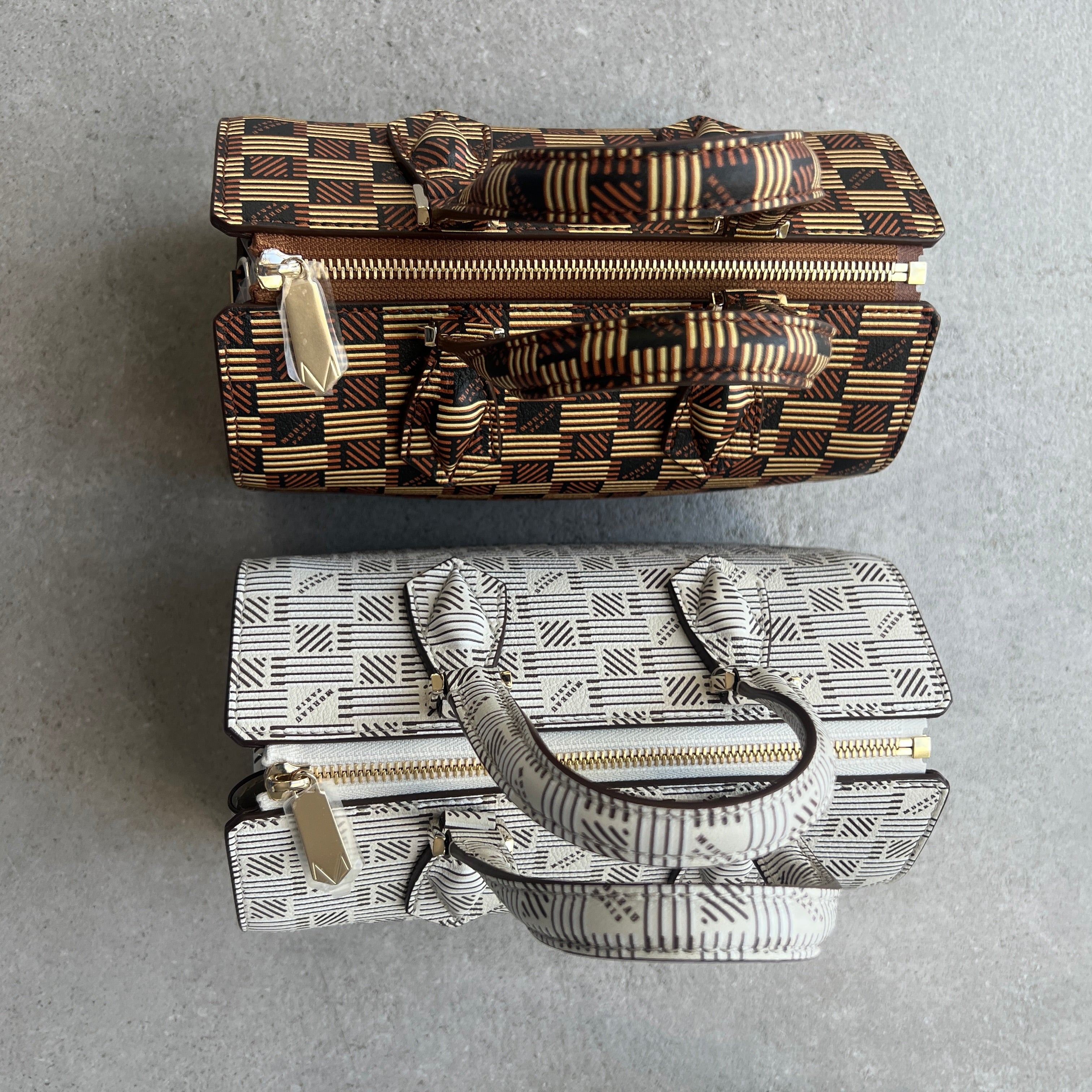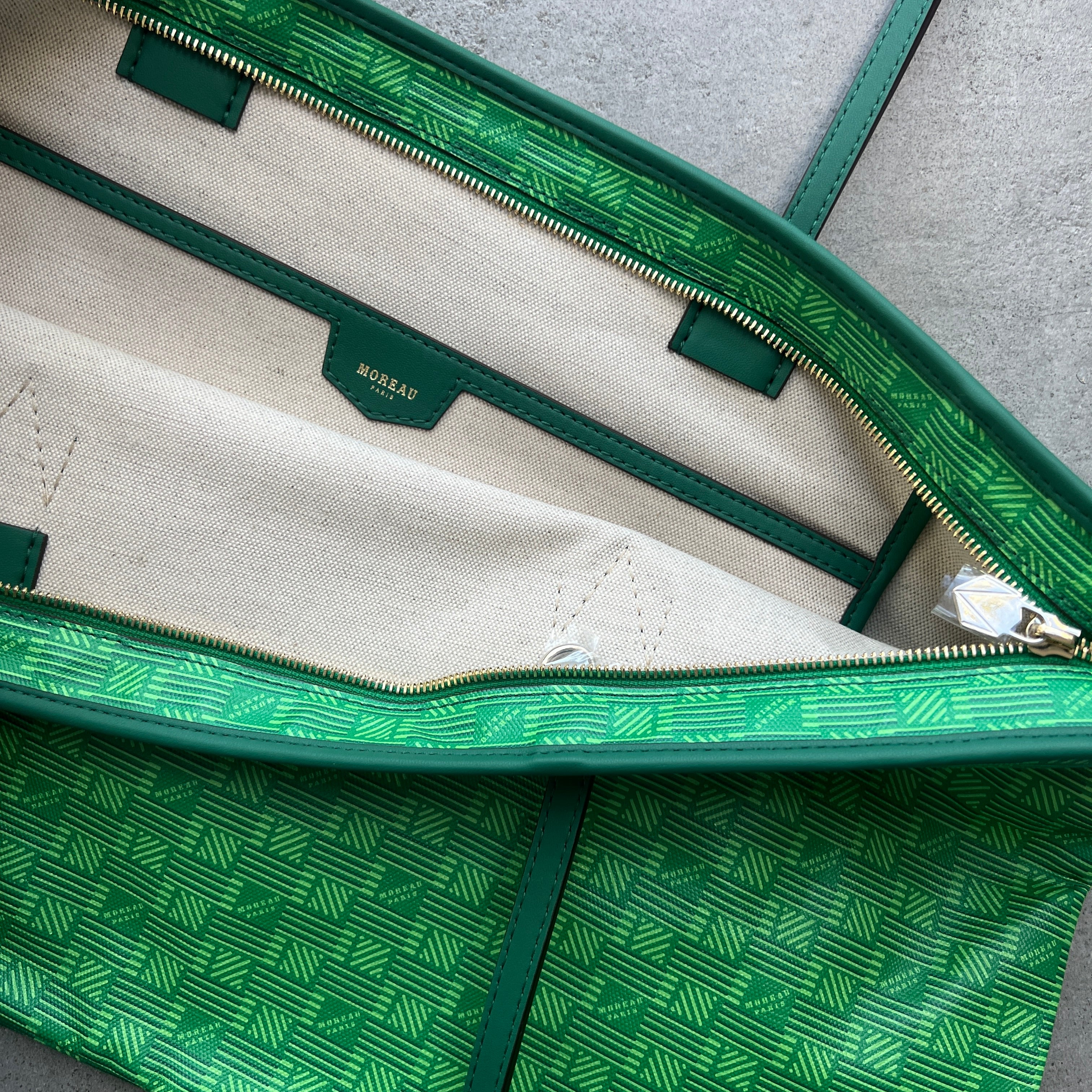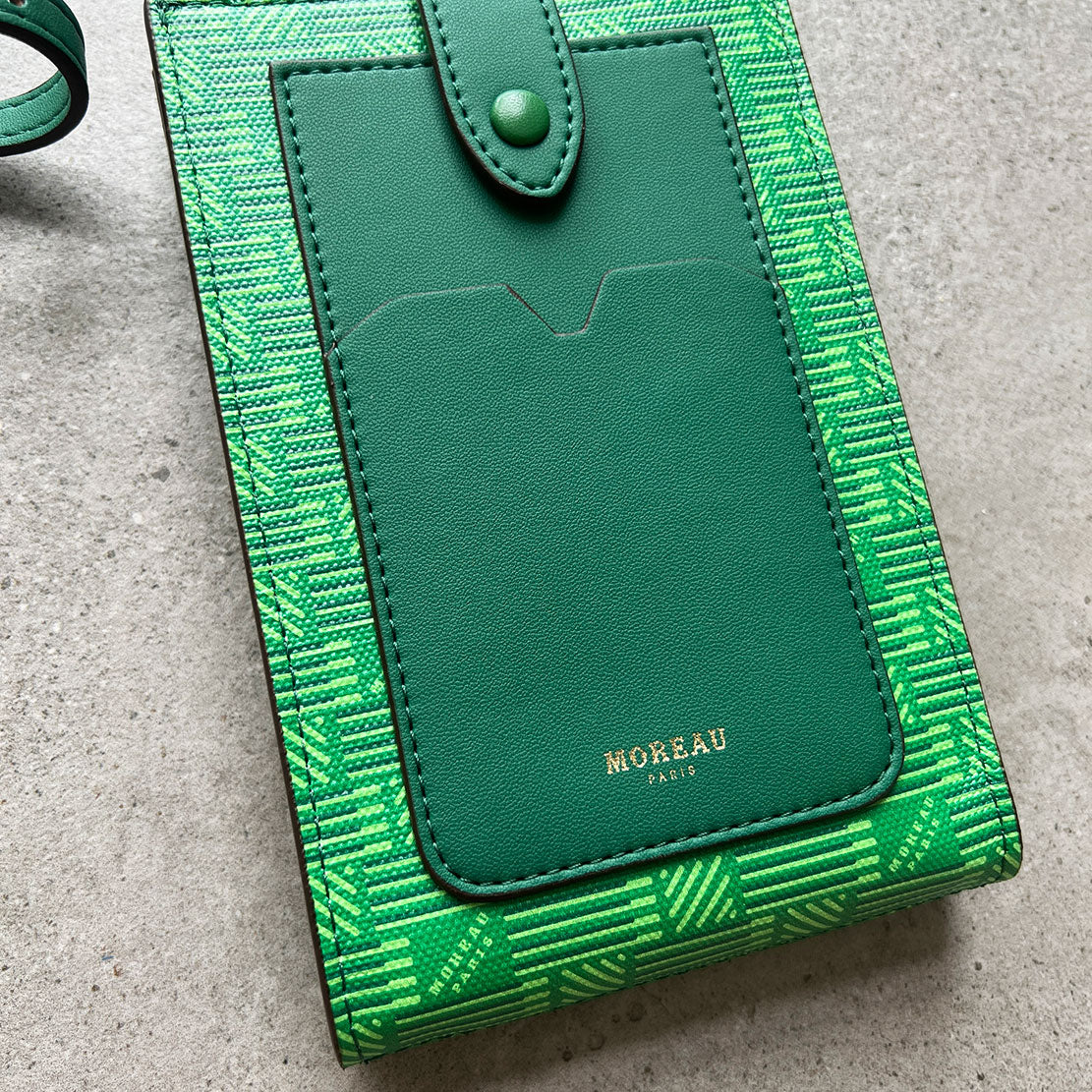 The iconic pattern of Maison Moreau is inspired by the intertwining of wicker stems, which formed the structure of different travel goods in the late 19th century. This unique signature print is reimagined on calf leather with a traditional printing technique that uses a semi-manual paint application, creating vibrant and deep colours.