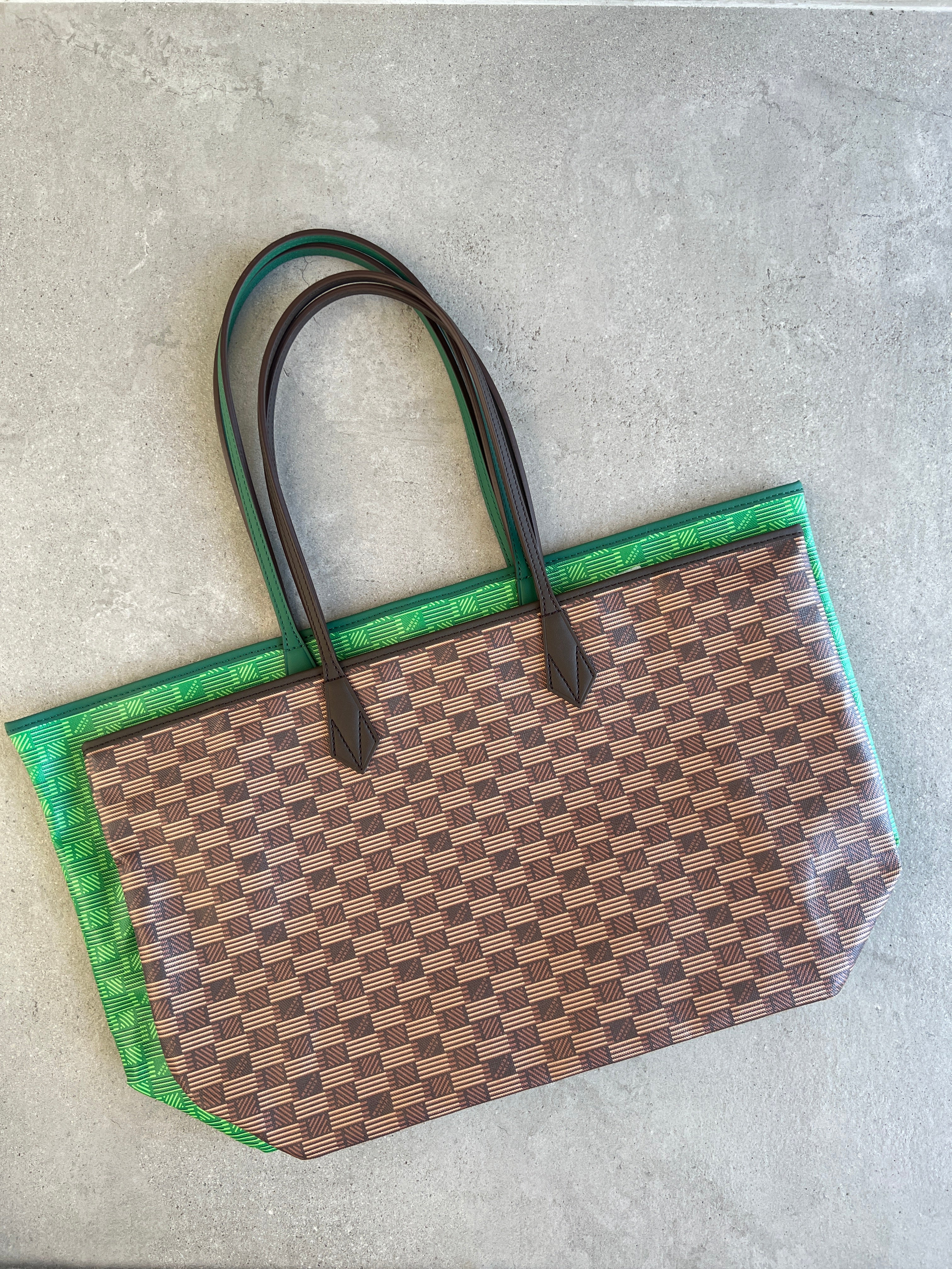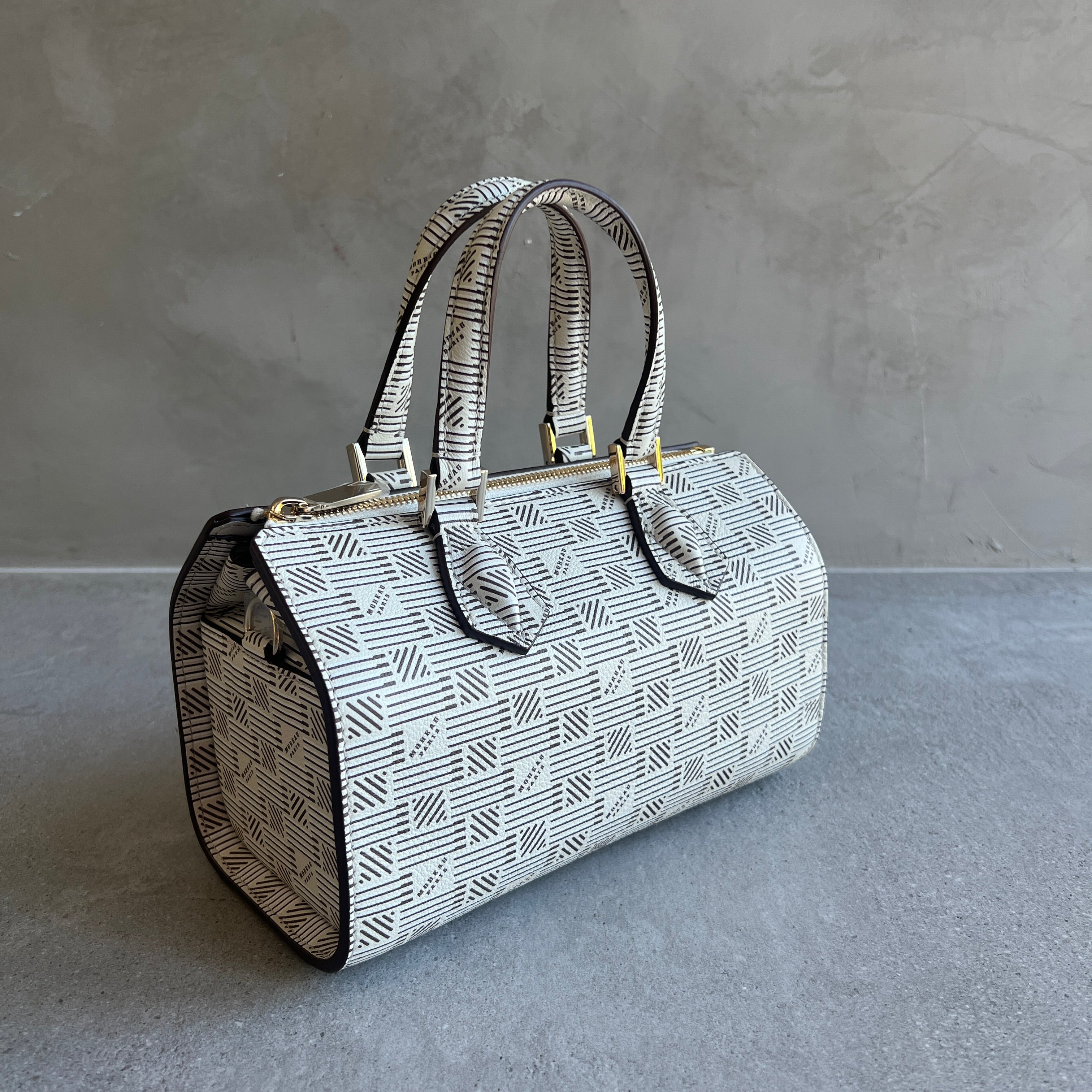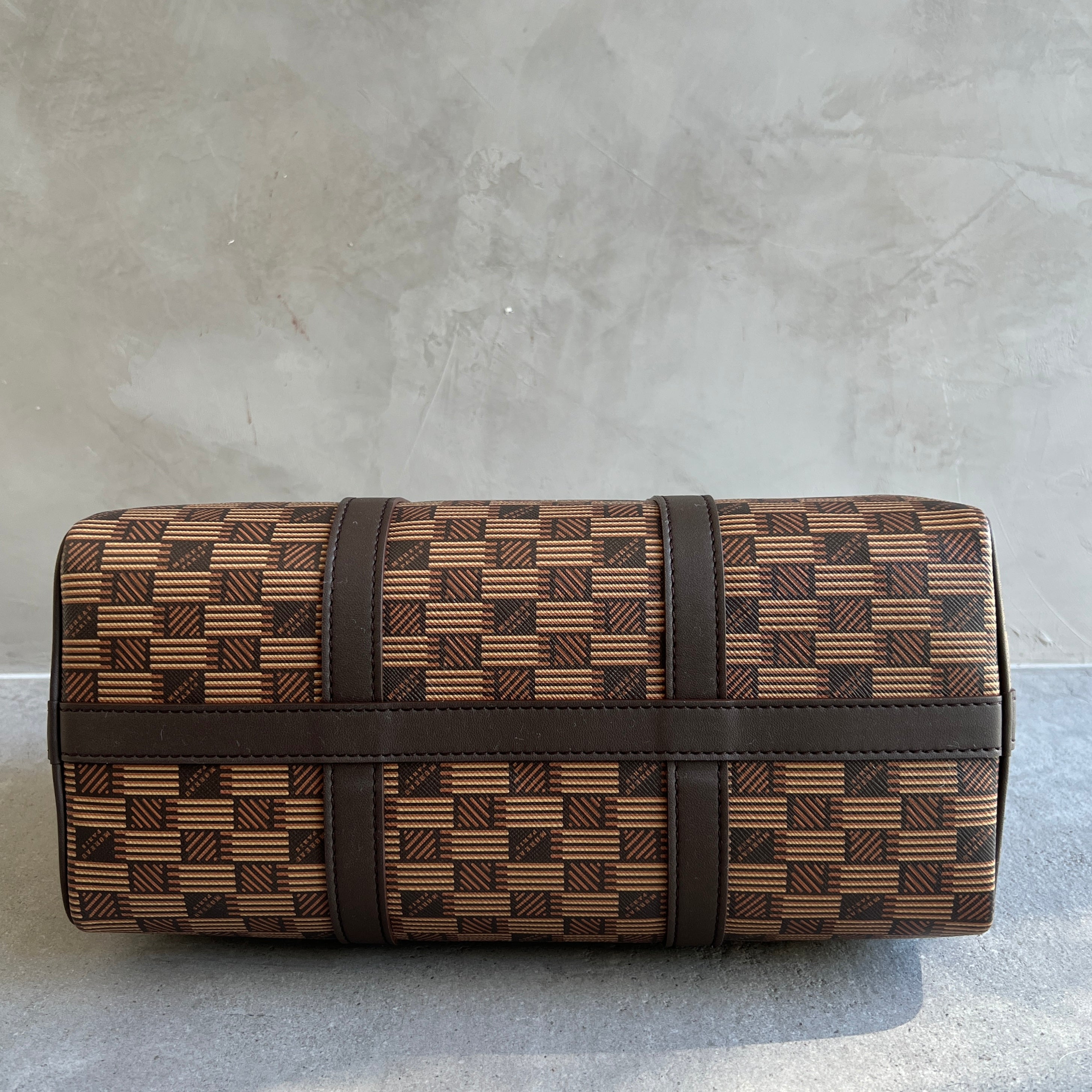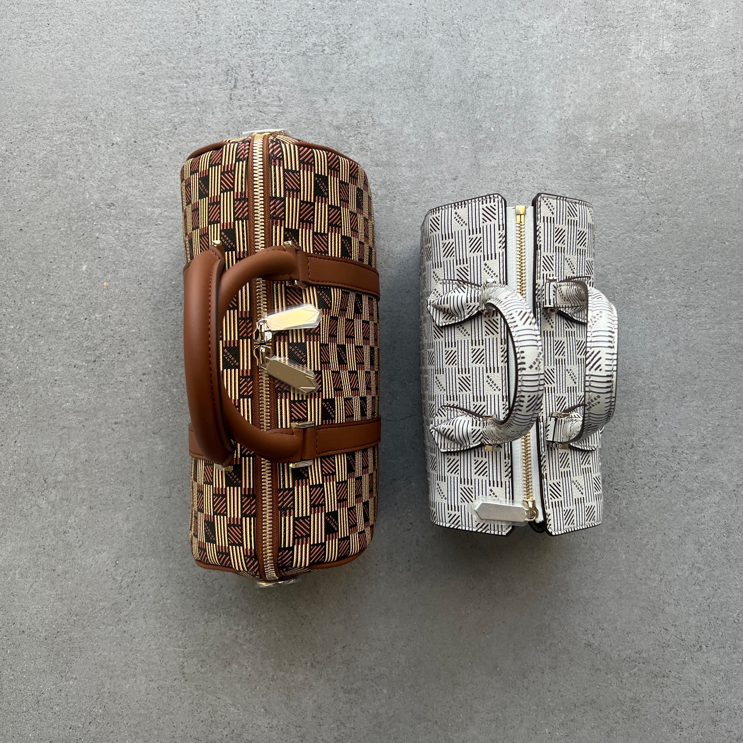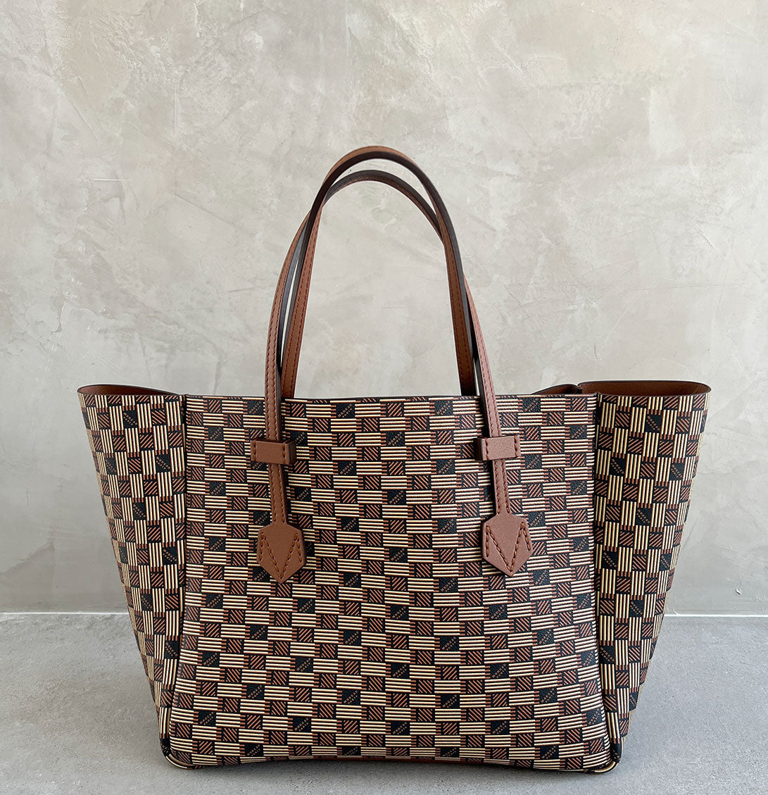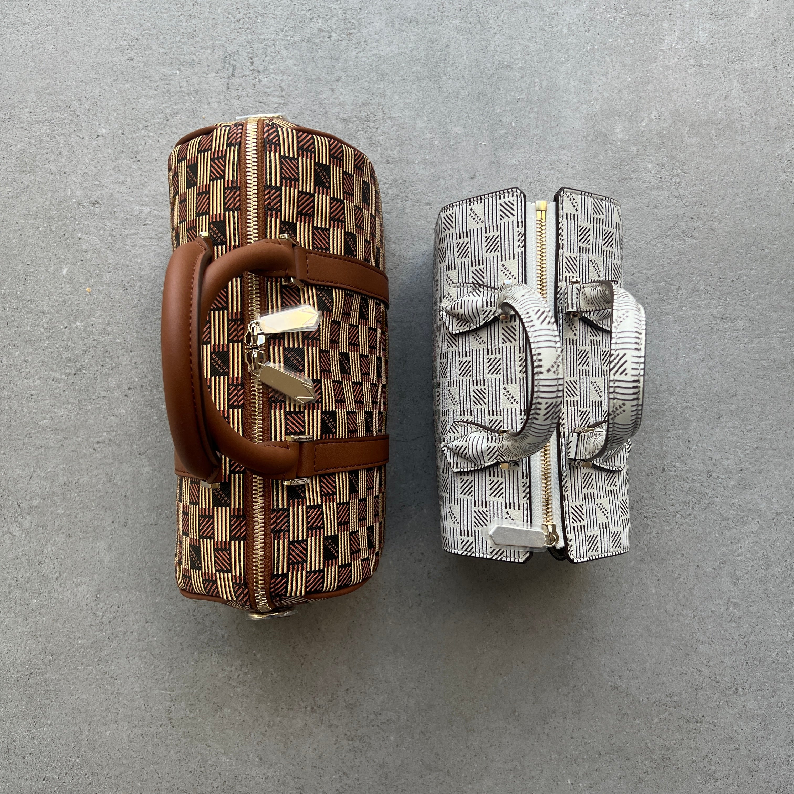 The iconic pattern of Maison Moreau is inspired by the intertwining of wicker stems, which formed the structure of different travel goods in the late 19th century. This unique signature print is reimagined on calf leather with a traditional printing technique that uses a semi-manual paint application, creating vibrant and deep colours.
