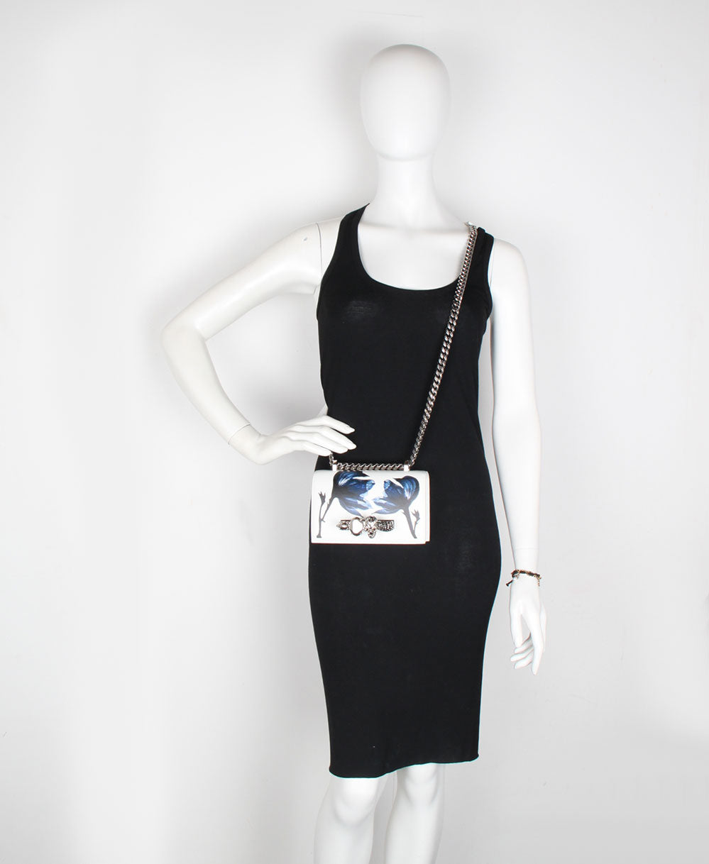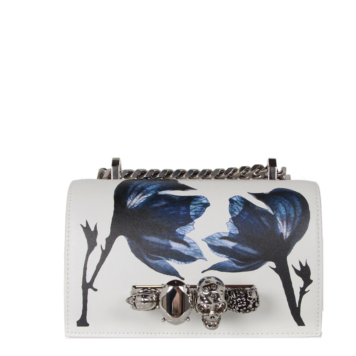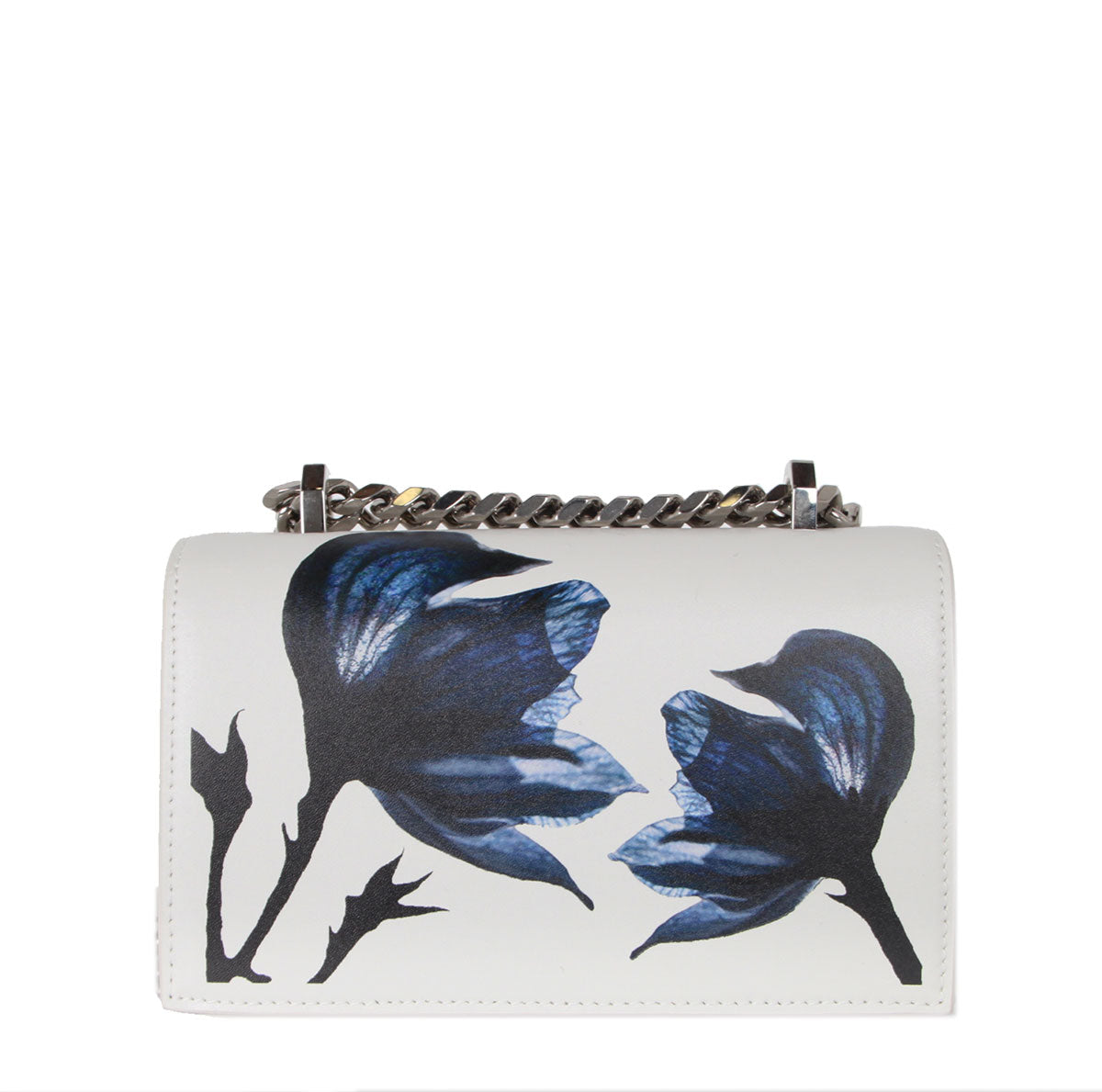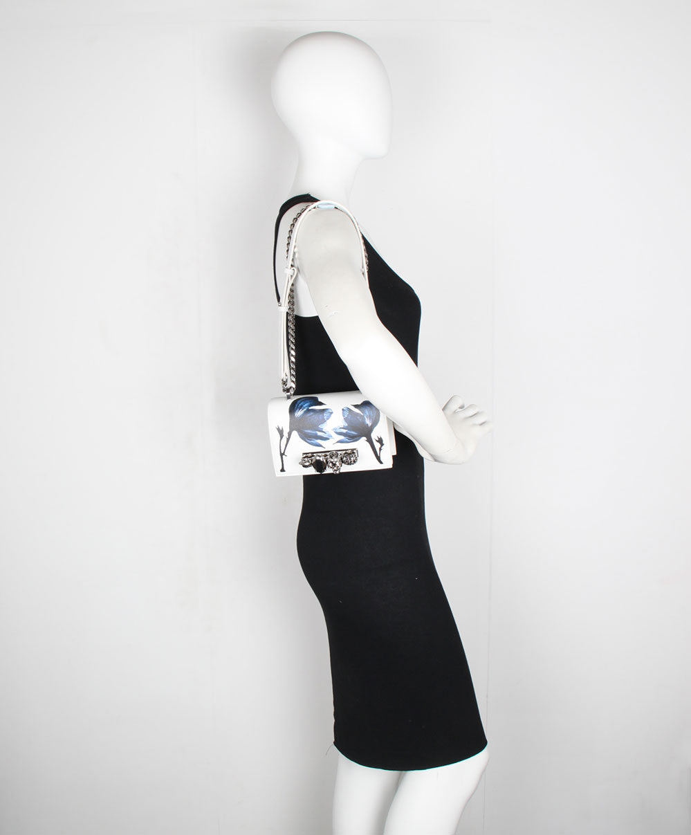 Alexander McQueen Mini Jewelled Satchel in smooth white calfskin with blue floral print.  This bag can be worn in multiple ways: Carry it in your hand using the ring handle or by doubling up the straps. Alternatively, wear over the shoulder or across the body using the leather and chain straps.