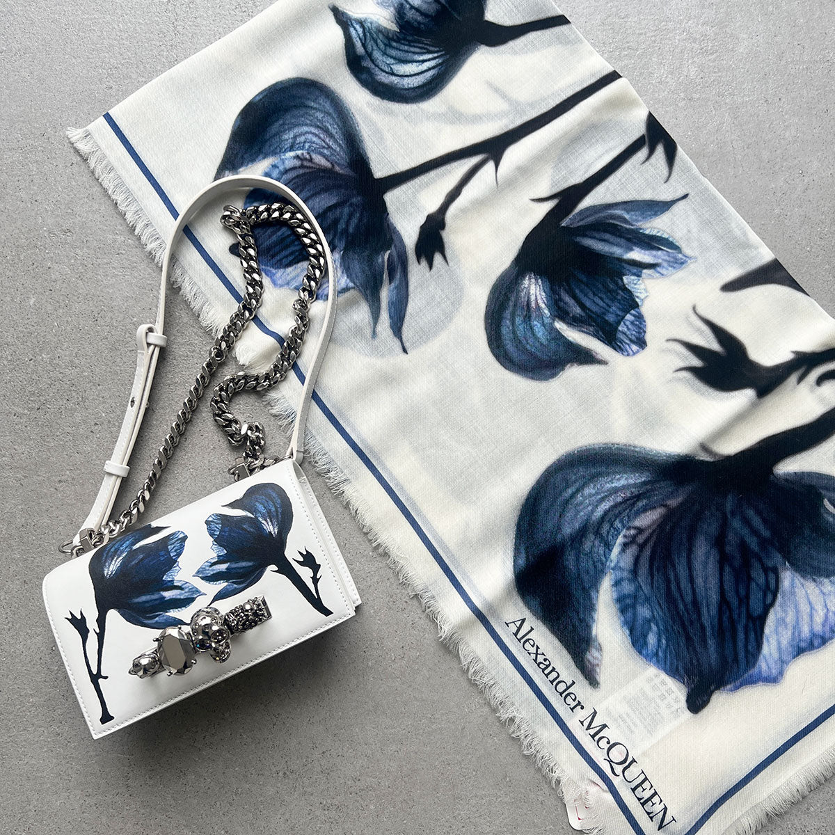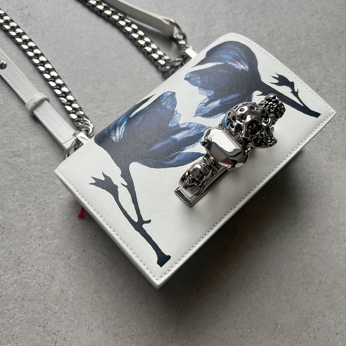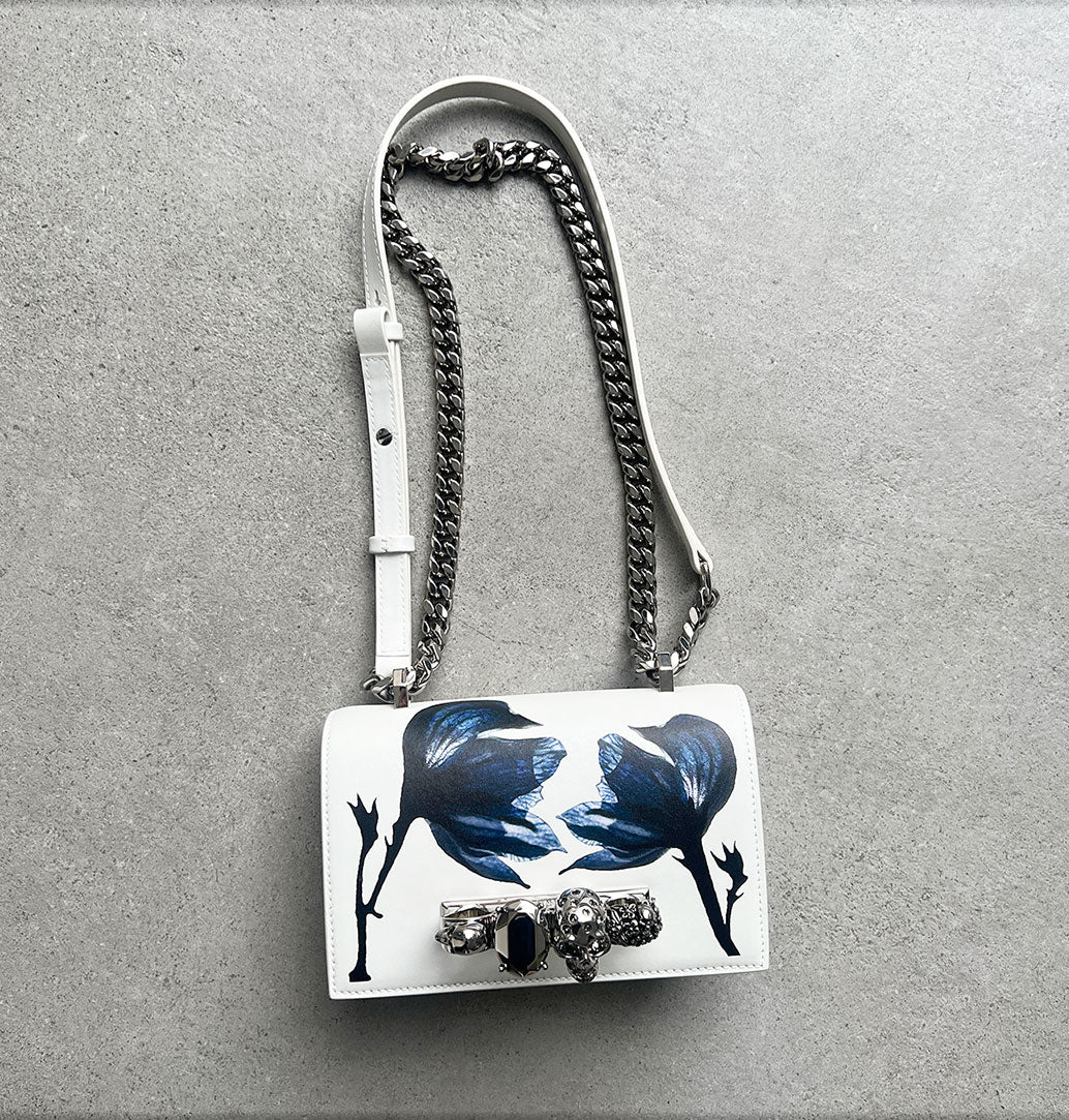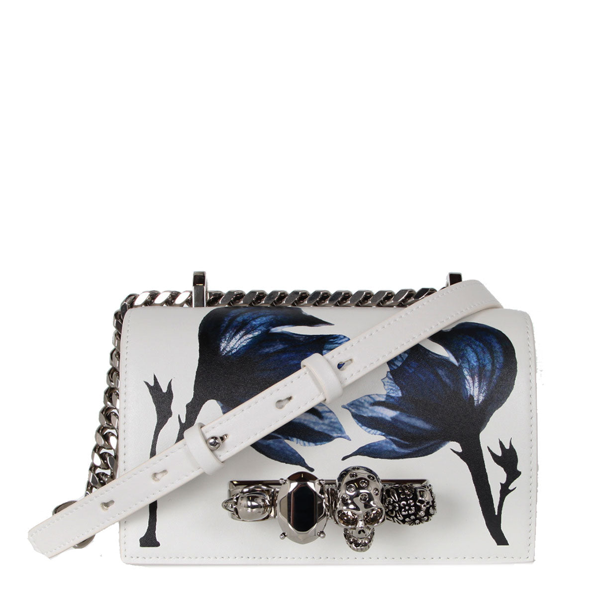Alexander McQueen Mini Jewelled Satchel in smooth white calfskin with blue floral print.  This bag can be worn in multiple ways: Carry it in your hand using the ring handle or by doubling up the straps. Alternatively, wear over the shoulder or across the body using the leather and chain straps.