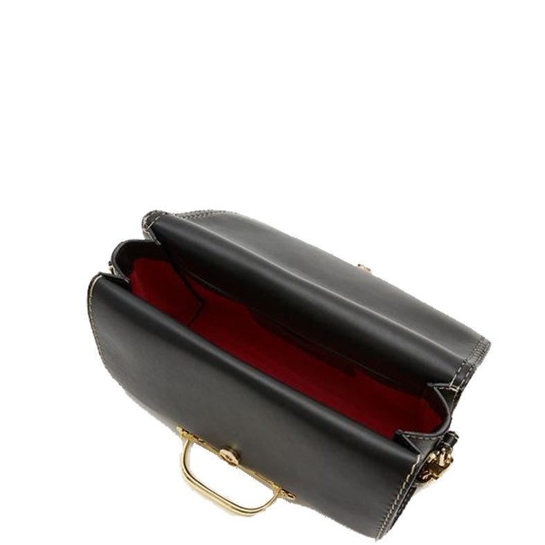 The Story Shoulder Bag in black smooth calf leather featuring tonal leather knots and a brass-finished organic metal handle adorned with two studs. The bag can be worn multiple ways: Hand-held by placing your hand through the front metal handle or worn over the shoulder using the chain strap.