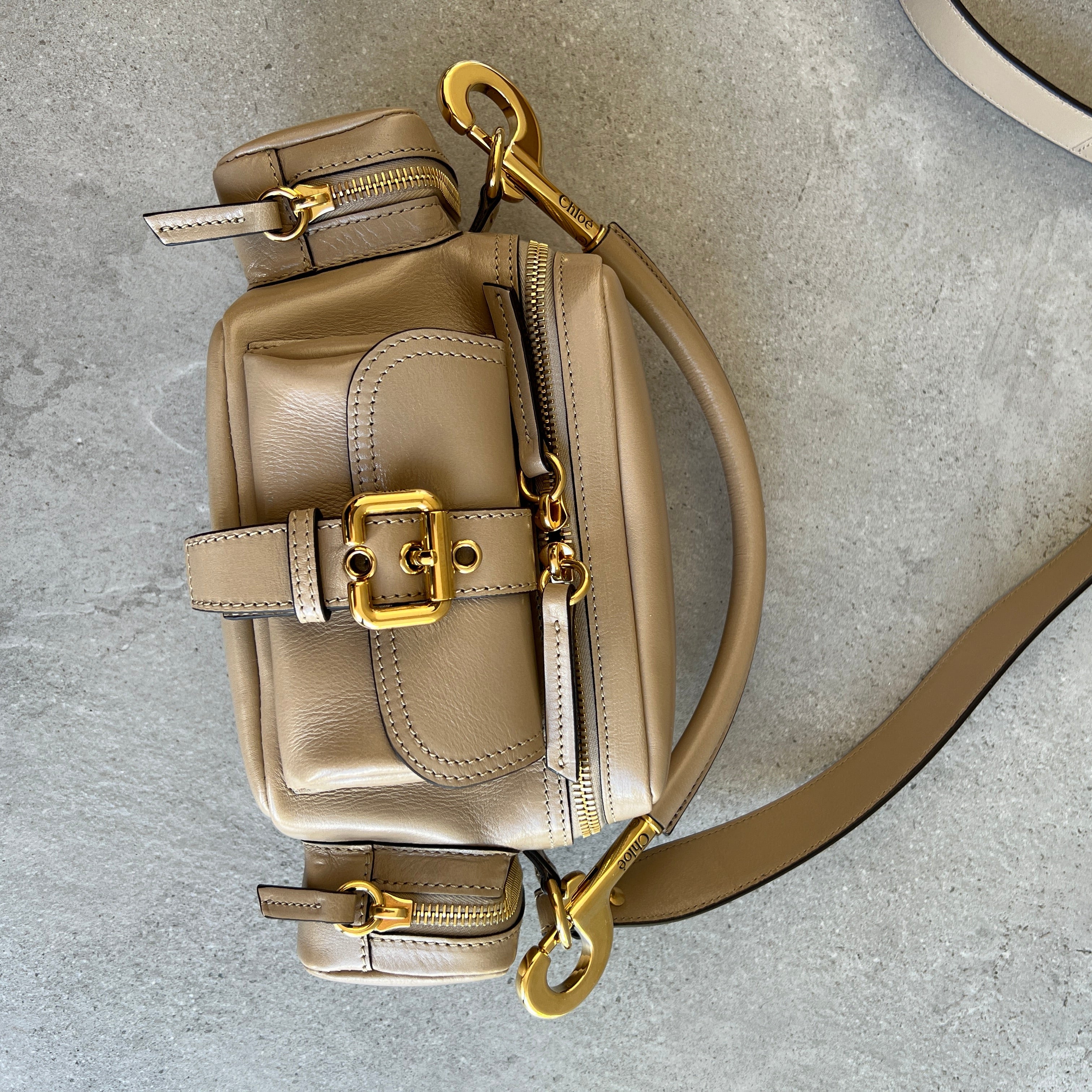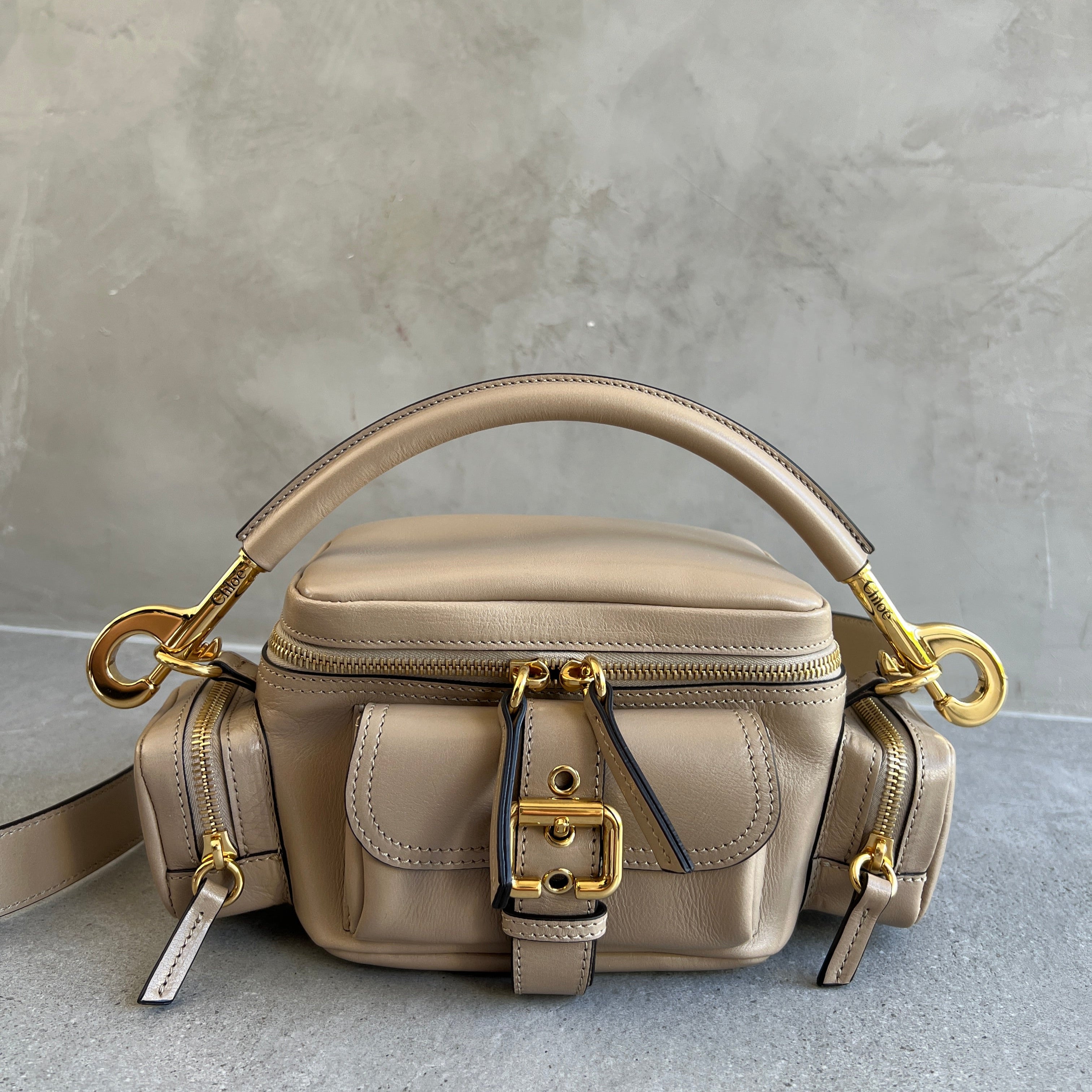 This Camera bag is crafted from natural shiny buffalo leather. Its multiple pockets are embellished with revamped buckles from the iconic Paddington bag.