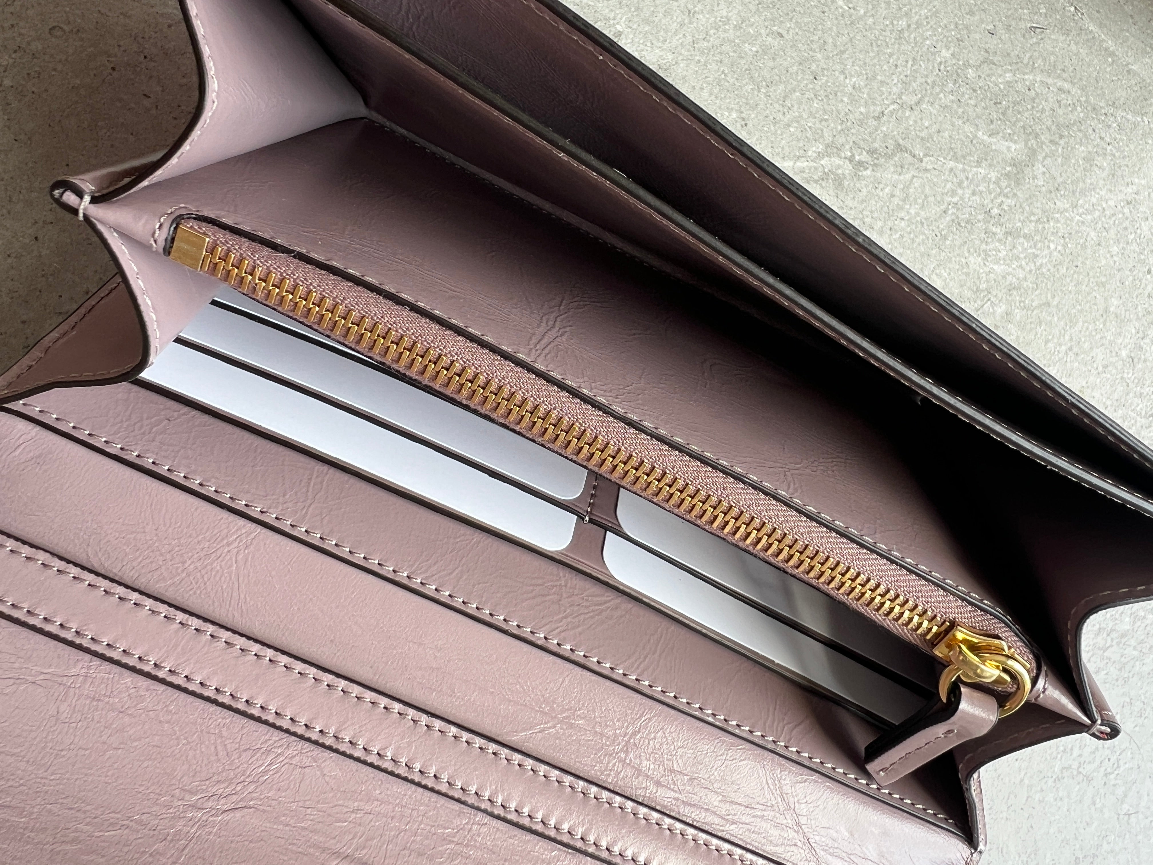 This flap wallet is made from soft metallic leather which may create smooth or light halos. If the leather gets wet, dry it with a soft white cloth to absorb water. With use, the leather may become marked and shiny.