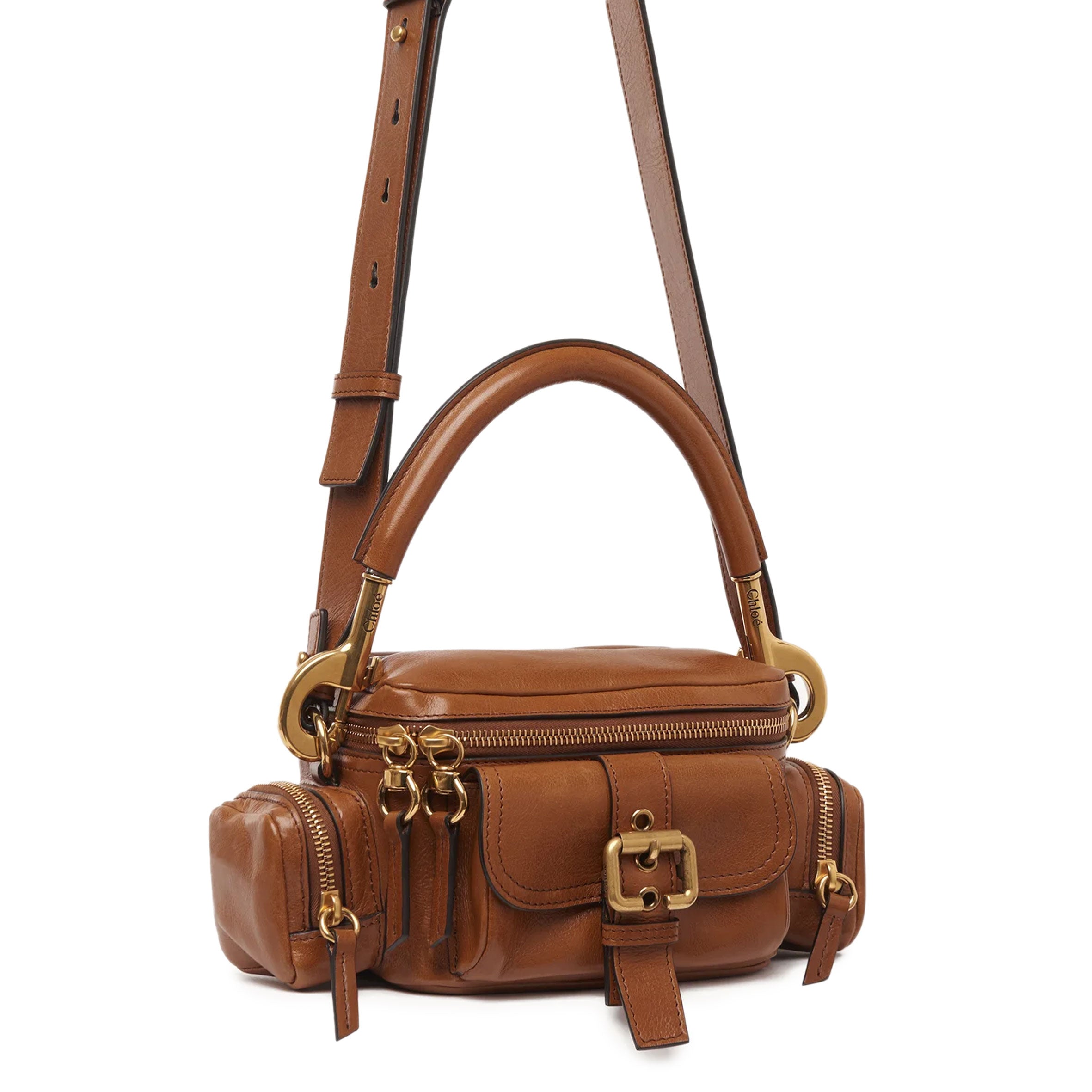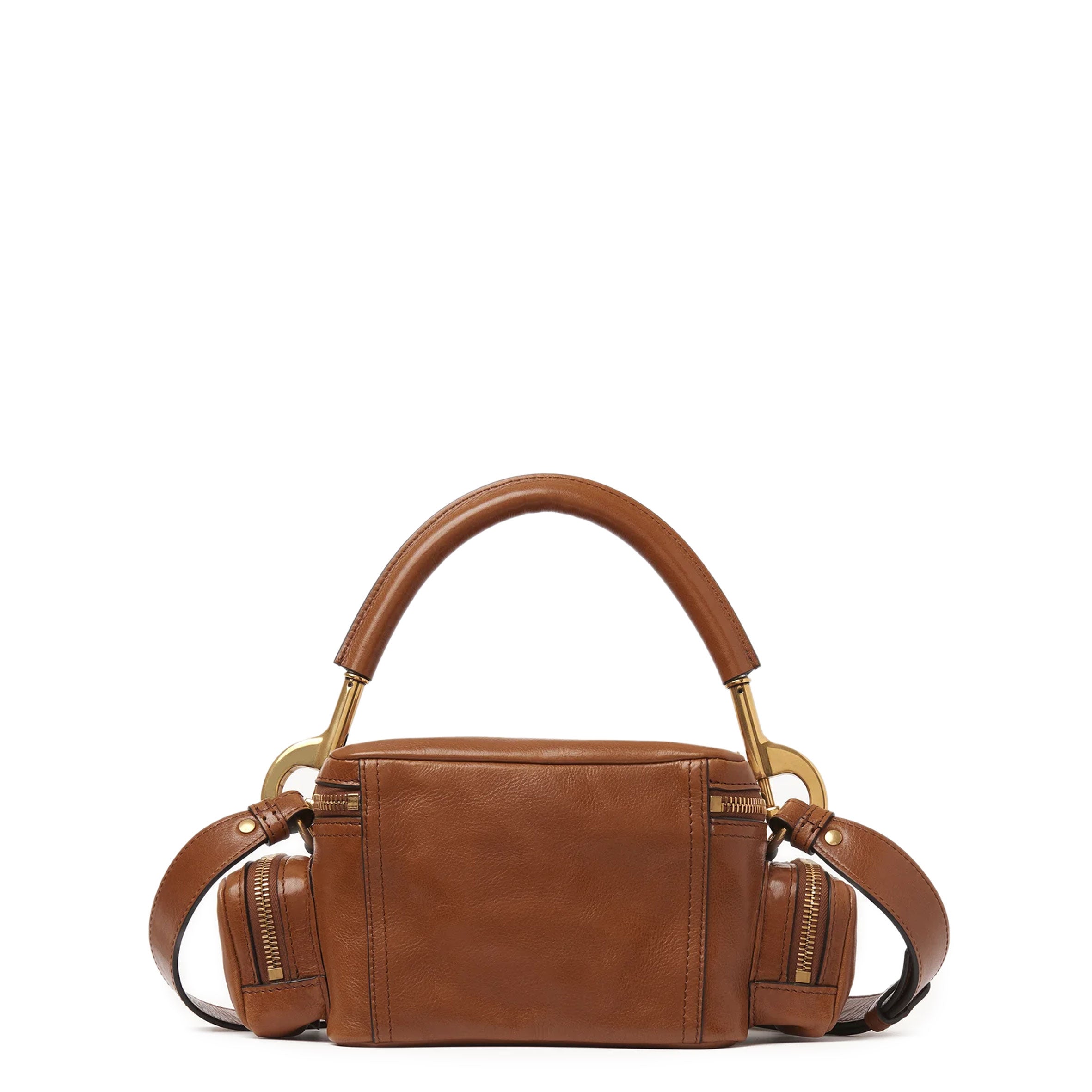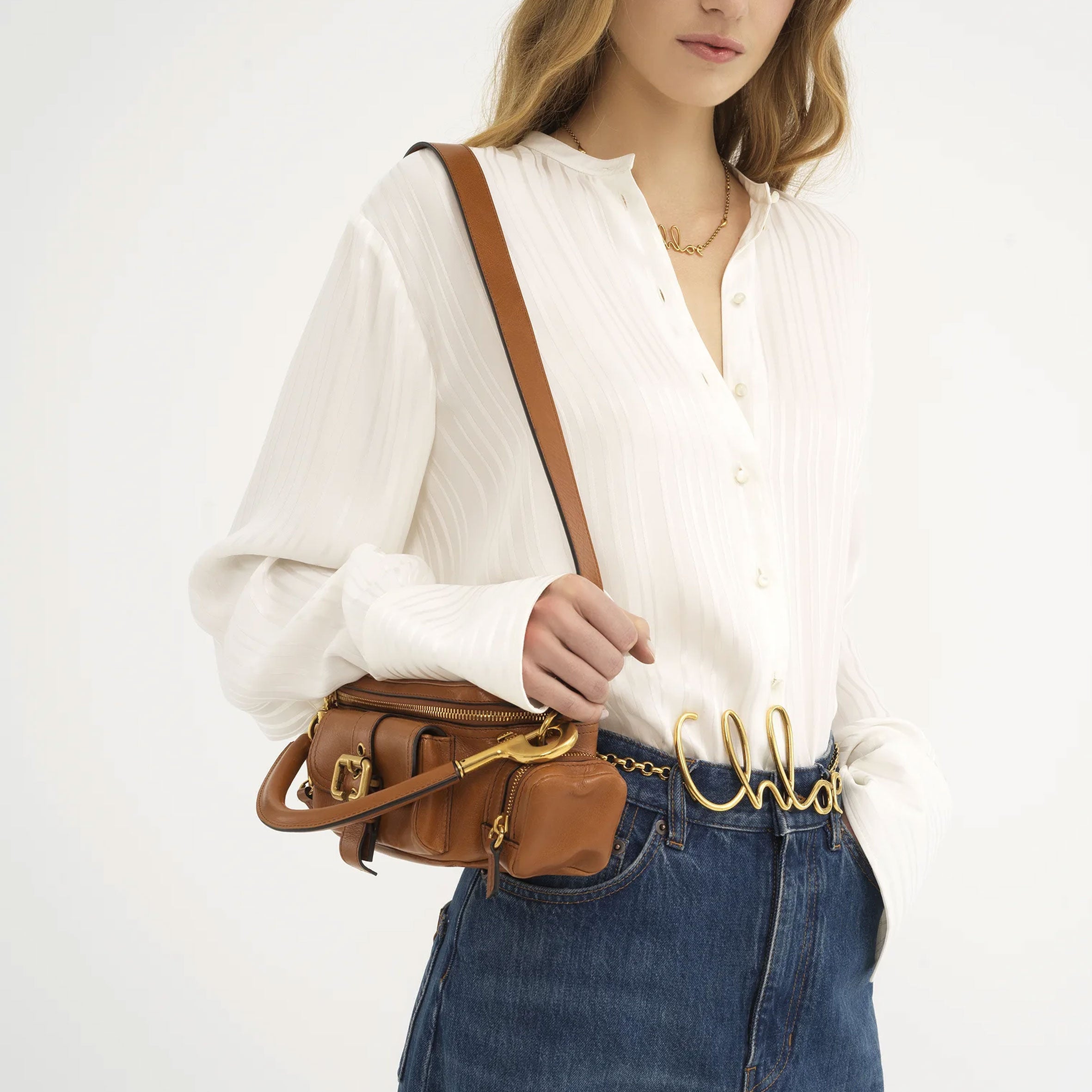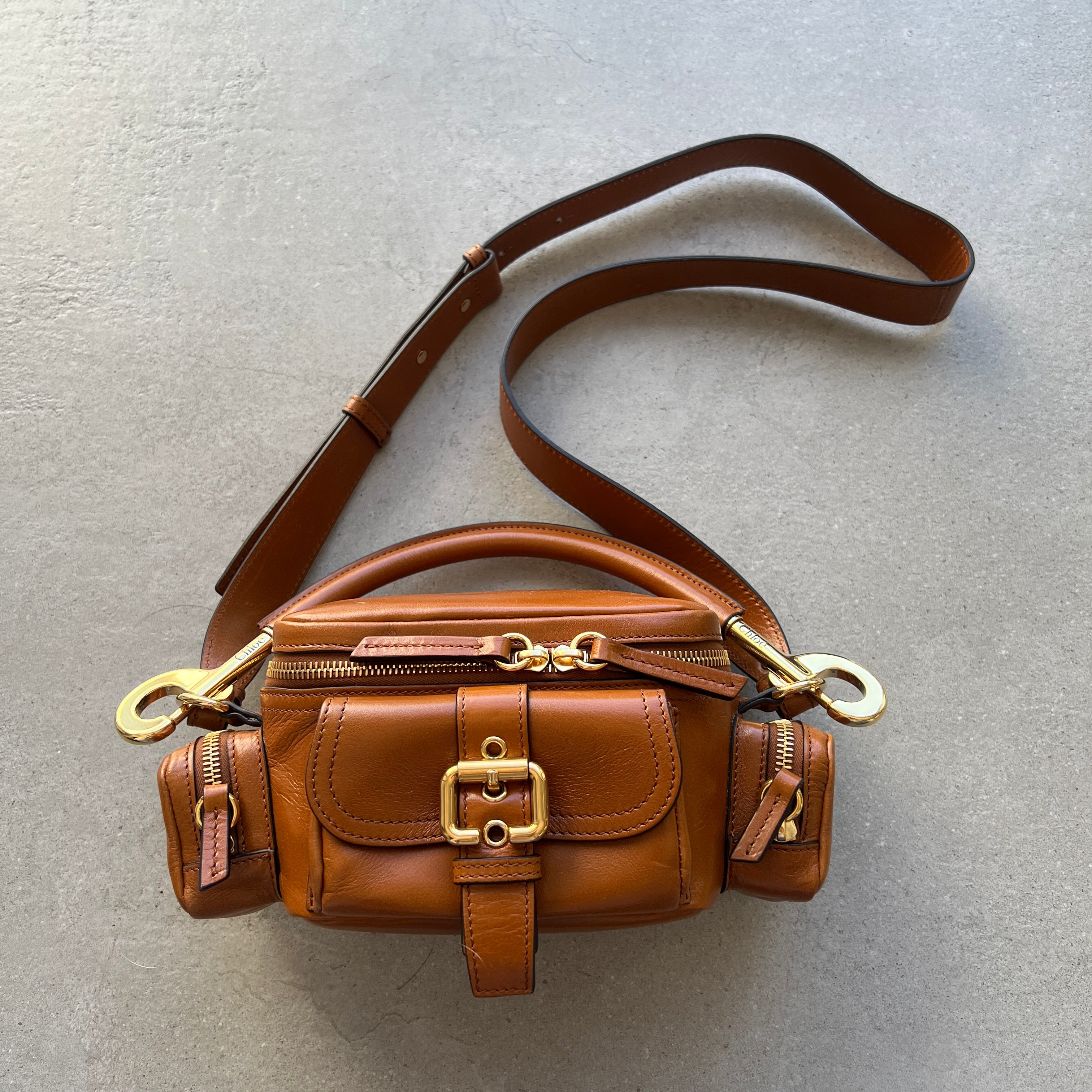 This small Camera bag is crafted from natural shiny buffalo leather. Its multiple pockets are embellished with revamped zippers and buckles from the iconic Paddington bag.