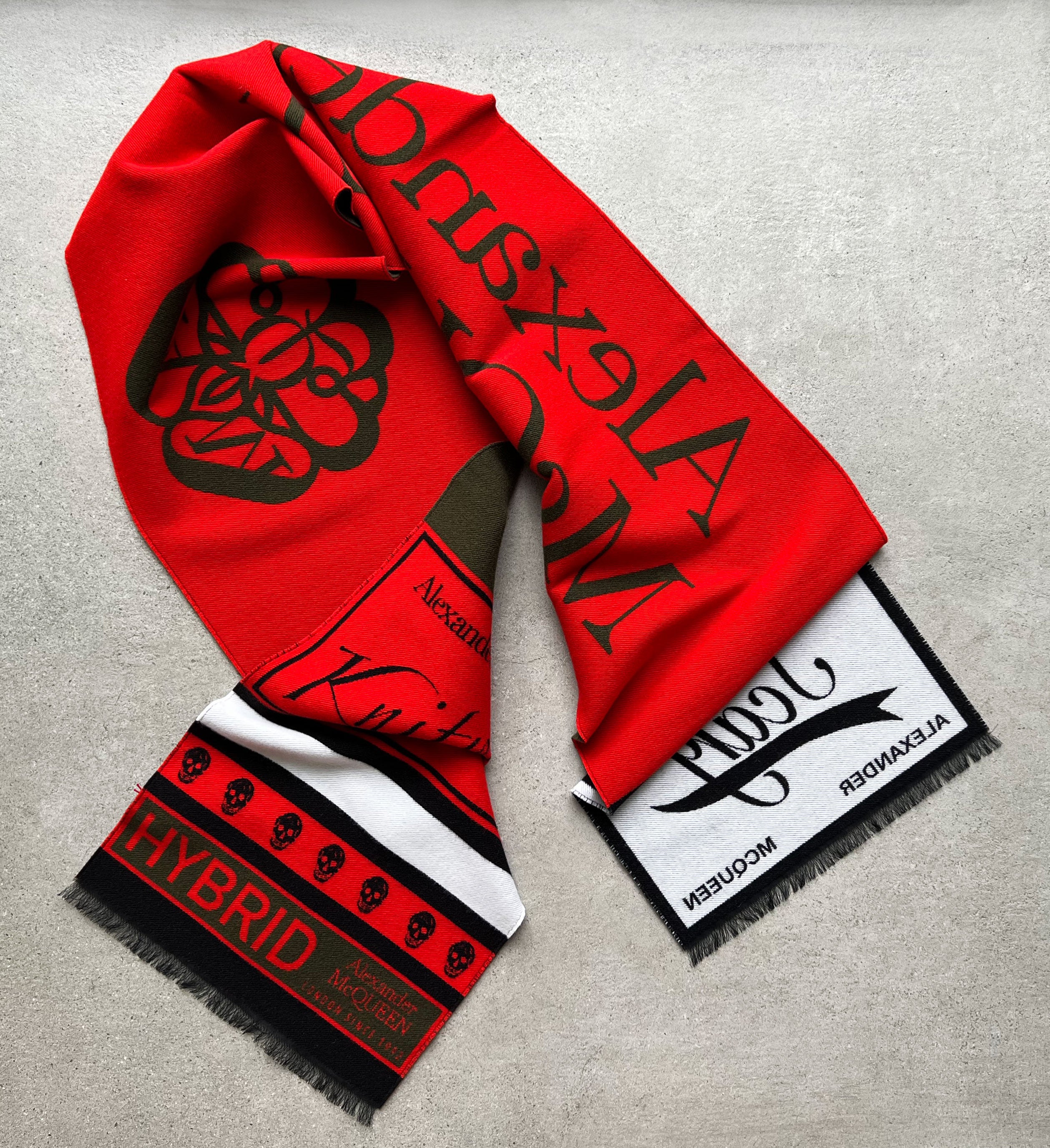 Military green and orange wool jacquard graphic sport scarf with Alexander McQueen signatures and motifs. Finished with frayed edges.