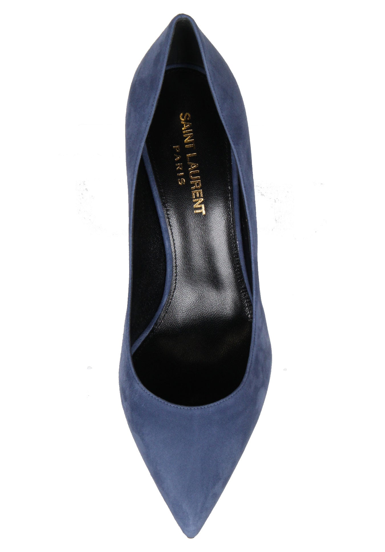 Signature Saint Laurent pump with square covered stiletto 85mm high heel and low-cut vamp. Suede goatskin leather in "Denim" blue colour with brown wood heel.