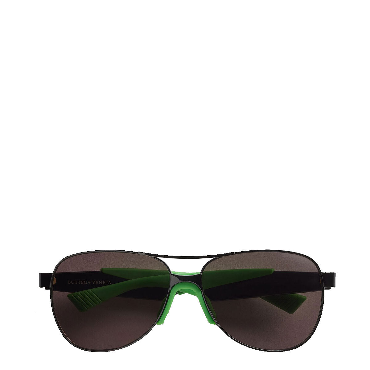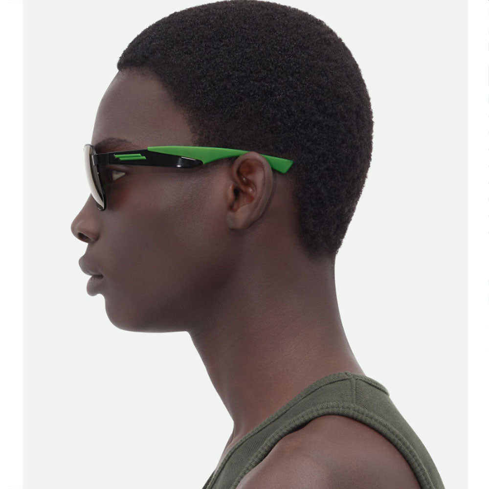 An acetate aviator style with grey bio nylon lenses finished with a green rubber on the end.