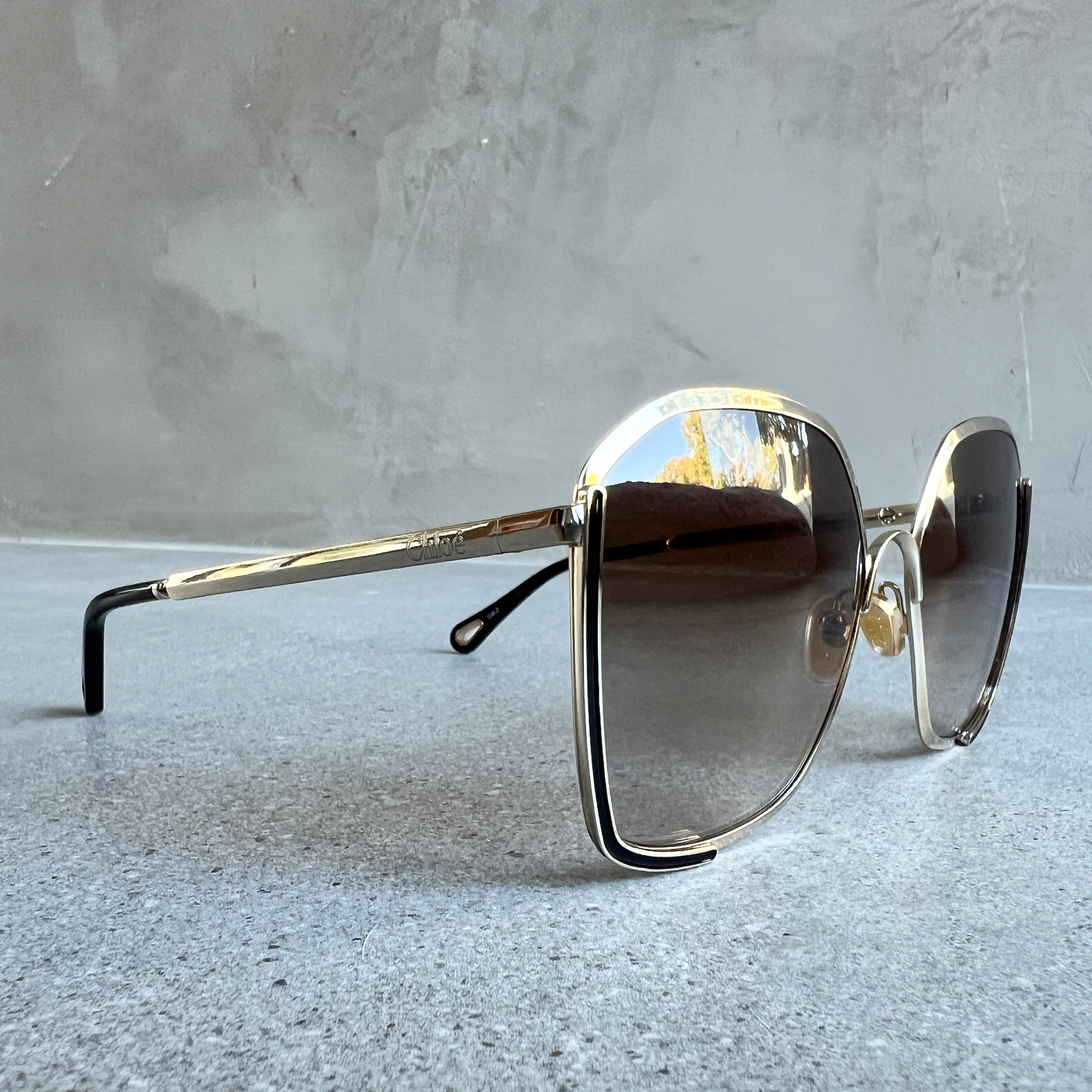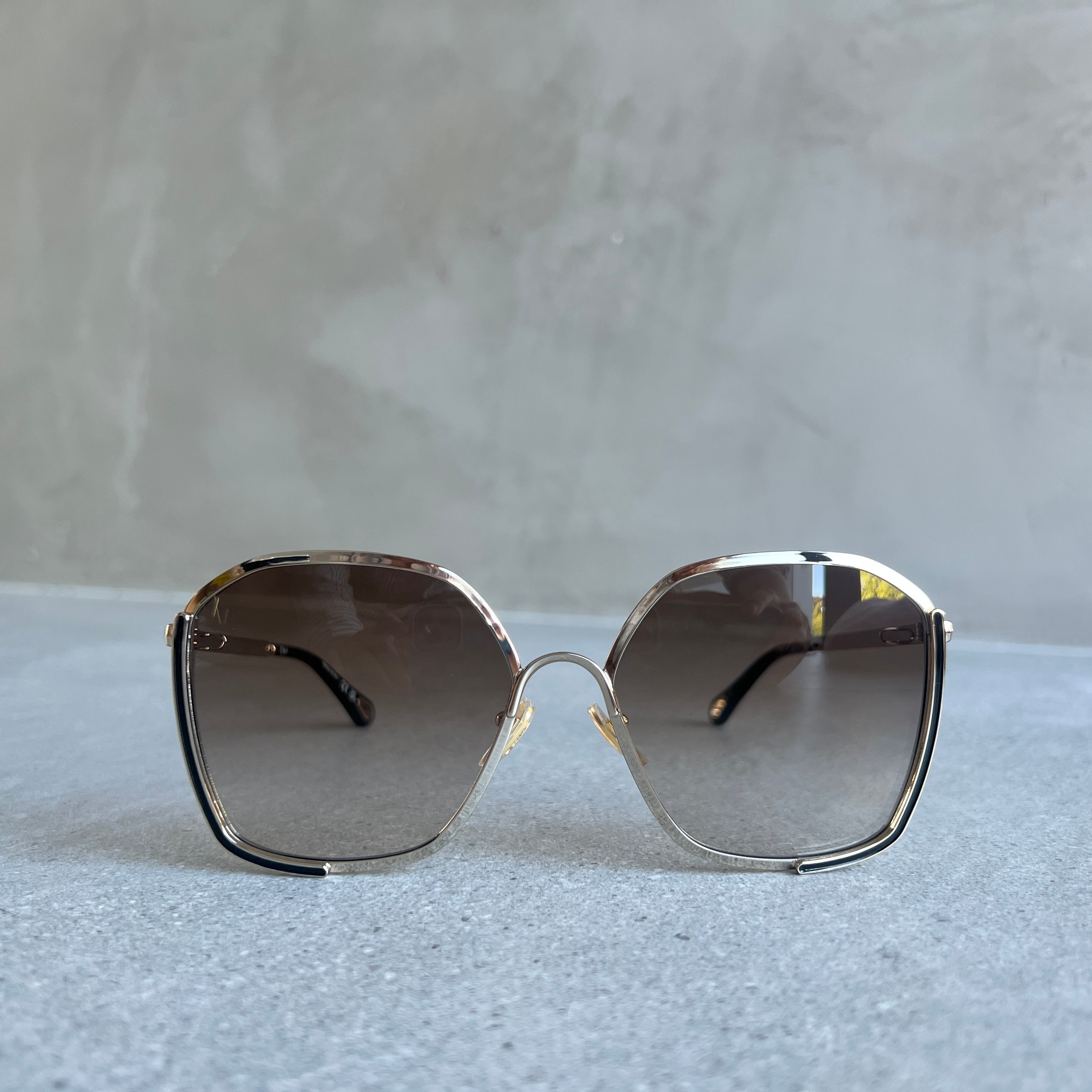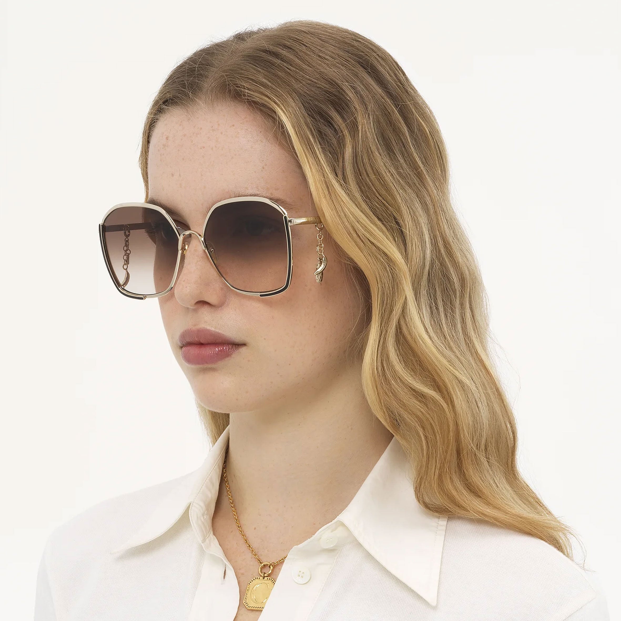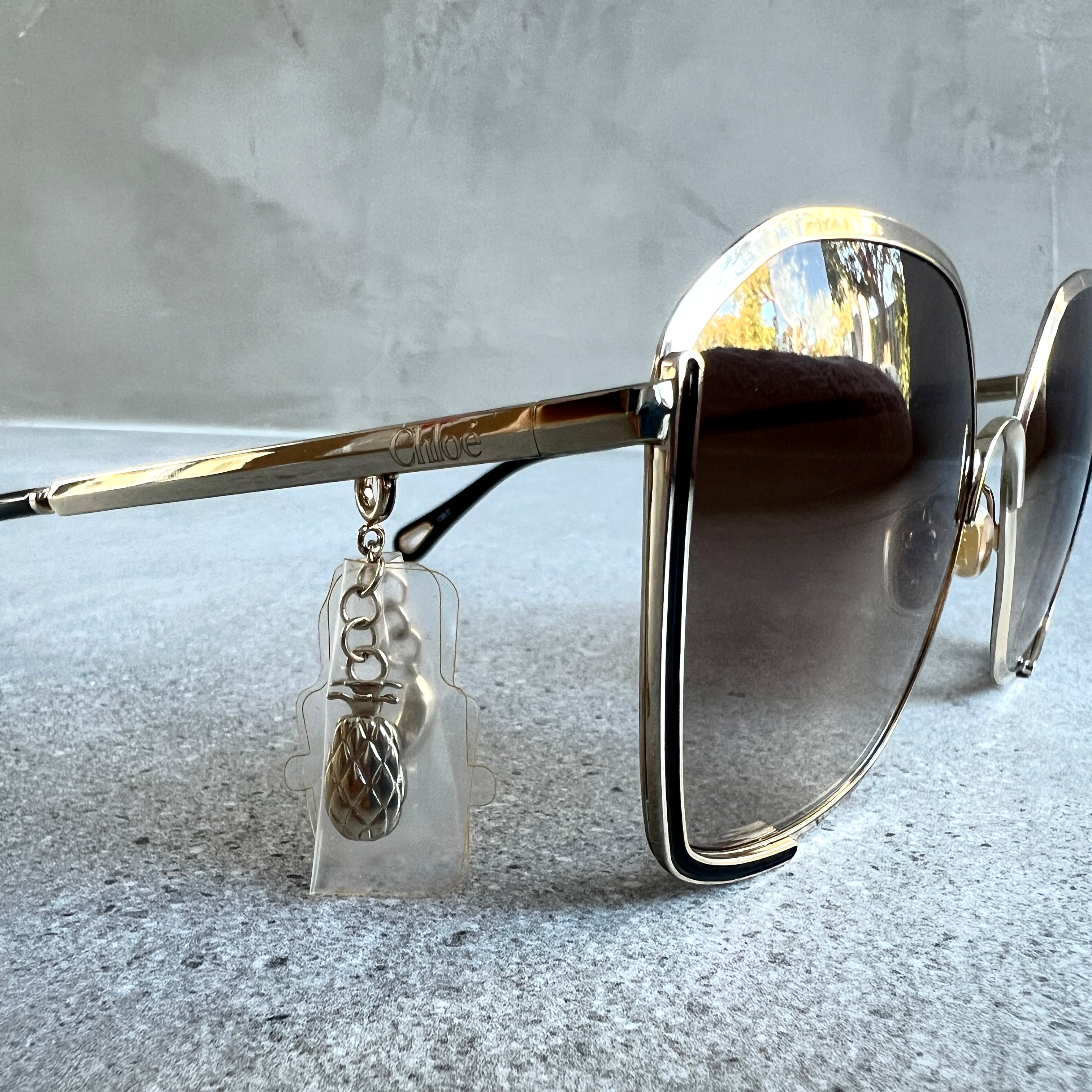 These Chloé Charms square sunglasses feature a lightweight gold metal frame with black enamel inserts and gradient brown lenses.