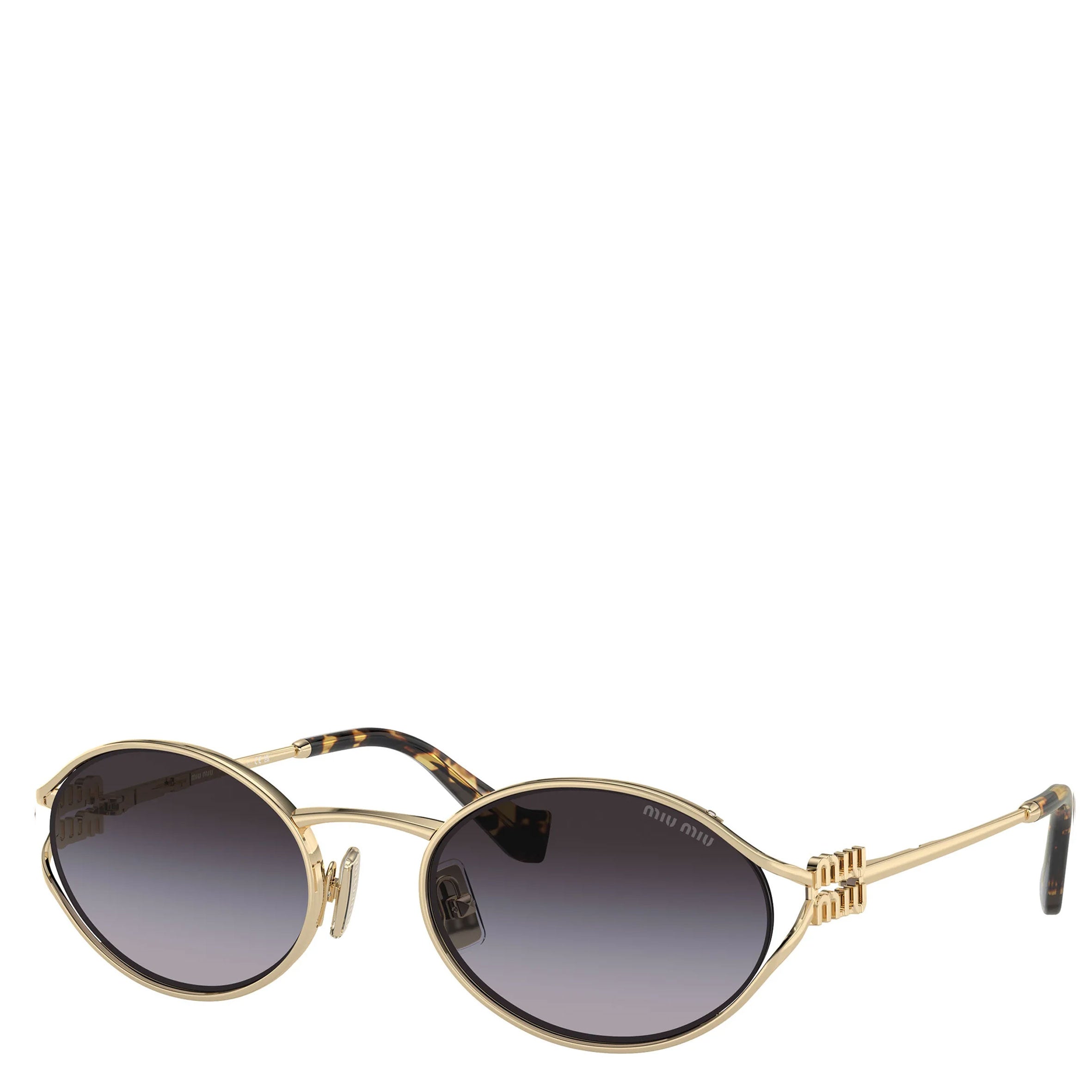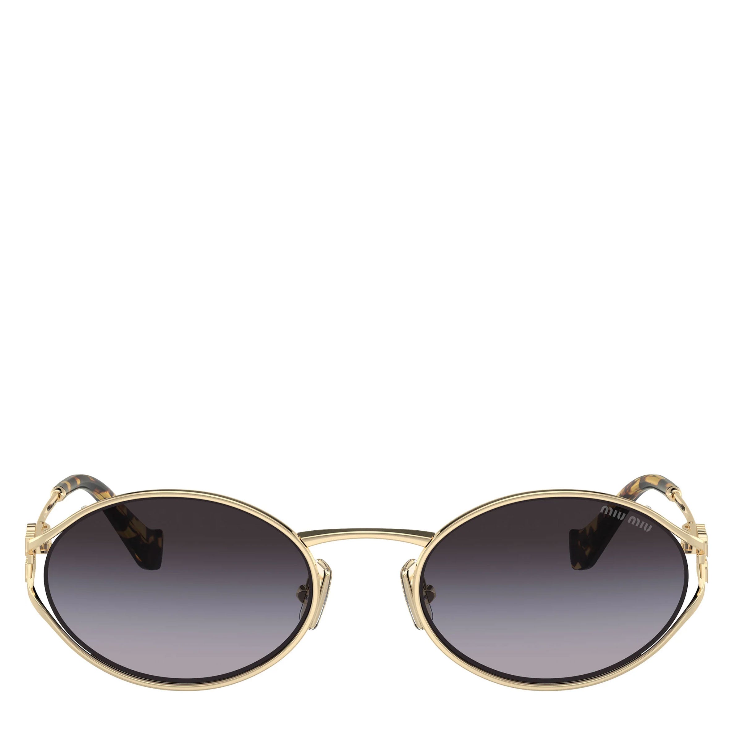 Miu Miu sunglasses model MU 52YS featuring pale gold full rim metal frame and CR-39 grey gradient lenses.