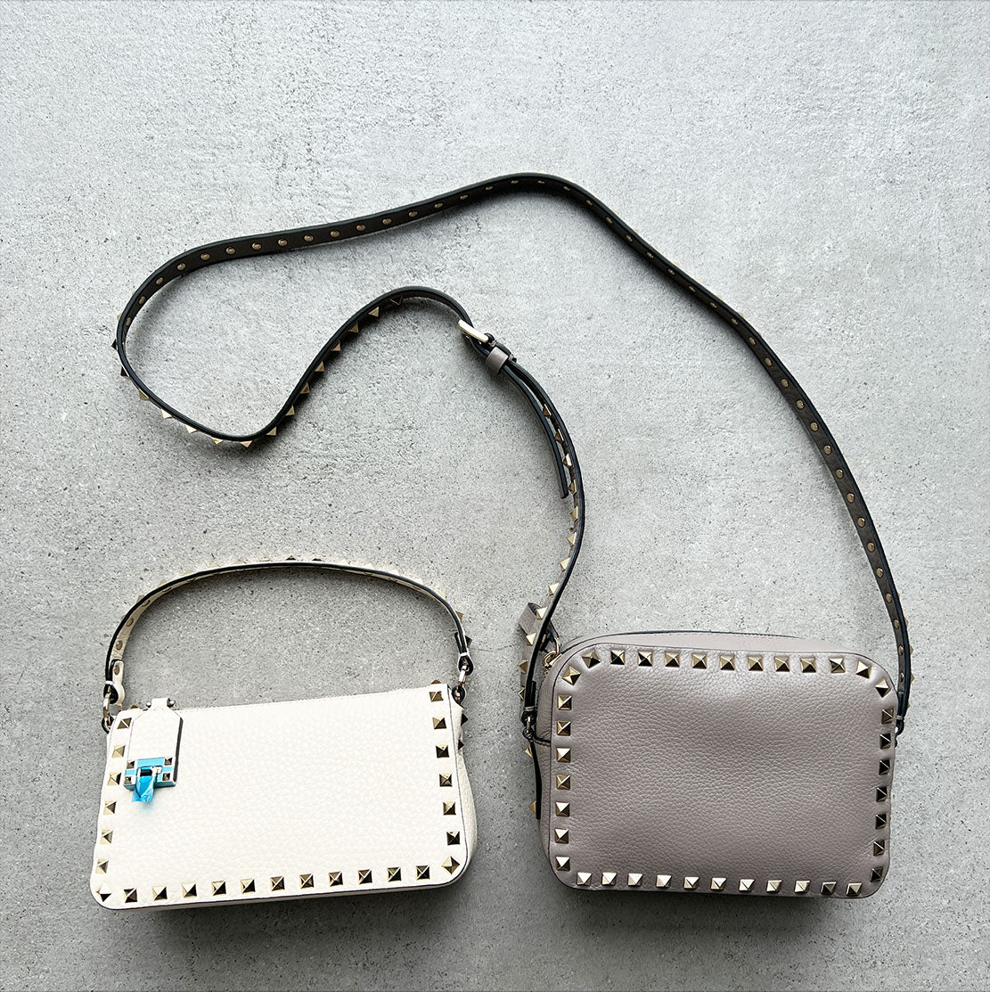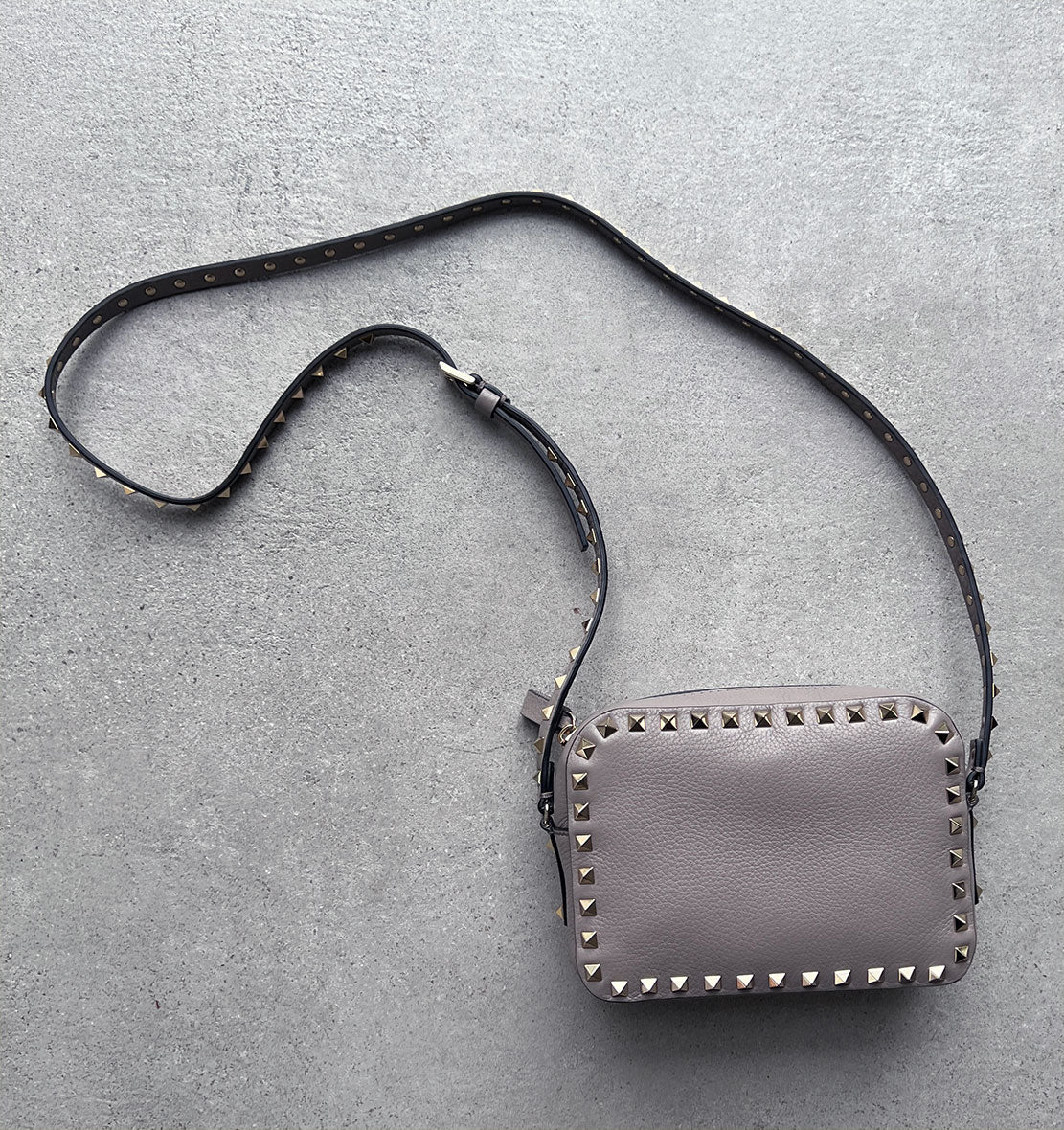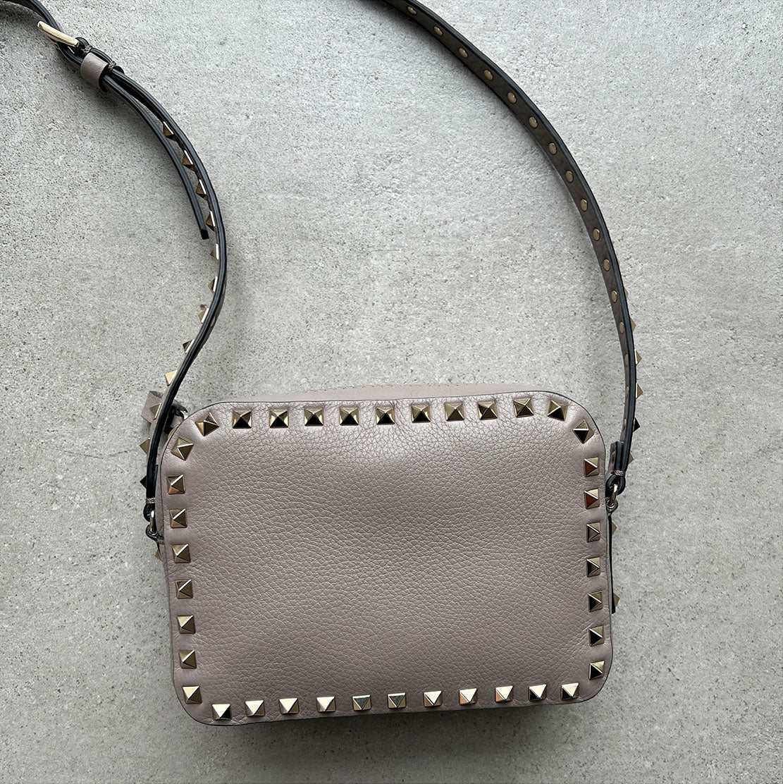 Valentino Garavani Rockstud cross body bag in grained calfskin. Platinum tone studs and metal hardware with a top zip closure. Adjustable studded strap. Interior has an open pocket.