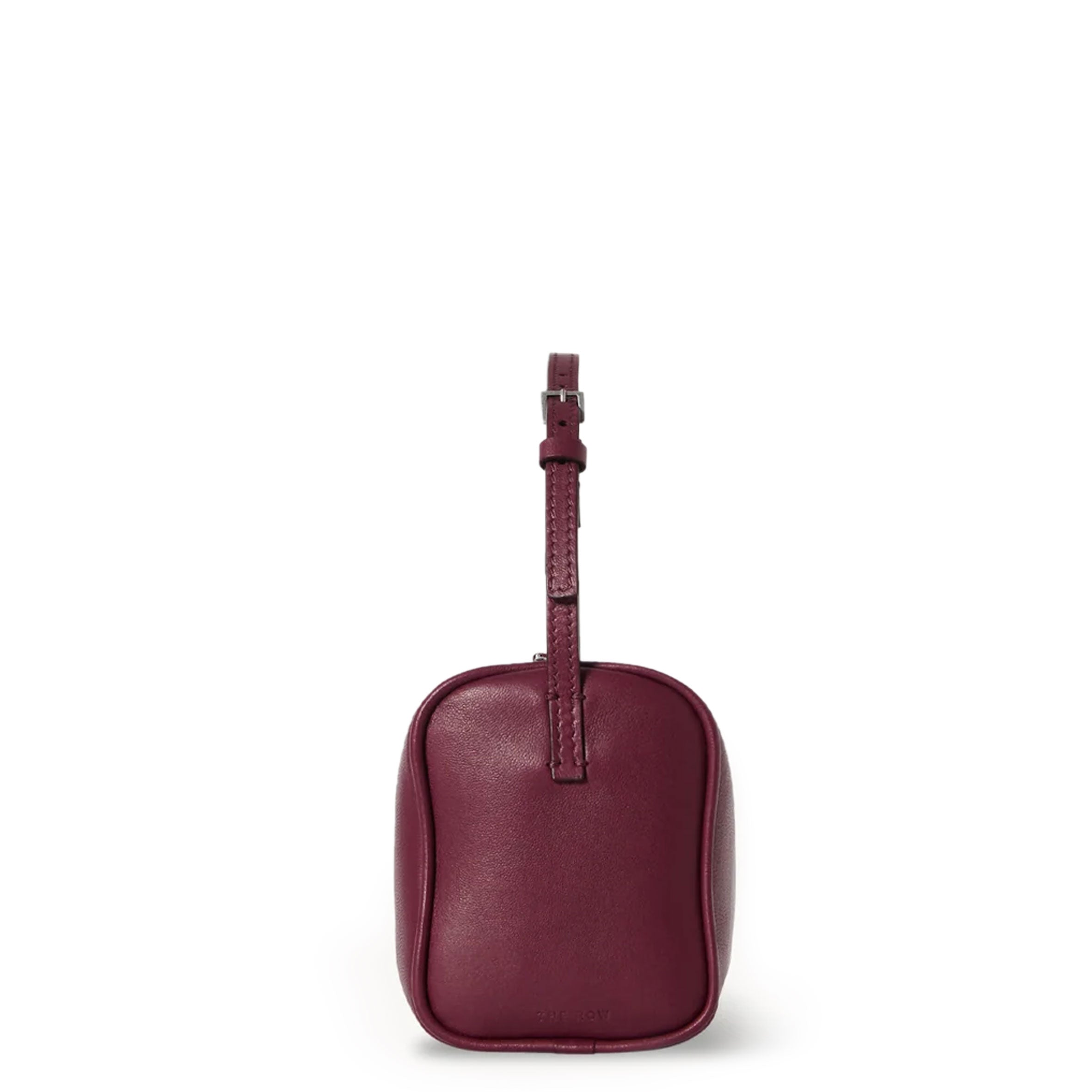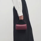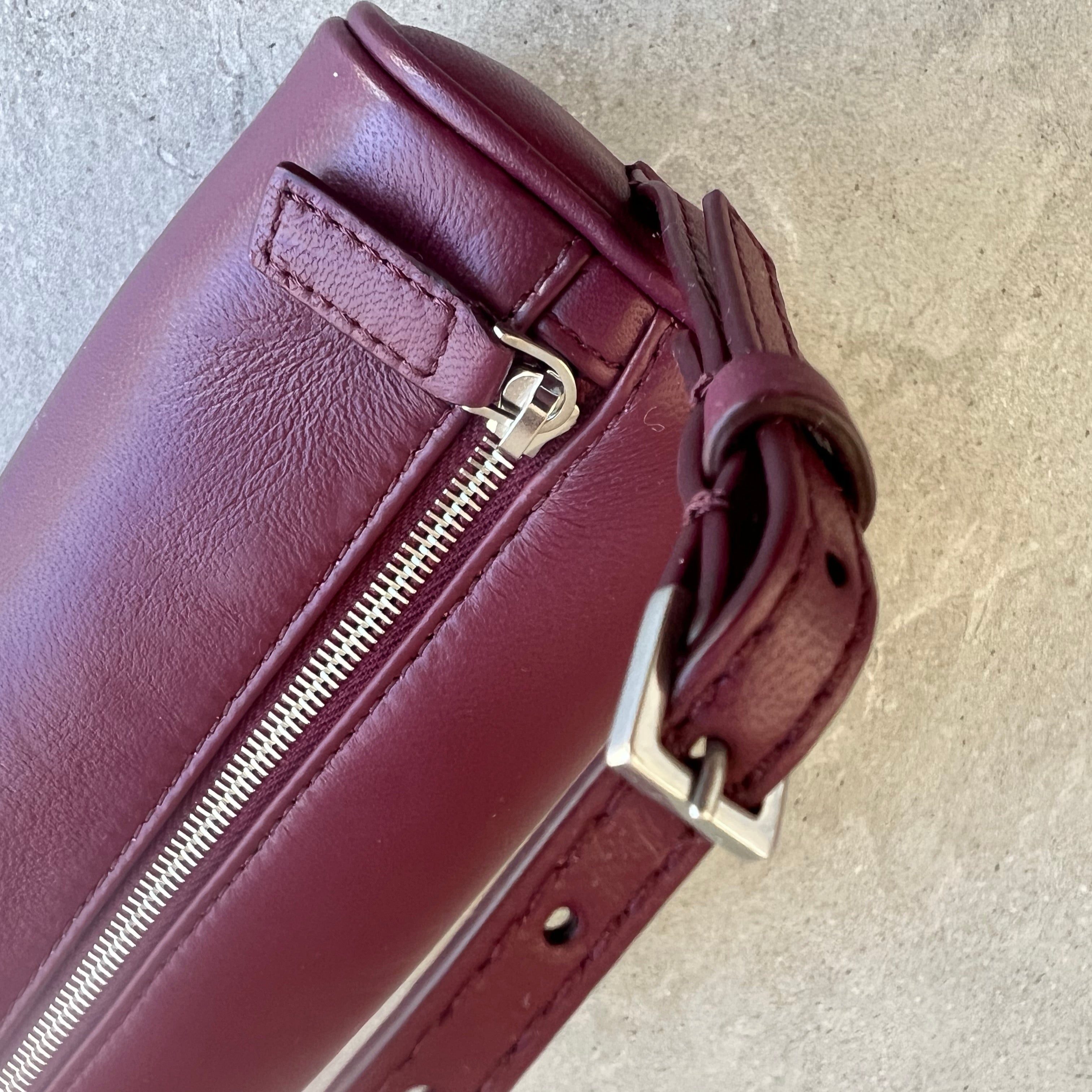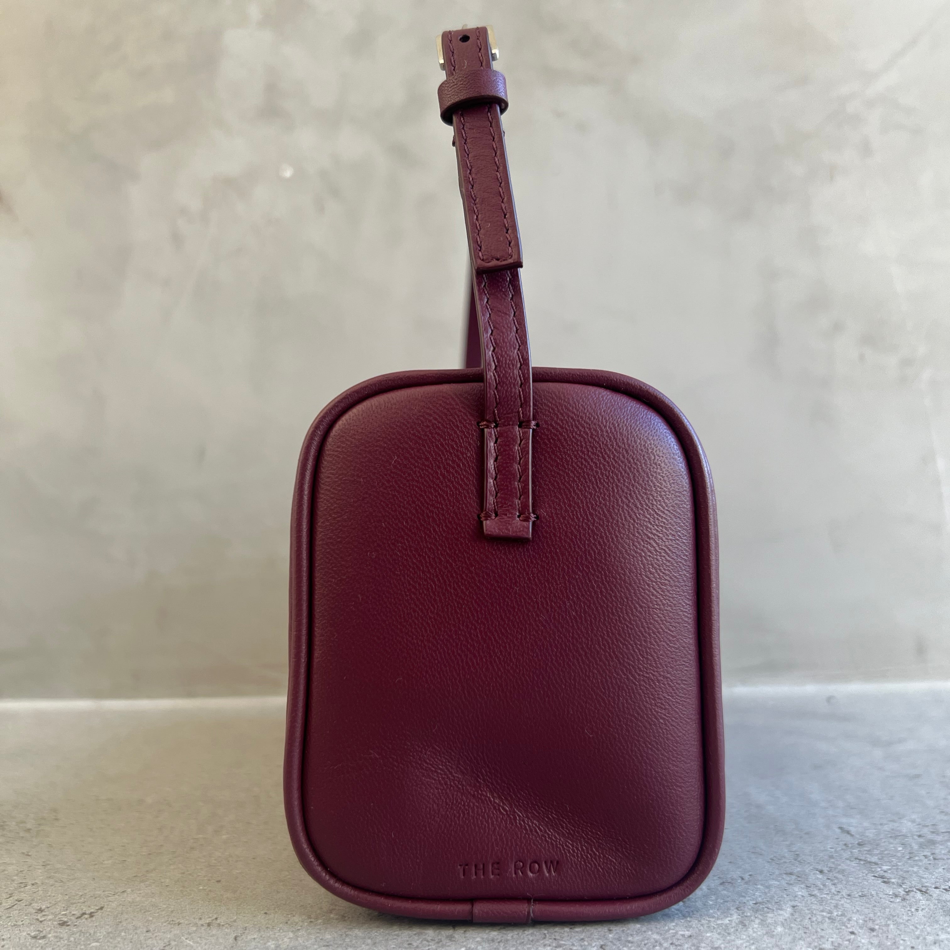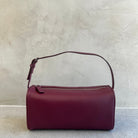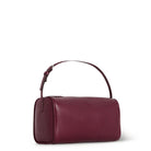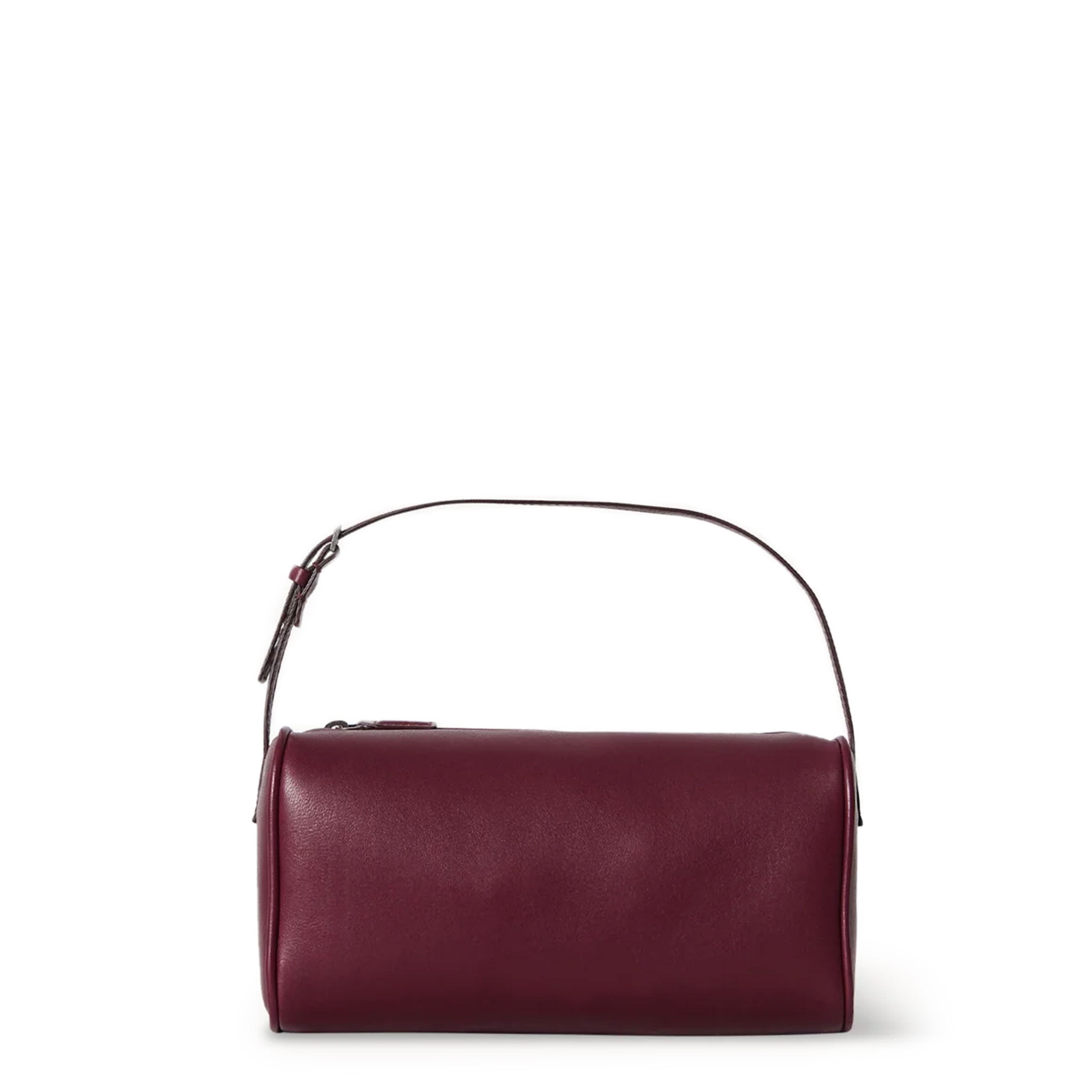 Top handle bag in buttery lambskin leather with softly rounded edges, leather piping, and adjustable slim leather strap.