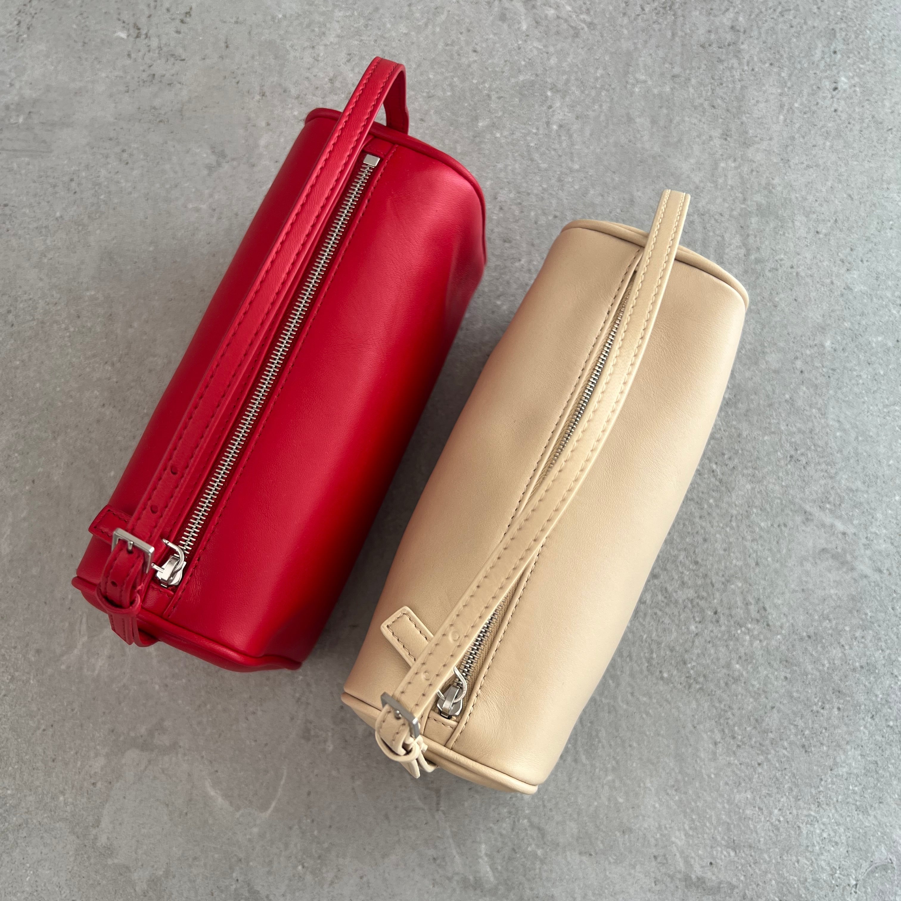 Top-handle bag in natural milled grained calfskin leather with softly rounded edges, leather piping and adjustable slim leather strap.