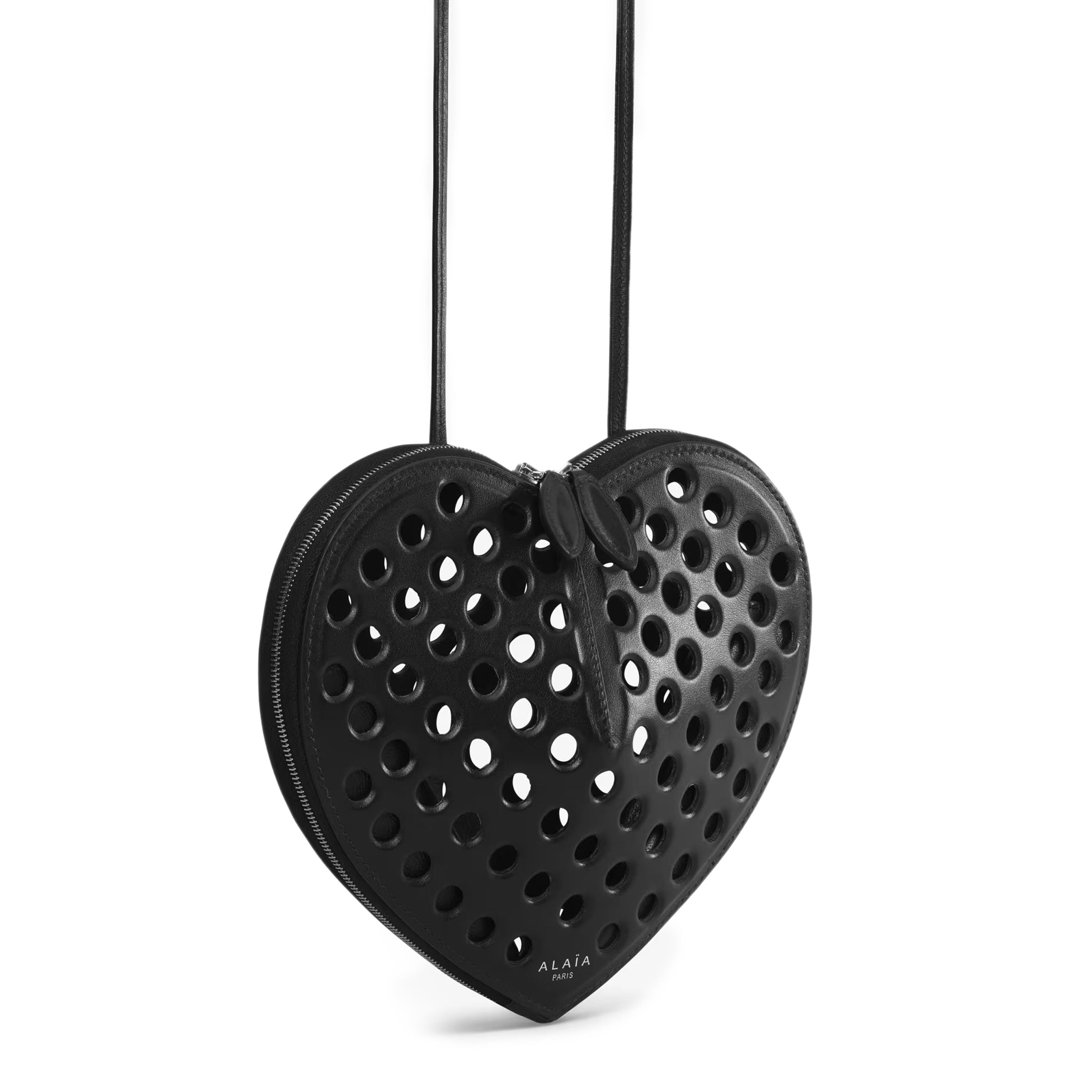 LE CŒUR BAG IN PERFORATED LAMBSKIN The iconic heart-shaped bag of the Alaïa Maison. Crafted in premium italian calfskin, featuring a zip pouch, an adjustable strap and silver logo detailing.