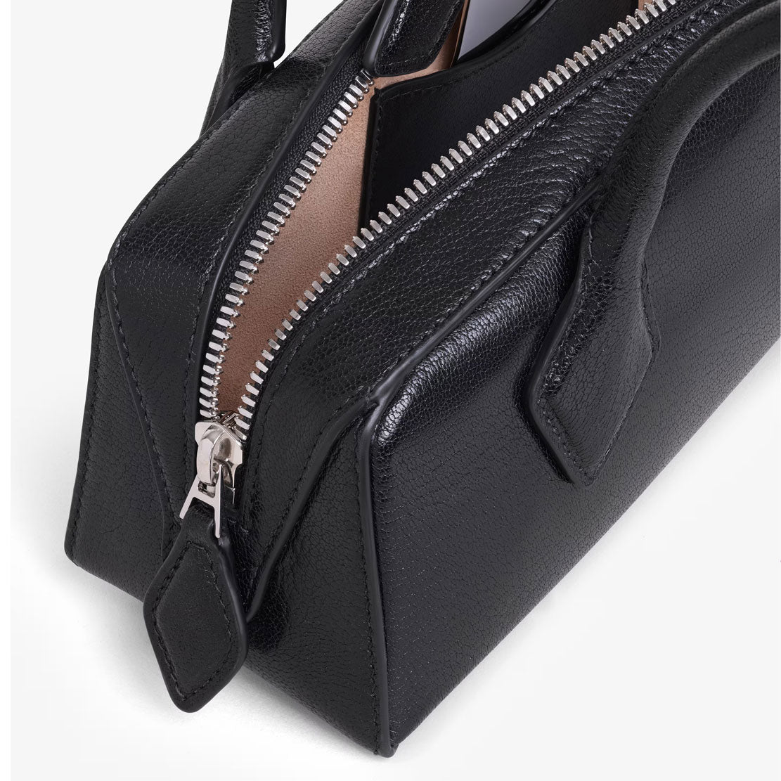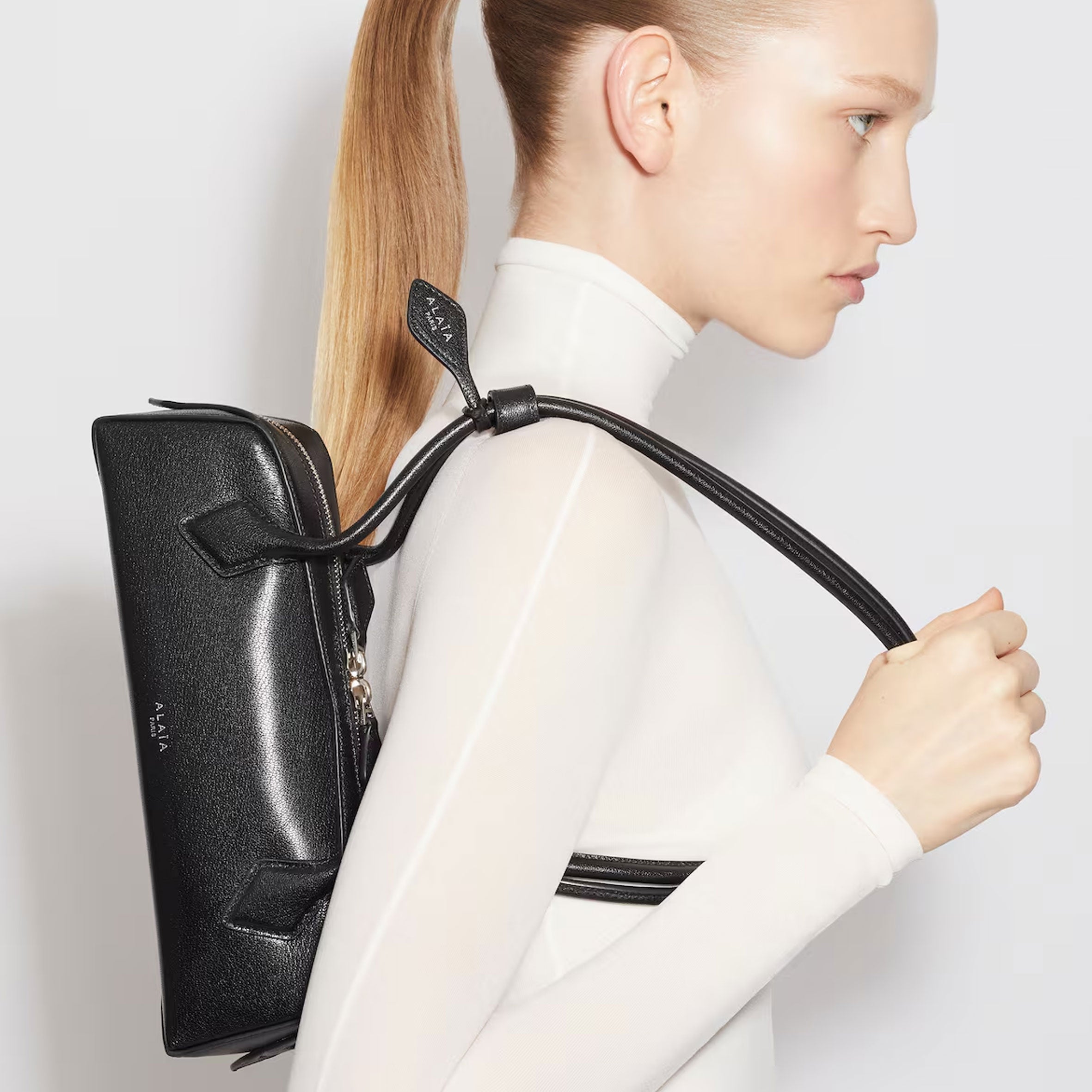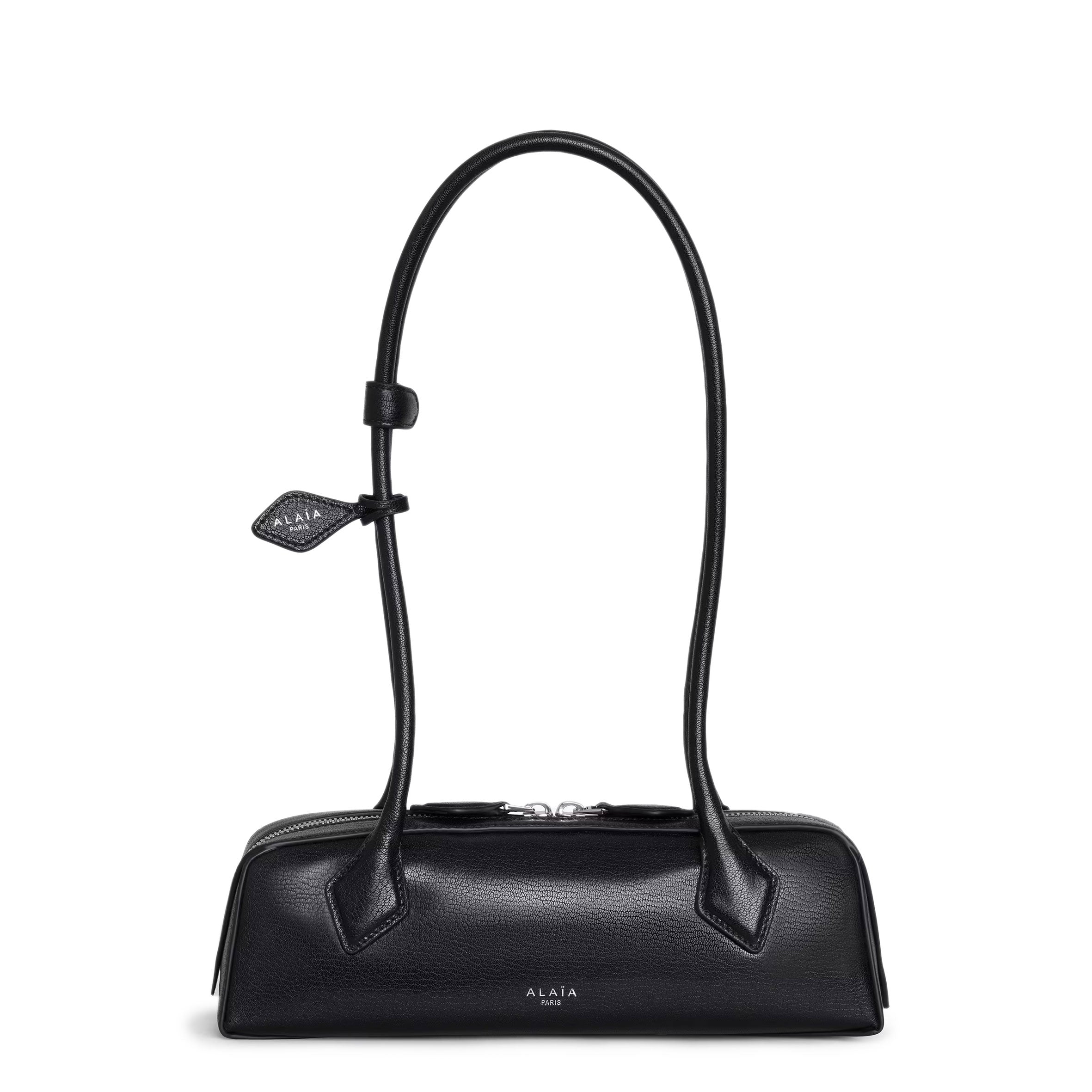 'Le Teckel' (or "Dachshund" in French) has an elongated body made from structured leather with luggage-inspired top handles and a moniker-stamped hangtag. Features a double zip closure and a small mirror.