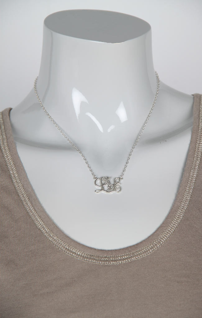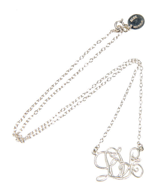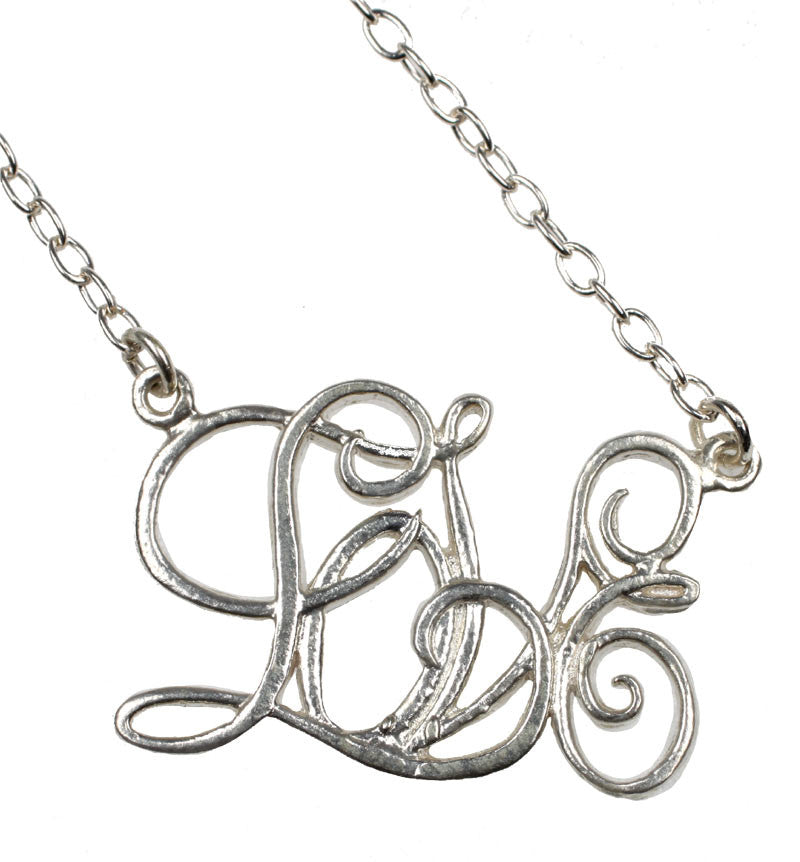 Written in an ornate, scroll script in Sterling silver with designer-stamped tag. Lobster clasp fastening.