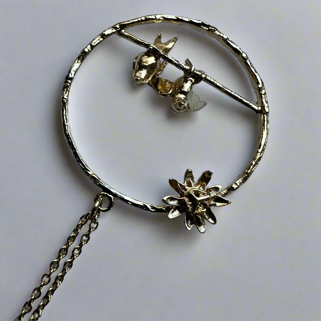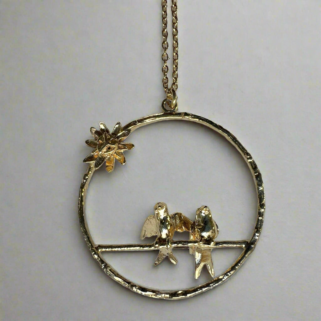 Alex Monroe's Mr & Mrs Bird Loop necklace offers a delicate touch of romance with two gold birds perch within a loop. Alex Monroe Jewellery is inspired by nature and handcrafted in their London Workshop.