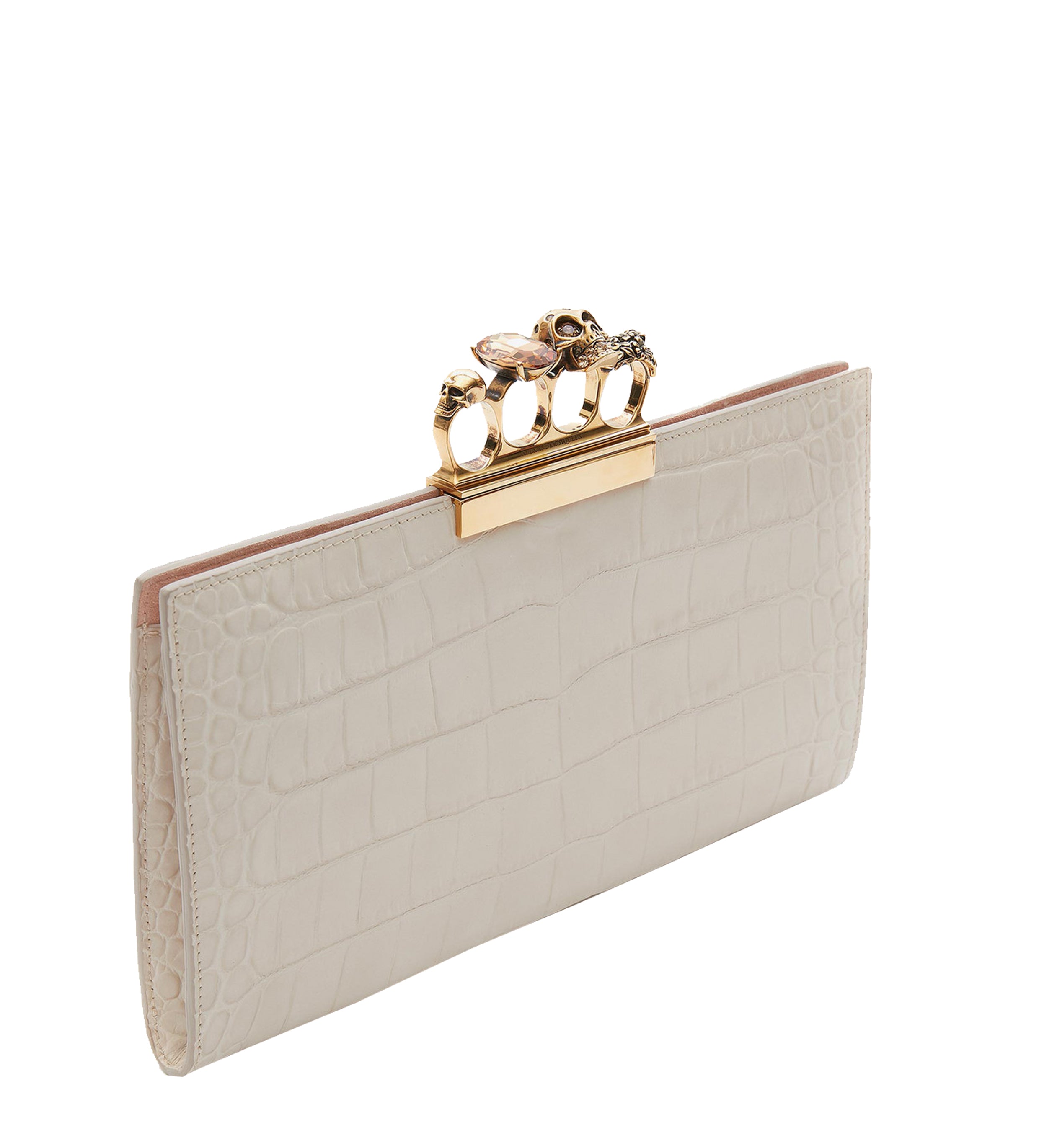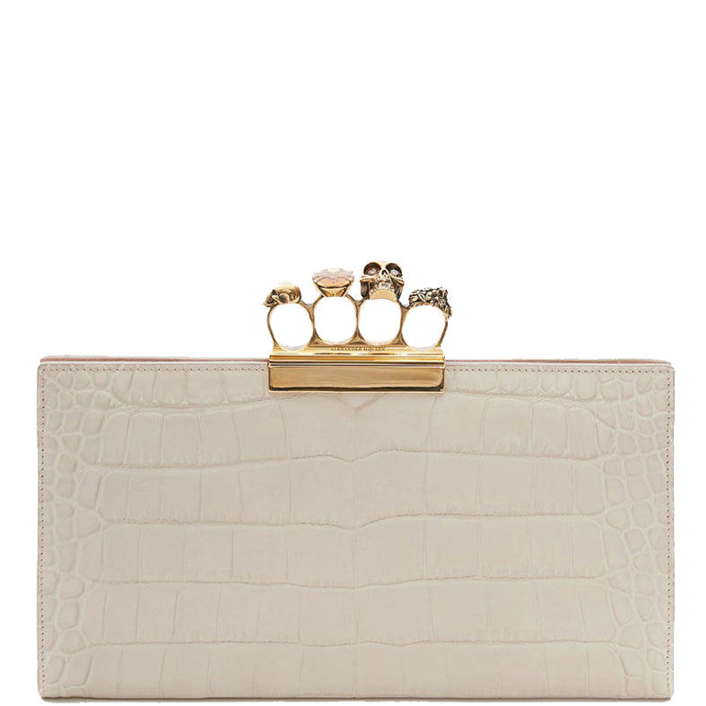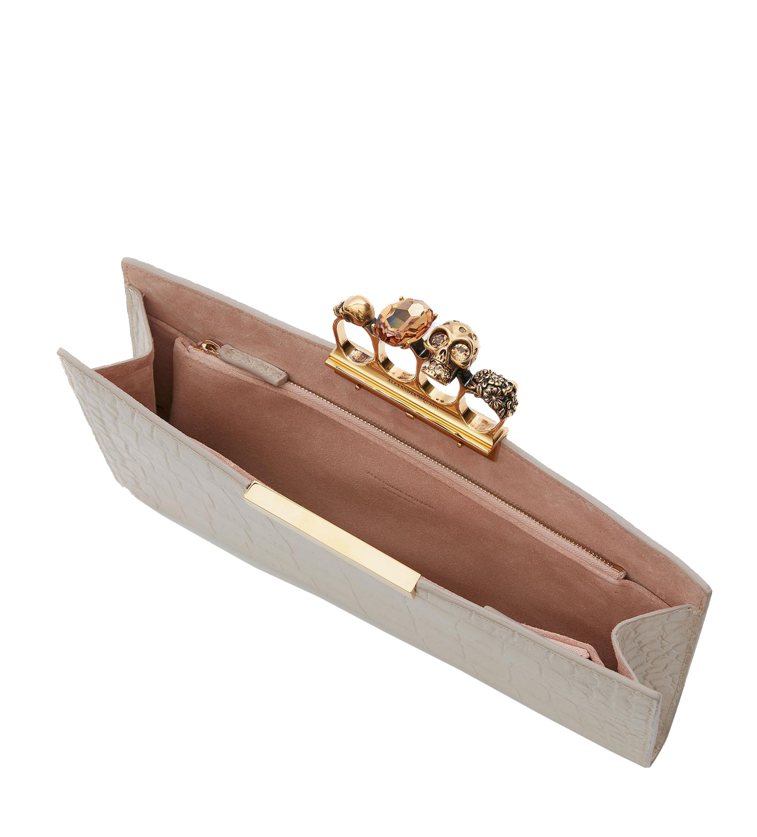 Alexander McQueen croc embossed calf leather Knuckle Flat clutch. Gold-tone skull clasp set with Swarovski crystals. Main interior compartment features two generous zip pockets and is lined in blush suede.