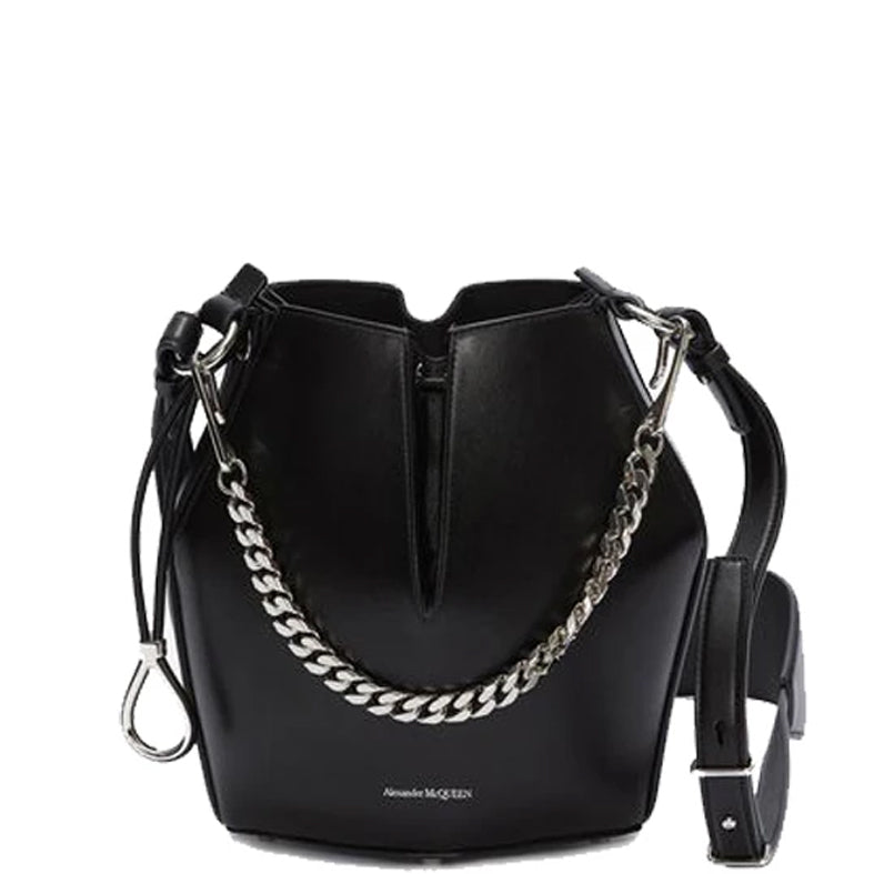 Alexander McQueen black calf leather small bucket bag inspired by signature McQueen tailoring. The bag can be worn in multiple ways: hand-held using the metal chain, with the leather strap on the shoulder or across the body. Features adjustable leather strap, one main compartment and removable zipper pouch.