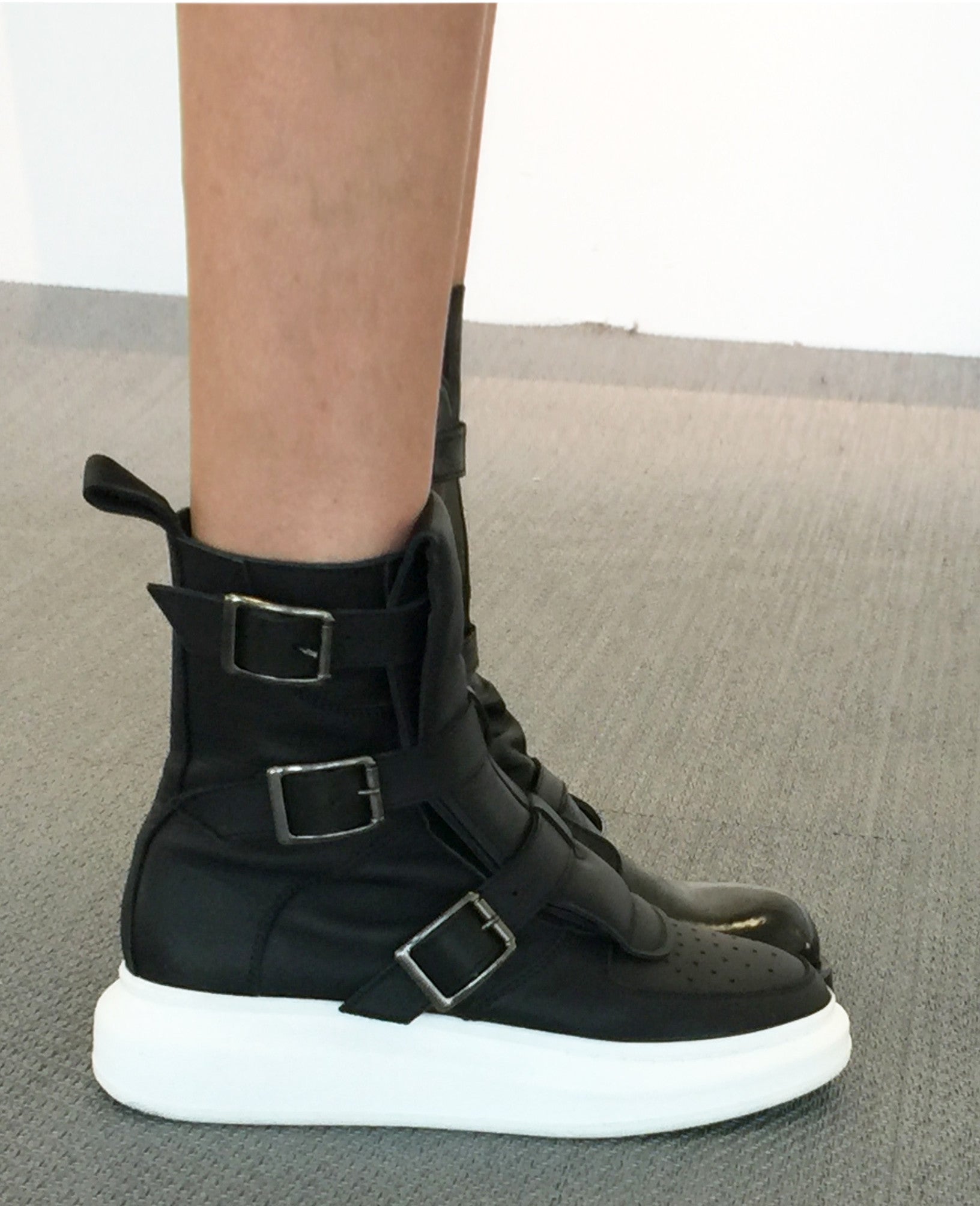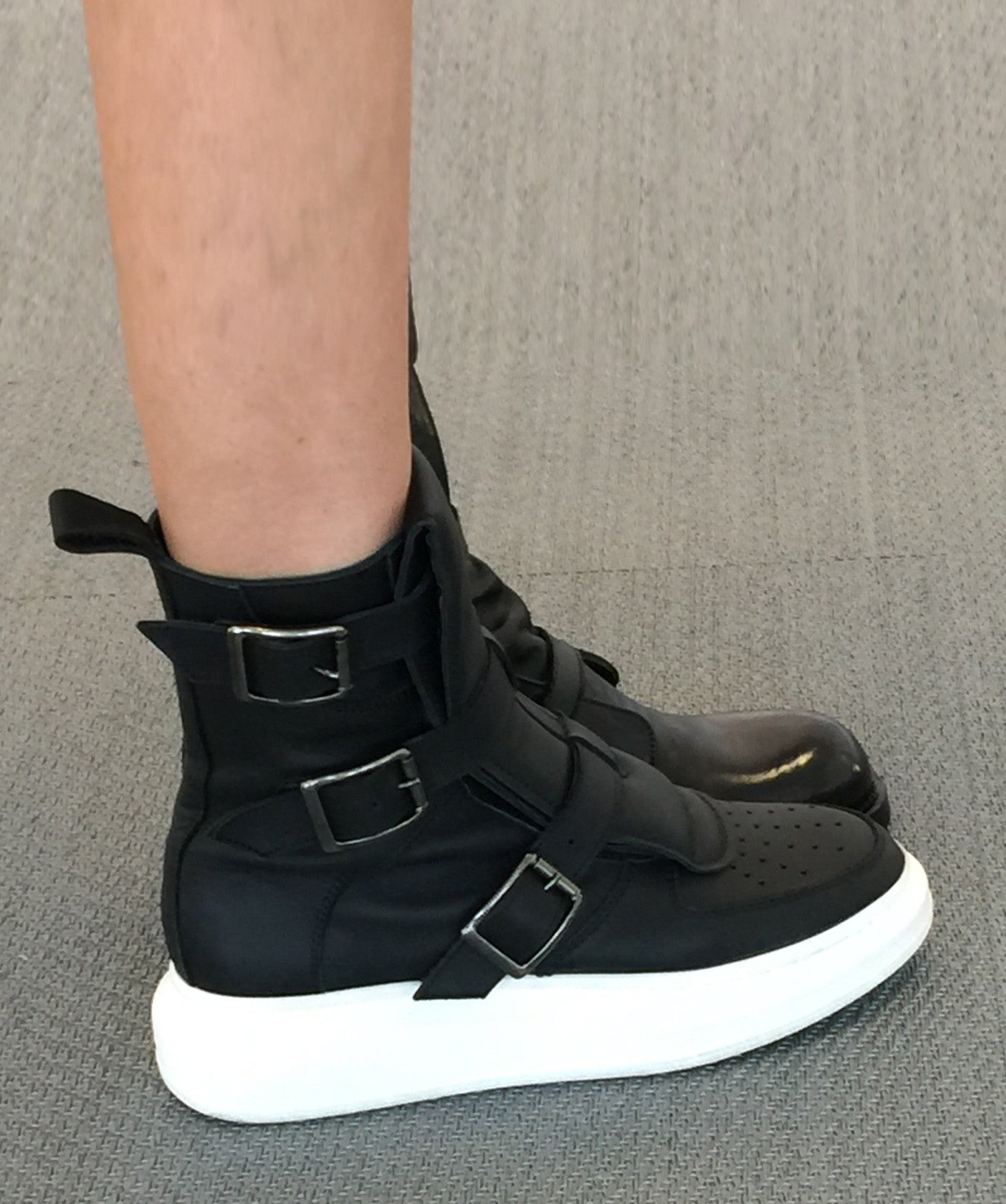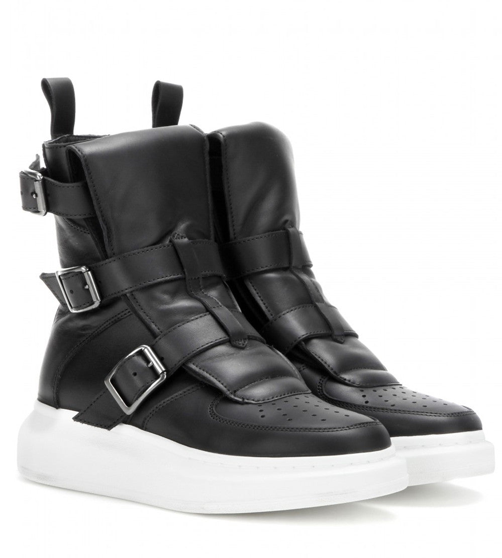 Black leather hi-top sneakers featuring Alexander McQueen's signature chunky exaggerated-sole rubber outsole. Pull tab fastening to the side, multi side buckle fastenings, a round toe, a side zip fastening.