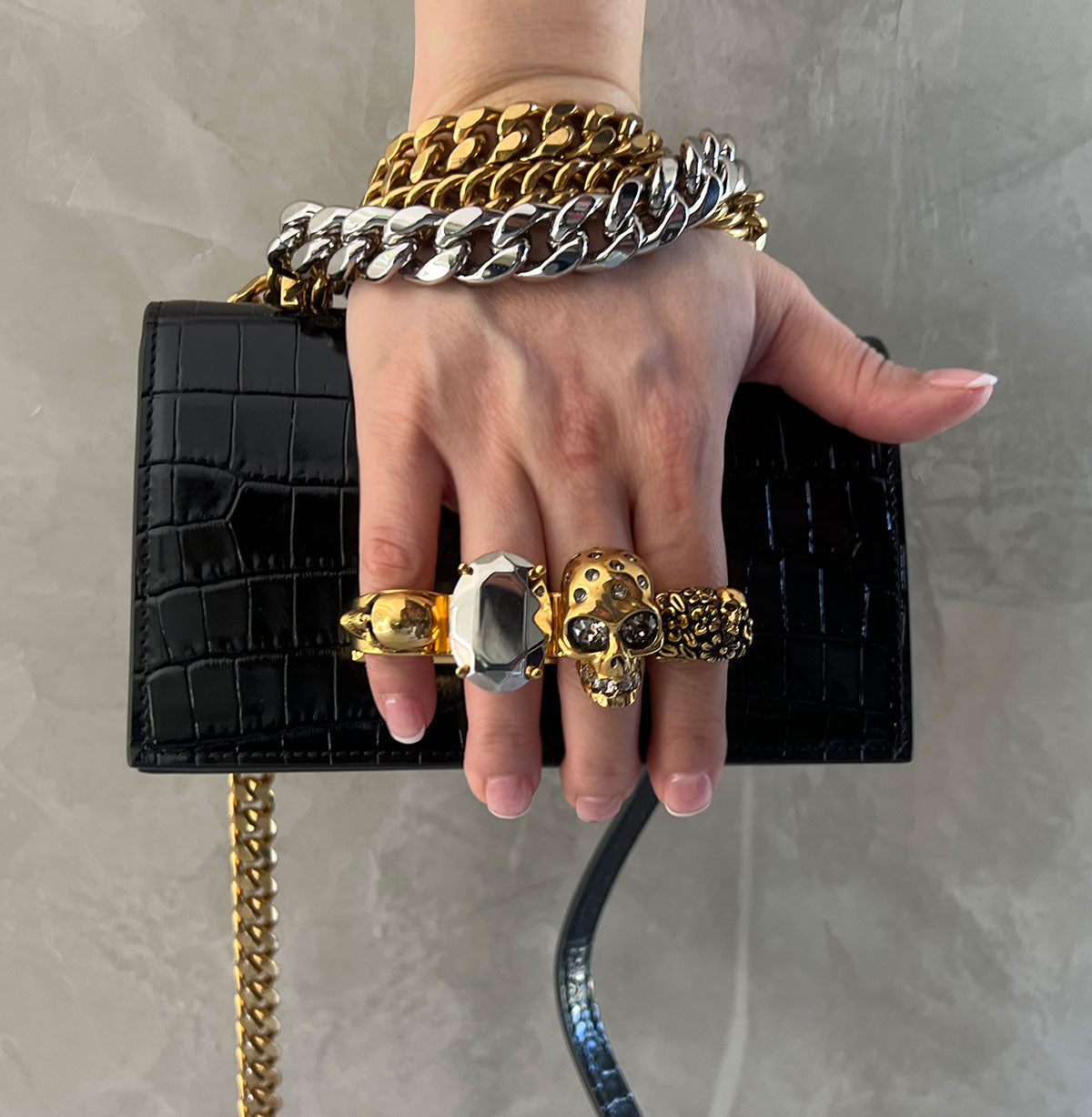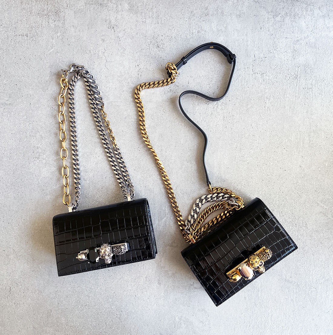 Shiny soft black embossed croc calf leather Mini Jewelled Satchel featuring silver and gold-finished chain details with adjustable leather section. This bag can be worn in multiple ways: carry it in your hand using the ring handle or by doubling up the strap. Alternatively, wear it over the shoulder or across the body using the leather and chain strap.