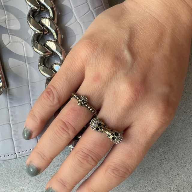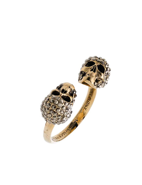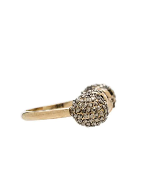 Alexander McQueen gold tone ring with Swarovski crystal embelished carved skull detailing. Logo engraved on inside of band.
