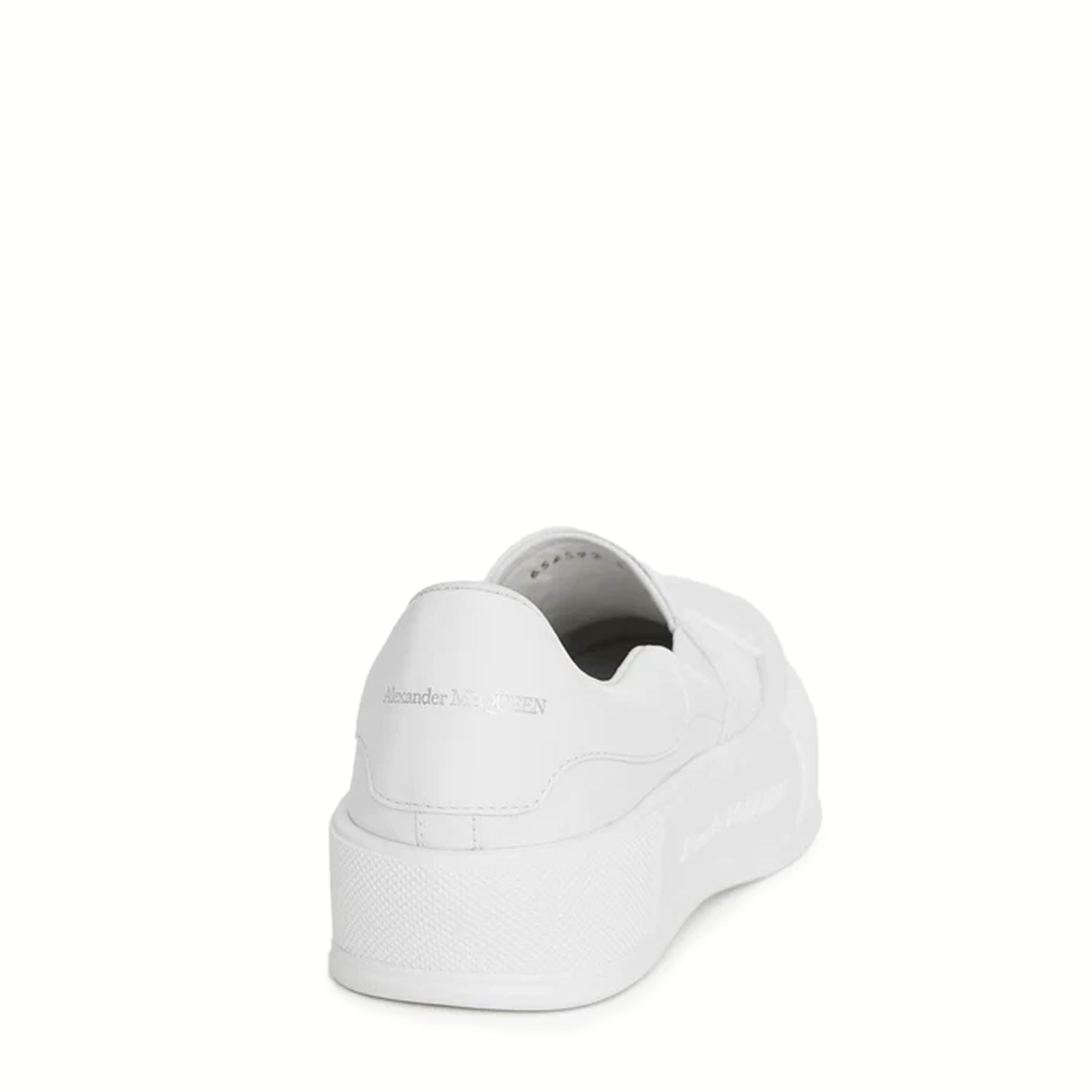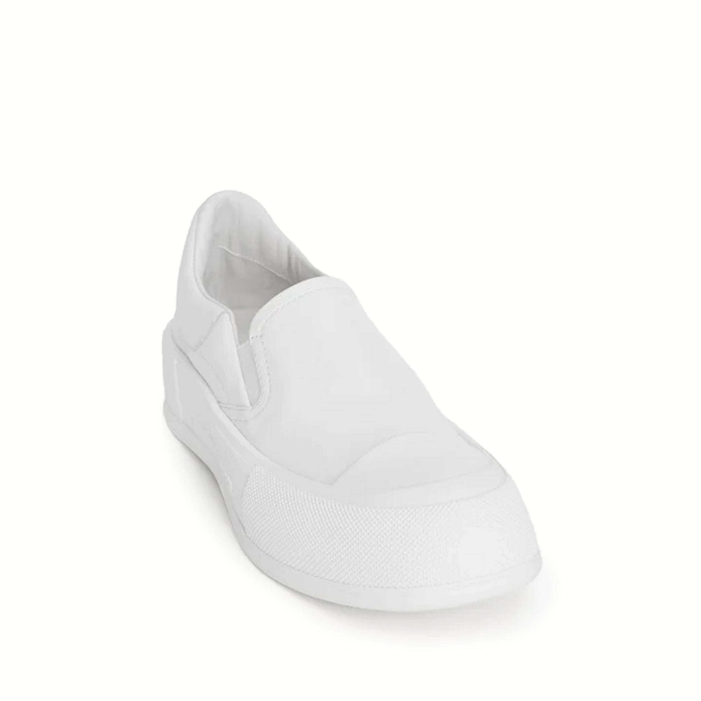 White nappa slip-on Deck plimsoll with a thick oversized rubber sole. The plimsoll is detailed with a rubber wrap sole and tonal Alexander McQueen signature, finished with a signature heel counter. Round toe shape silhouette details rubber toe cap.