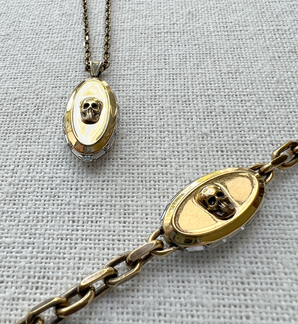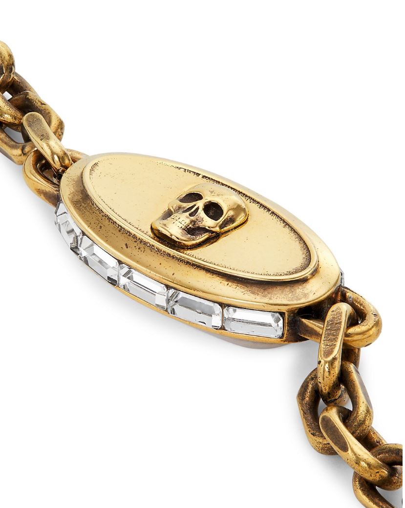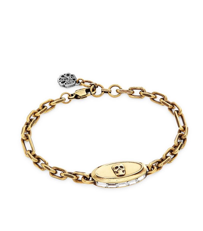Alexander McQueen double signet bracelet is crafted of gold-tone brass with an antique finish. This edgy piece features a skull-embossed pendant with a crystal baguette border on a bold chain and lobster clasp.