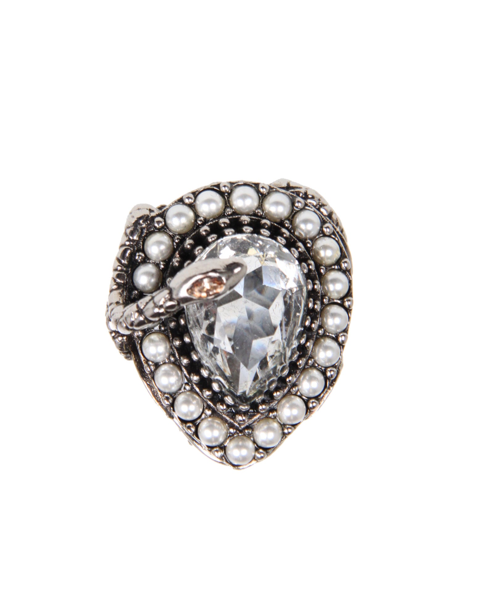 Alexander McQueen antique silver-finished drop ring with snake detailing. The drop ring is made of a Swarovski crystal, surrounded by faux pearls.