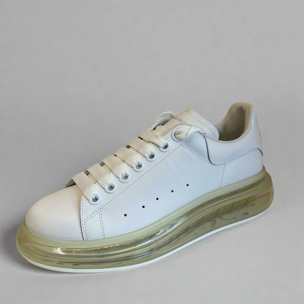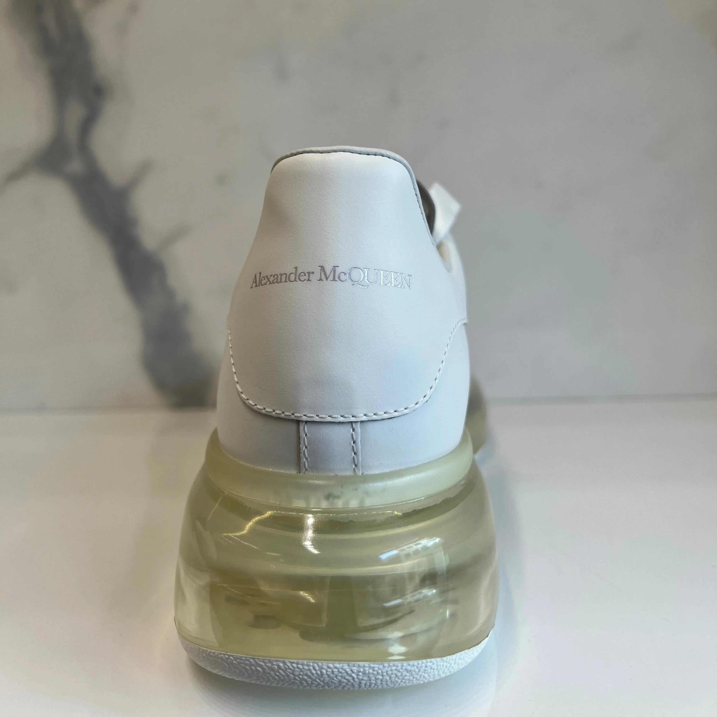 White smooth calf leather lace up sneaker with rounded toe. The sneaker features large flat laces and is finished with an Alexander McQueen signature on the heel counter, leather tongue and white tab. Oversized clear sole.