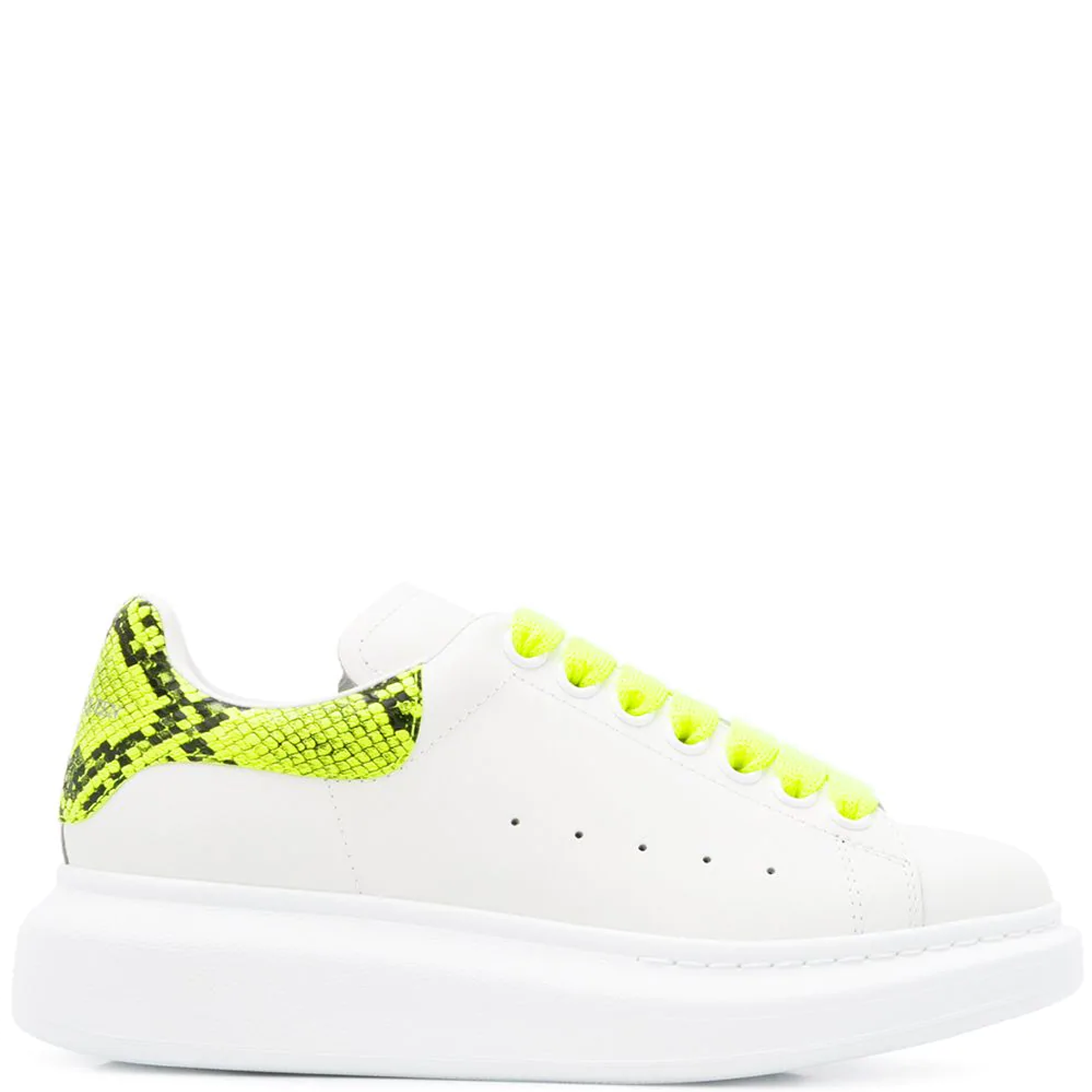 White smooth calf leather lace up sneaker with rounded toe and trimmed with cobra neon yellow heel detail. The sneaker features large flat laces and is finished with an Alexander McQueen signature on the heel counter and leather tongue. Oversized rubber sole.